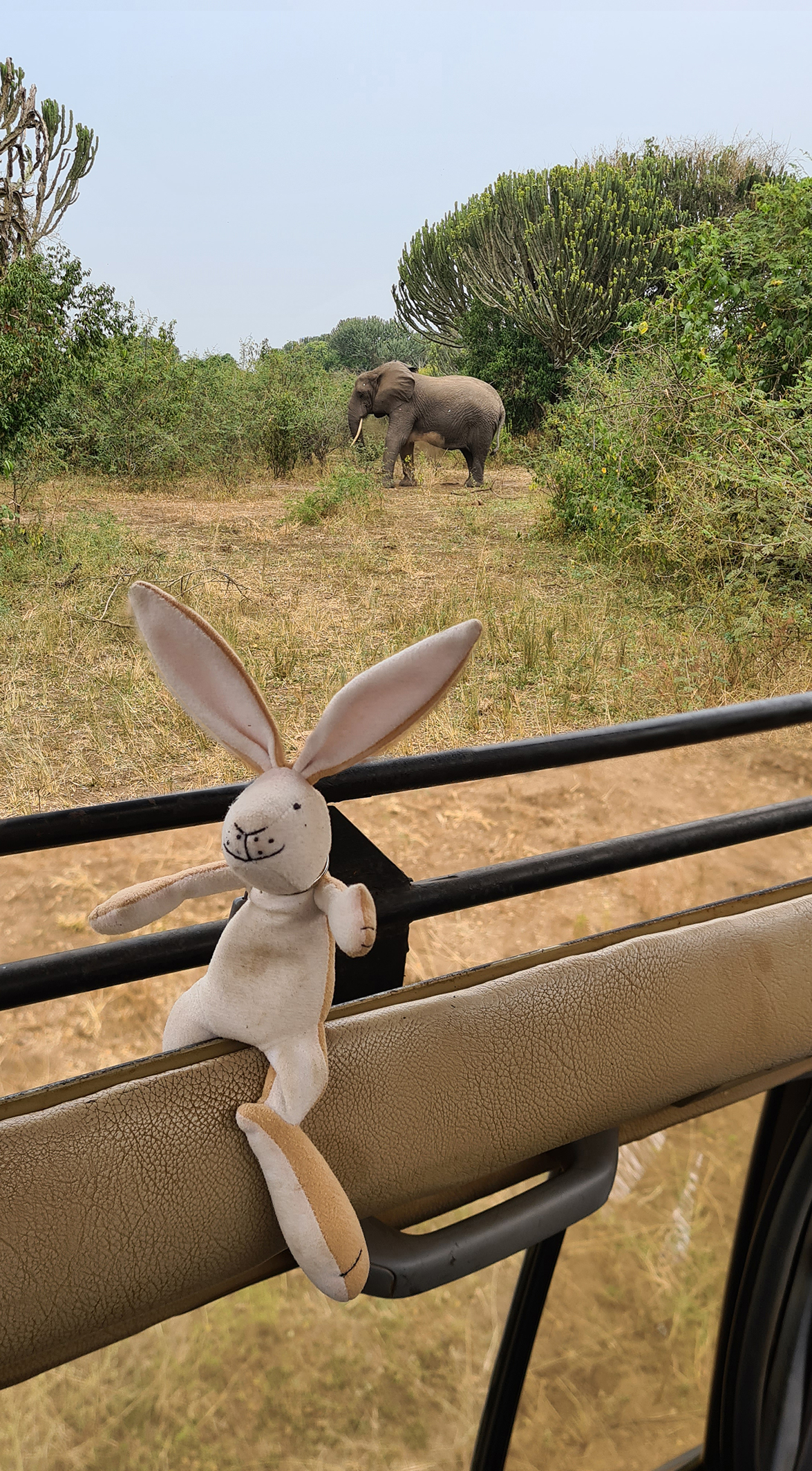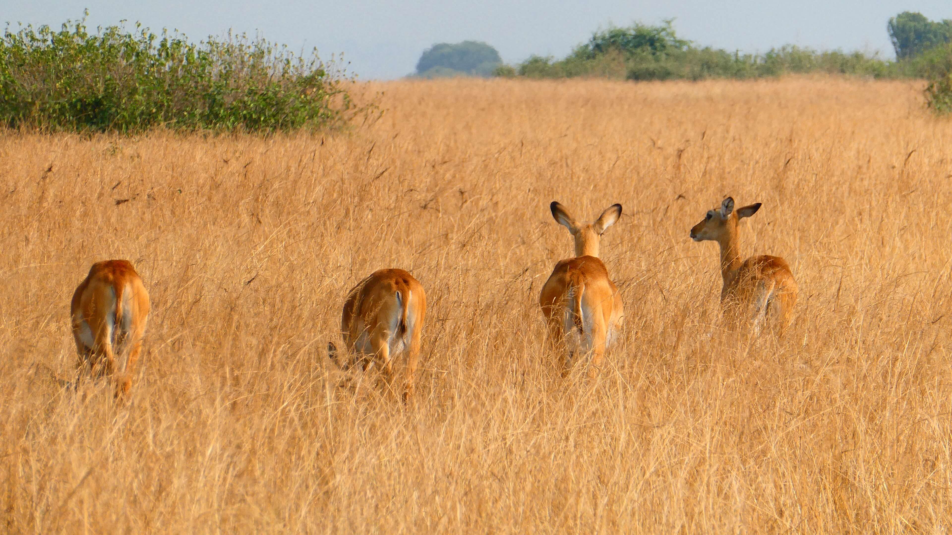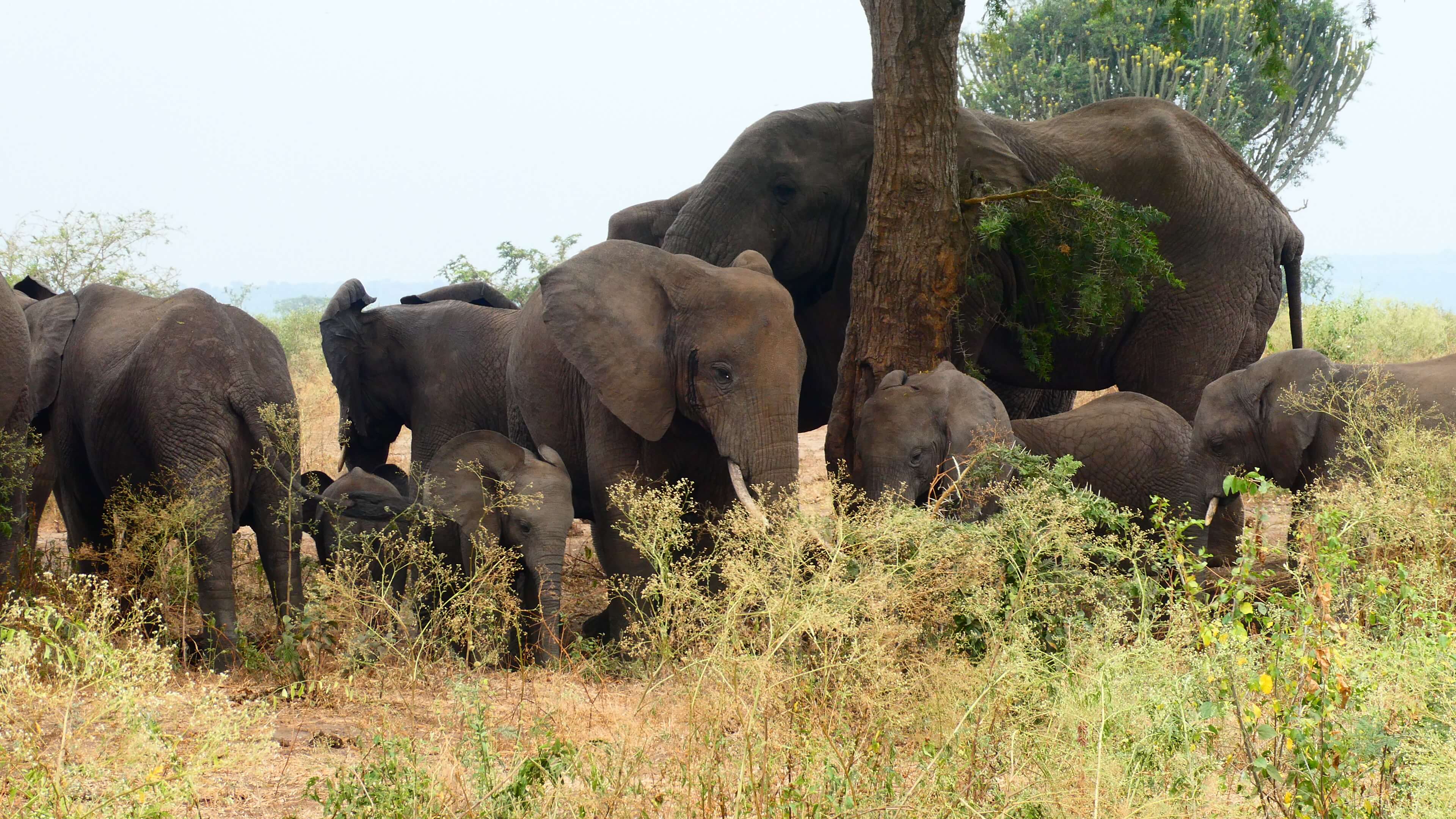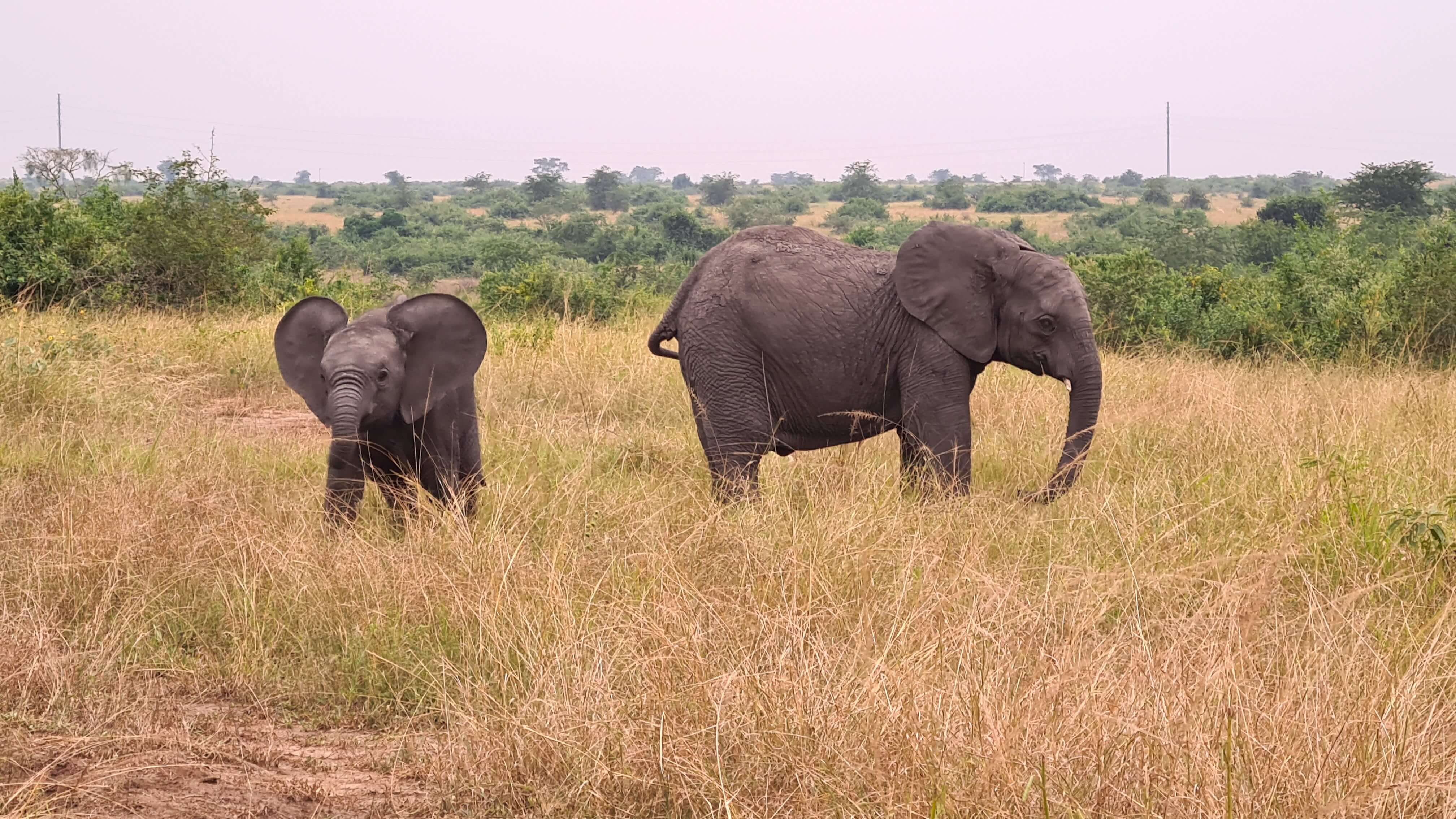 Unsere Sichtungen in den Kasenyi Plains bleiben verglichen mit denen im Murchison Falls National Park überschaubar. Selbst die Kobs machen sich rar. Dann erspäht Matthias doch tatsächlich einen Leoparden im hohen Gras … nur der Rücken und der erhobene Schwanz schauen raus – ganz kurz, bevor er im nächsten Busch verschwindet. Wir fahren nochmal ein Stück retour, in der Hoffnung, dass er auf der anderen Seite wieder rauskommt, um eine der Antilopen ins Visier zu nehmen, können ihn aber leider nicht mehr entdecken. Aber die Elefantenherde direkt am Wegrand ist dann doch unübersehbar.