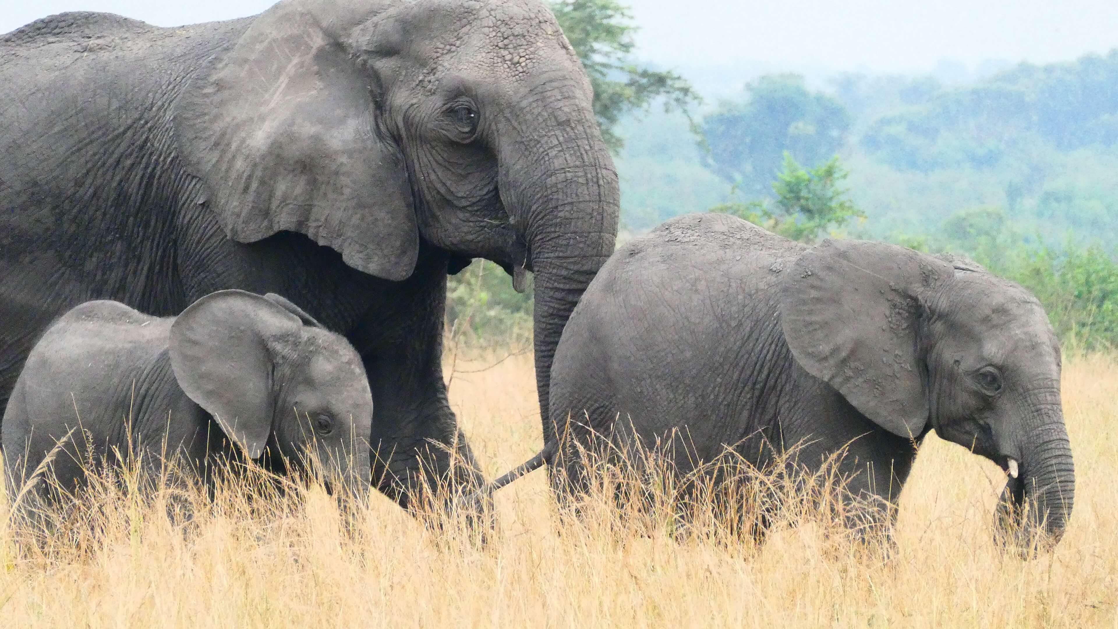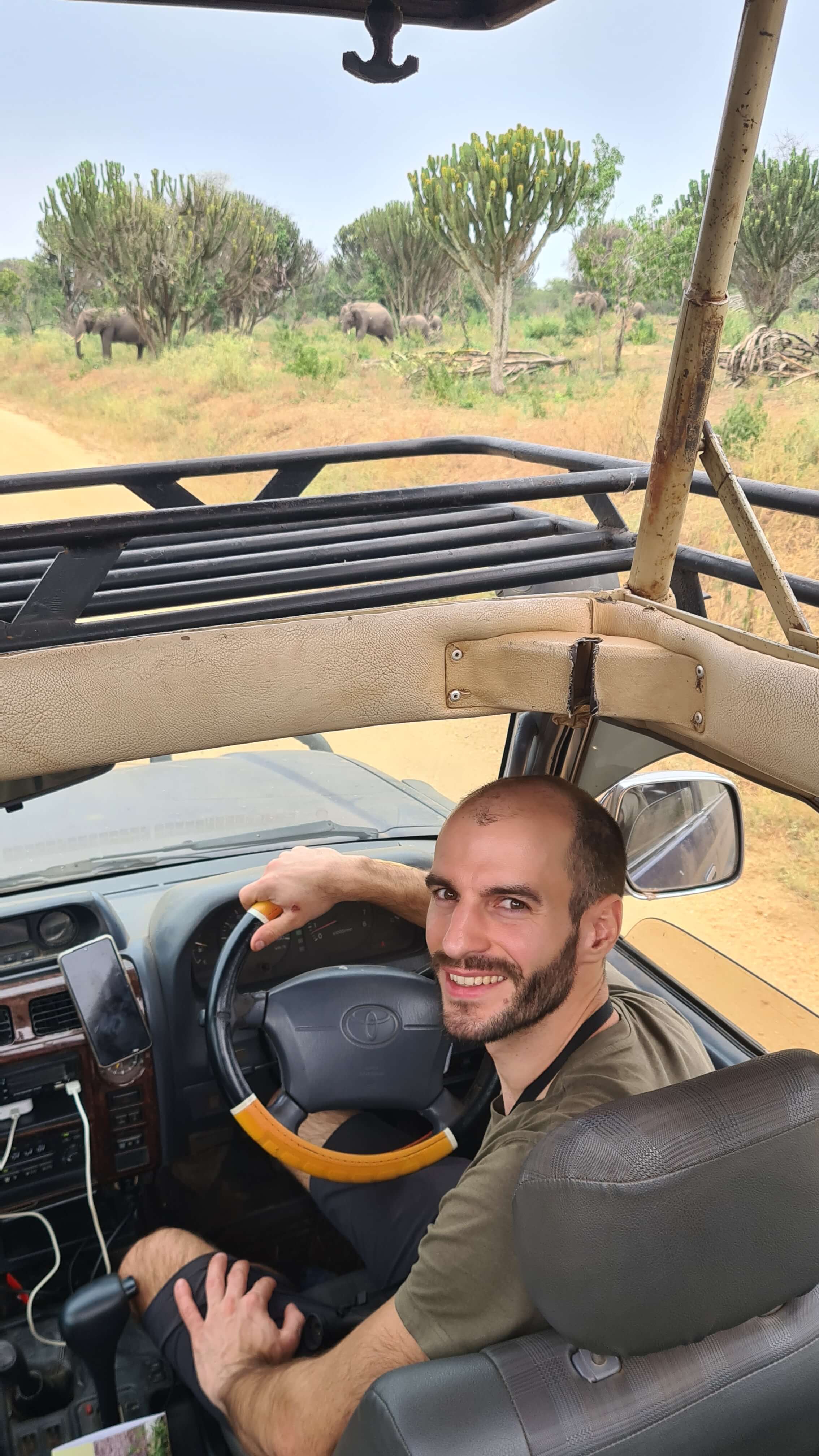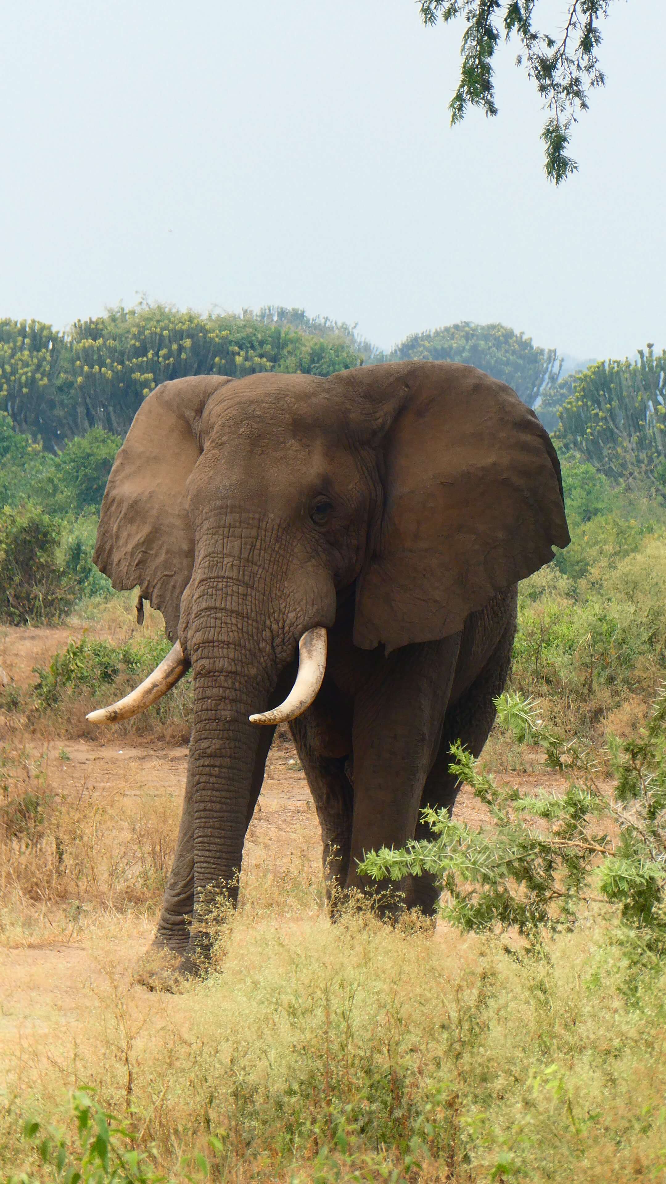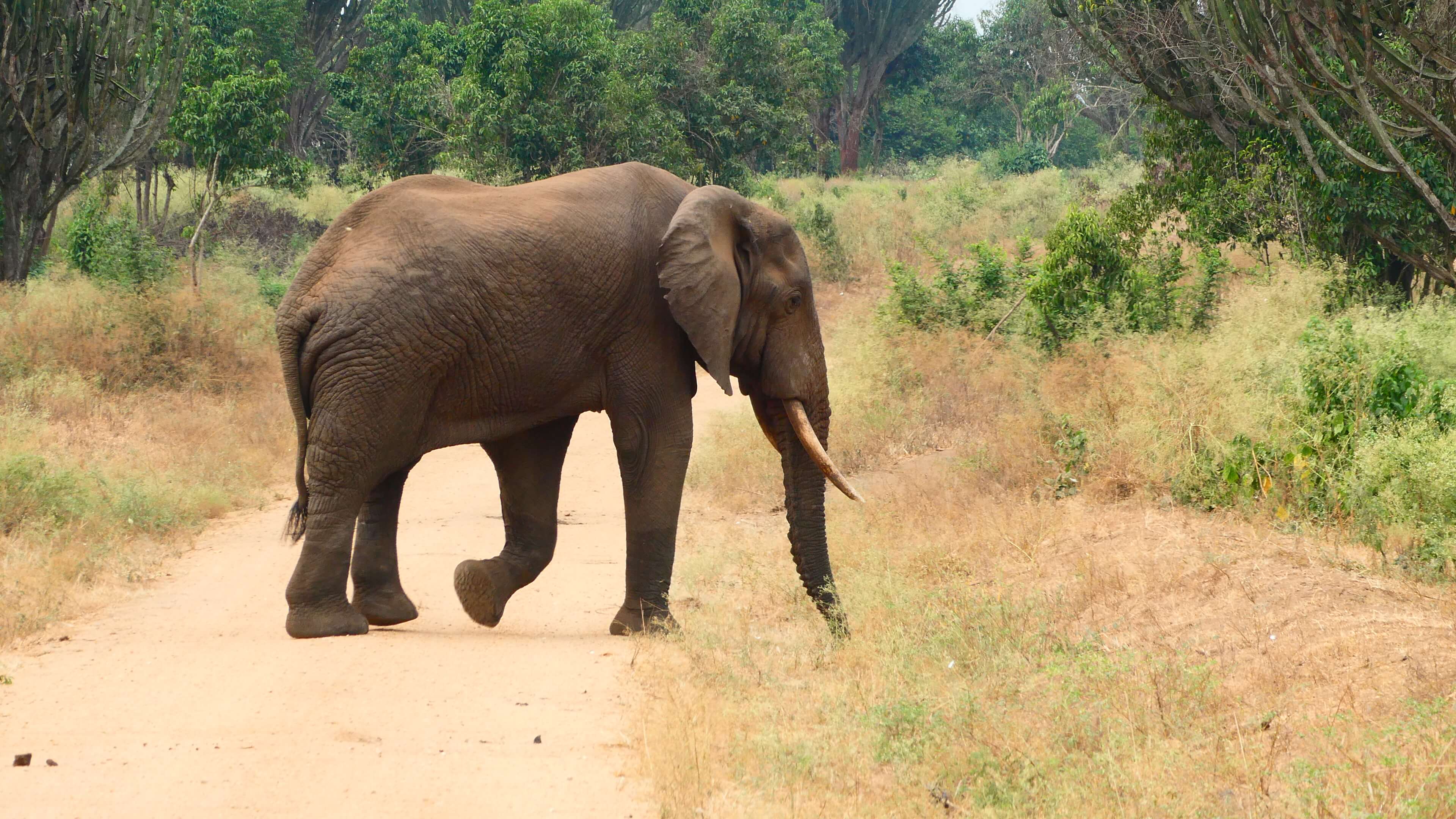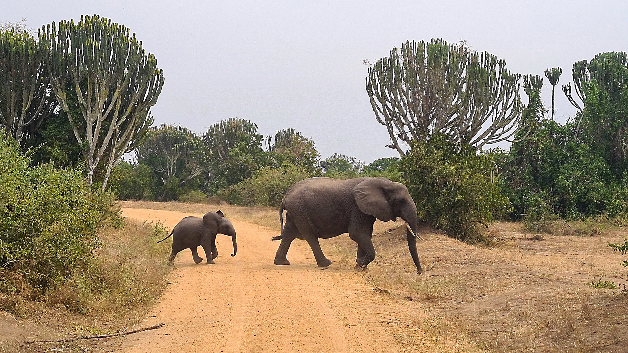 Unsere Sichtungen in den Kasenyi Plains bleiben verglichen mit denen im Murchison Falls National Park überschaubar. Selbst die Kobs machen sich rar. Dann erspäht Matthias doch tatsächlich einen Leoparden im hohen Gras … nur der Rücken und der erhobene Schwanz schauen raus – ganz kurz, bevor er im nächsten Busch verschwindet. Wir fahren nochmal ein Stück retour, in der Hoffnung, dass er auf der anderen Seite wieder rauskommt, um eine der Antilopen ins Visier zu nehmen, können ihn aber leider nicht mehr entdecken. Aber die Elefantenherde direkt am Wegrand ist dann doch unübersehbar.