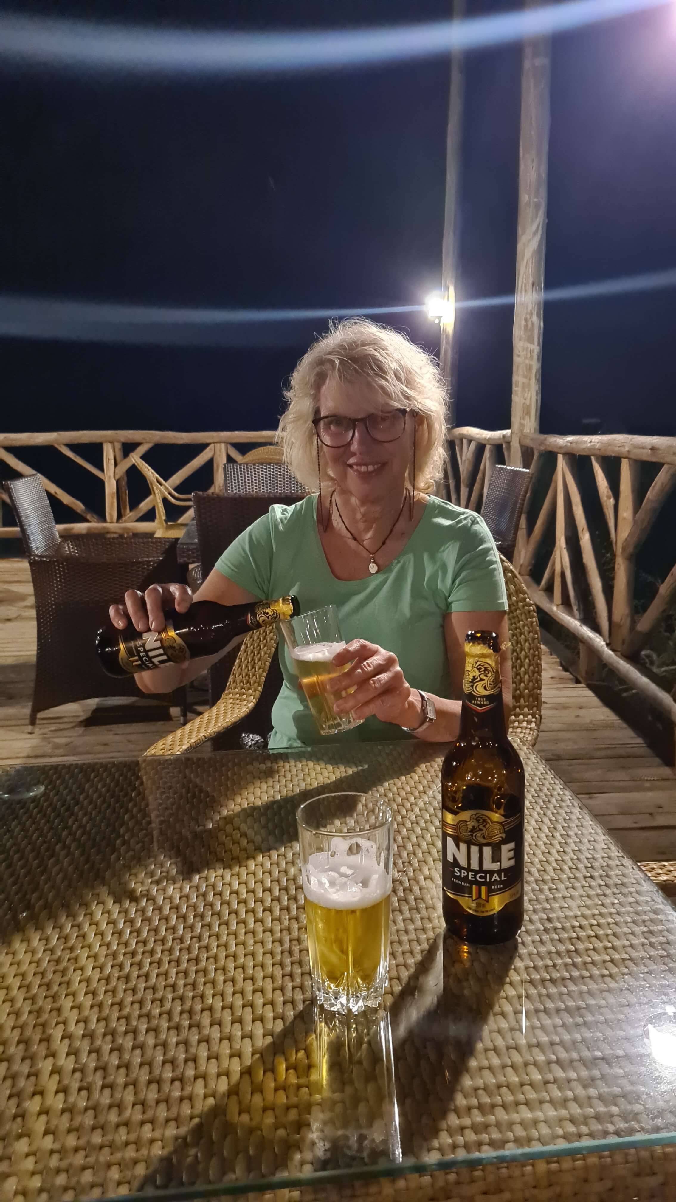 Als alles für die Nacht hergerichtet ist, lassen wir uns von einem der Security-Burschen auf einen NILE-Absacker in die Lodge bringen. Herrlich kann man hoch oben auf der Ständerterrasse sitzen und den Abend genießen.