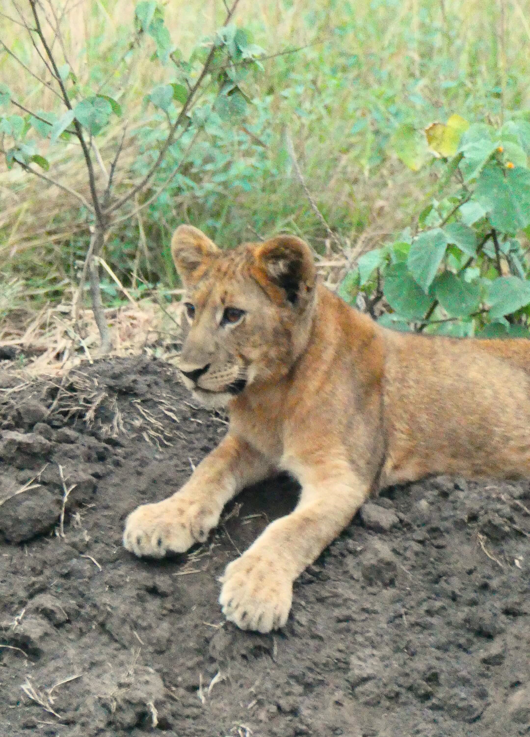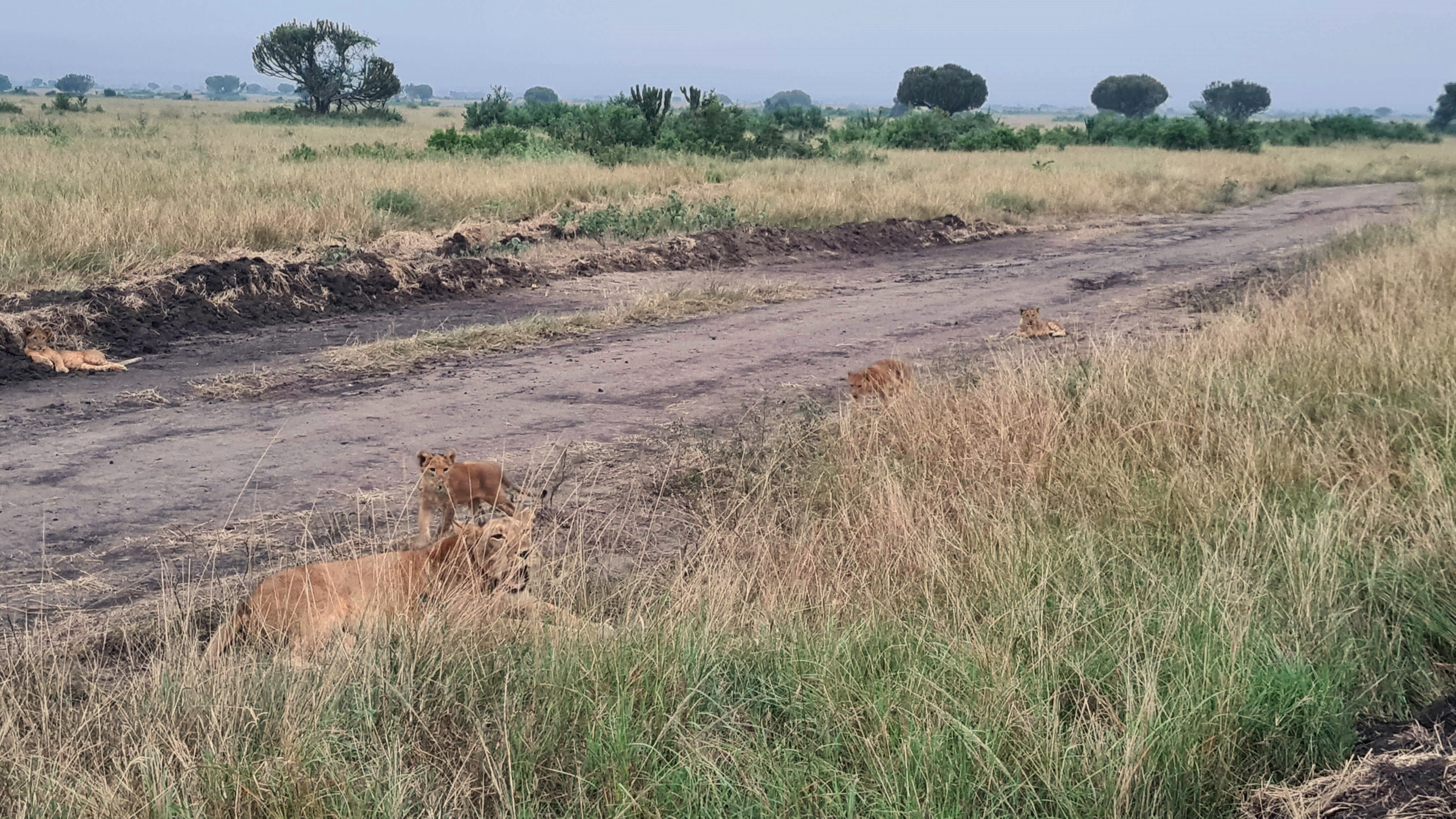 Wir mampfen unser Frühstück noch im Dunkeln in der Engiri Lodge, bevor wir mit unserem Allrad nach Katunguru runterholpern, um Ronaldo an der dortigen Tankstelle um 6.30 Uhr aufzugabeln. Der erst 21 Jahre junge Guide ist uns auf Anhieb super sympathisch. Unsere späte Reservierung nimmt er gelassen, er freut sich über jeden Job und ist das frühe Aufstehen gewohnt. Und tatsächlich scheint im QENP am frühen Morgen mehr Action geboten zu sein, als am Nachmittag. Kaum sind wir entlang der Main Road in die Kasenyi Plains eingefahren, räkelt sich in der Morgendämmerung eine Löwin am Straßenrand – immer „umtobt“ von ihren vier quirligen Cubs, zwei kleinen und zwei älteren, die ständig hin und her fetzen, miteinander raufen und kaum eine Sekunde inne halten. Leider ist das Licht noch nicht optimal für Fotos und die Kleinen auch viel zu verspielt und quirlig.
