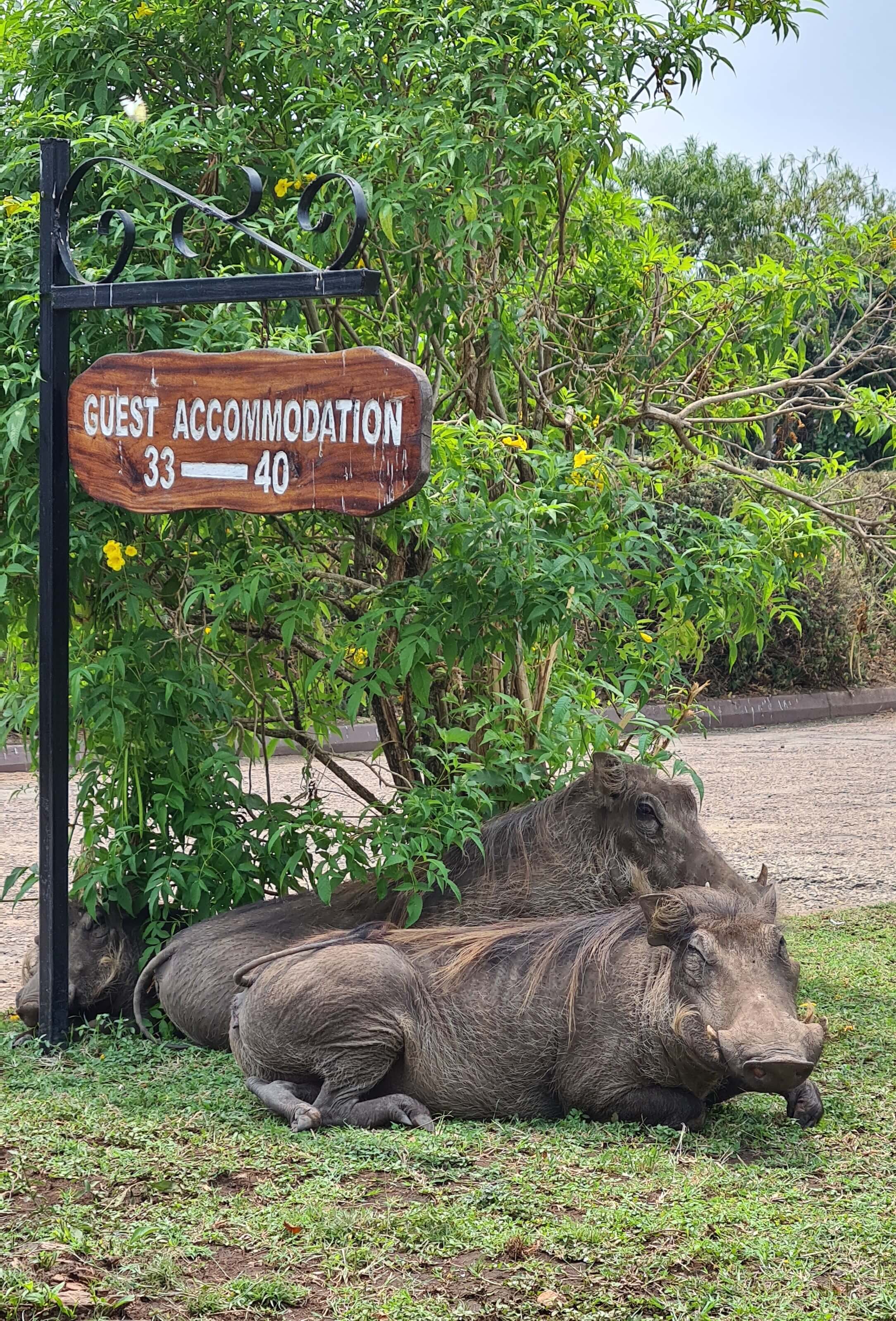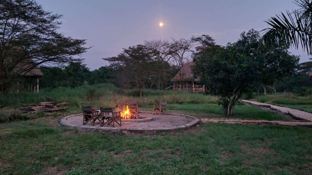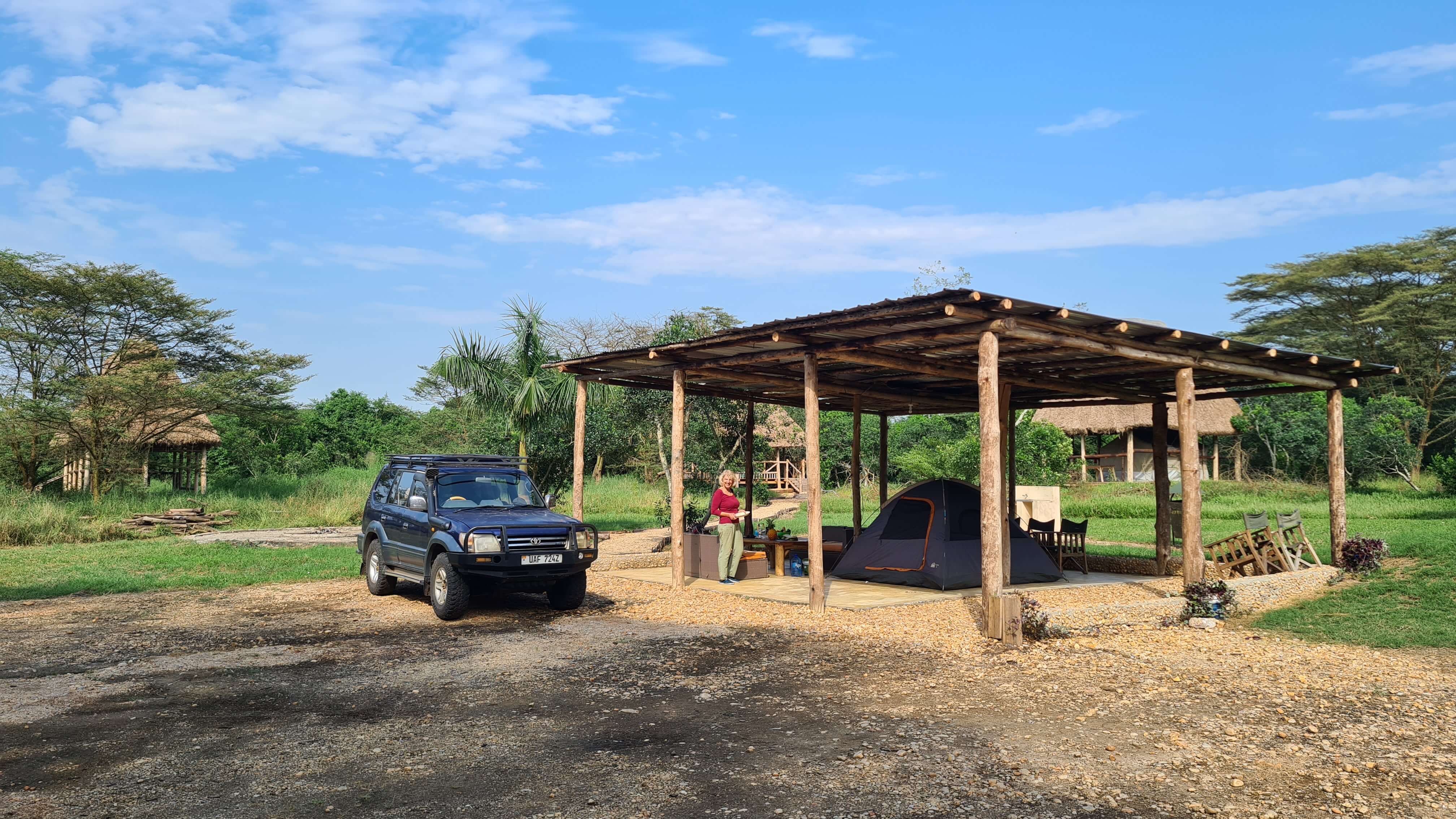 Nach vier Stunden Safari machen wir uns auf den Weg über Katunguru und die dortige Brücke über den Kazinga-Kanal zur Engiri Lodge, wo wir gegen 19 Uhr eintrudeln. Die 2,5 km lange Zufahrt zur Lodge ab der Main Road ist gelinde gesagt eine Zumutung und wieder sinnieren wir, in welcher „Absteige“ wir wohl hier landen. Aber weit gefehlt! Am Ende der Buckelpiste steht eine hübsche, gepflegte Lodge mit Campground – und sehr wenigen Gästen. Sage und schreibe acht Angestellte empfangen uns und weisen uns ein, d.h. eigentlich weist uns das „Lehrmädchen“ ein und alle anderen schauen zu, ob sie auch alles richtig macht. Wir hören, dass wir, obwohl wir hier doch relativ weit von den Ufern des Kazinga Kanals logieren, nach Einbruch der Dämmerung immer mit animalischen Begegnungen zu rechnen hätten, weshalb der Gang zum Lodge-Haupthaus fürs Dinner oder der Weg zu den Toiletten und Waschanlagen nur mit einer Security-Eskorte erlaubt ist.