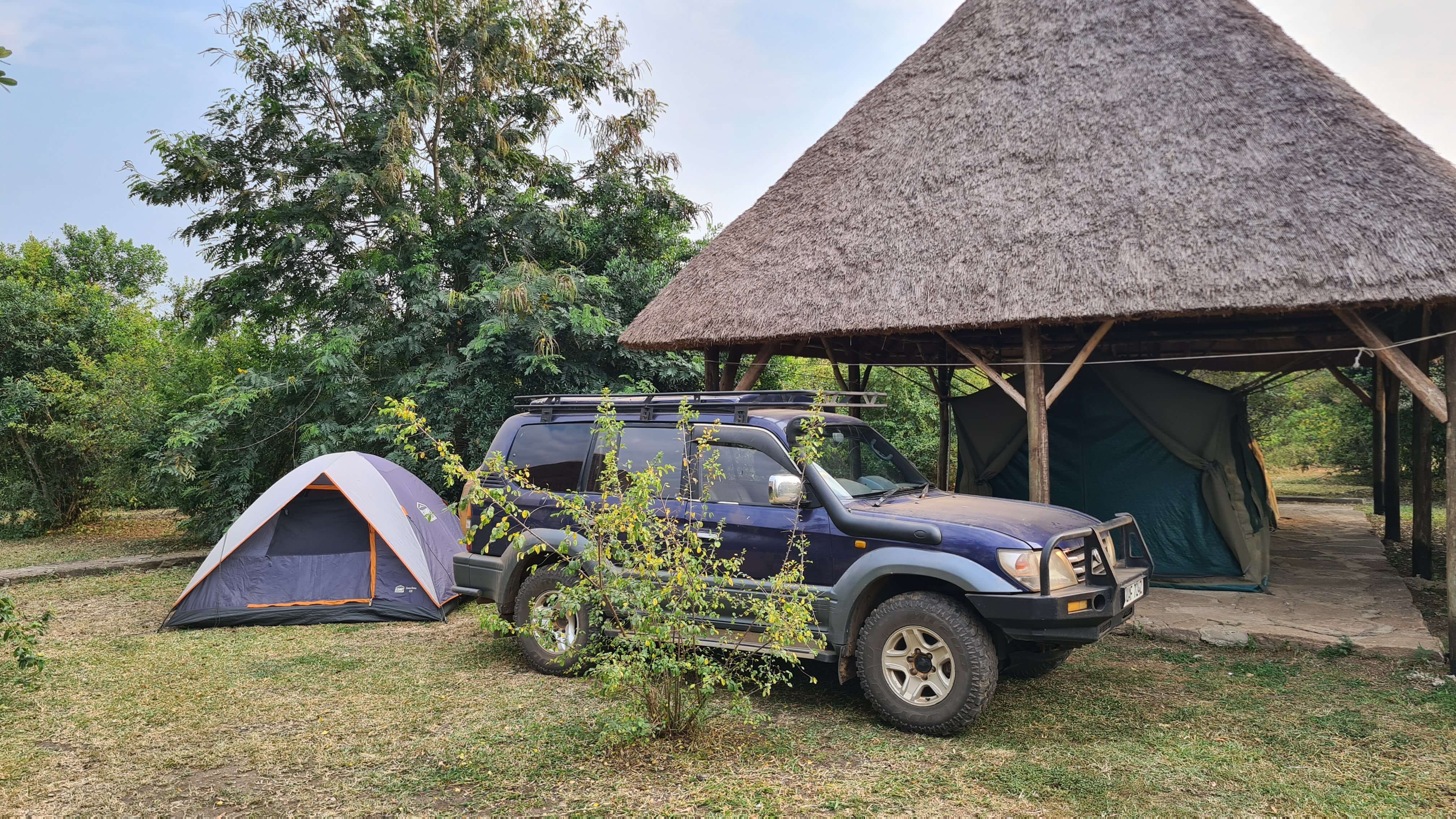 Etwas erstaunt und vielleicht auch enttäuscht ist die Crew, als wir eröffnen, dass wir heute selbst kochen. Wir müssen unbedingt endlich unsere Riesen-Avocado verarbeiten, die wir nun schon seit dem Marktbesuch in Masindi durch die Lande rütteln. Wir wählen einen Campspot direkt neben einem der unbenutzten Kabinenzelte und nahe dem Klo. Hier haben wir Wasser und Licht und da es schon dunkel ist, muss es schnell gehen. Aus der Mammut-Avocado zaubern wir eine richtig geile Guacamole – zum Reinknien!