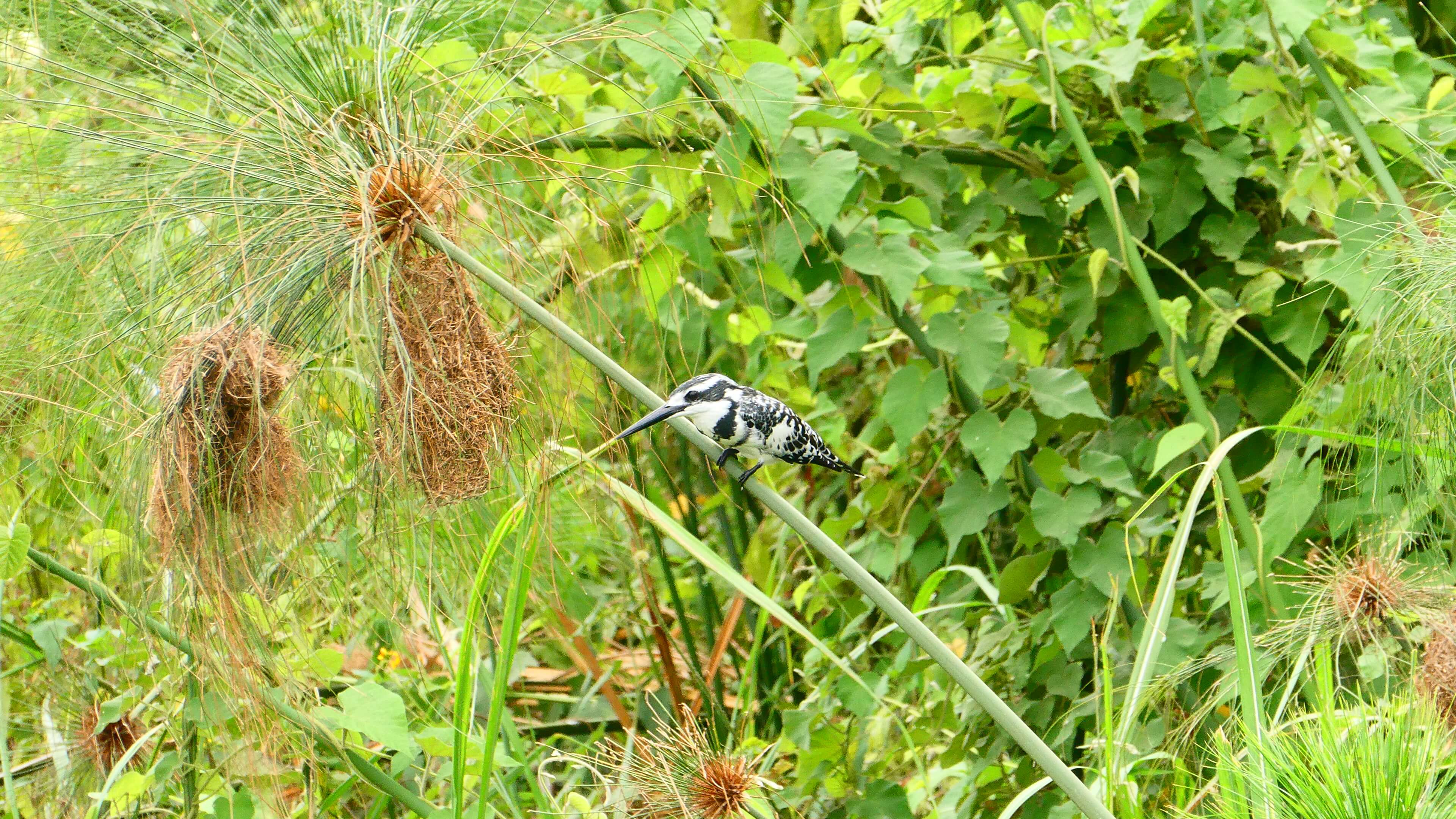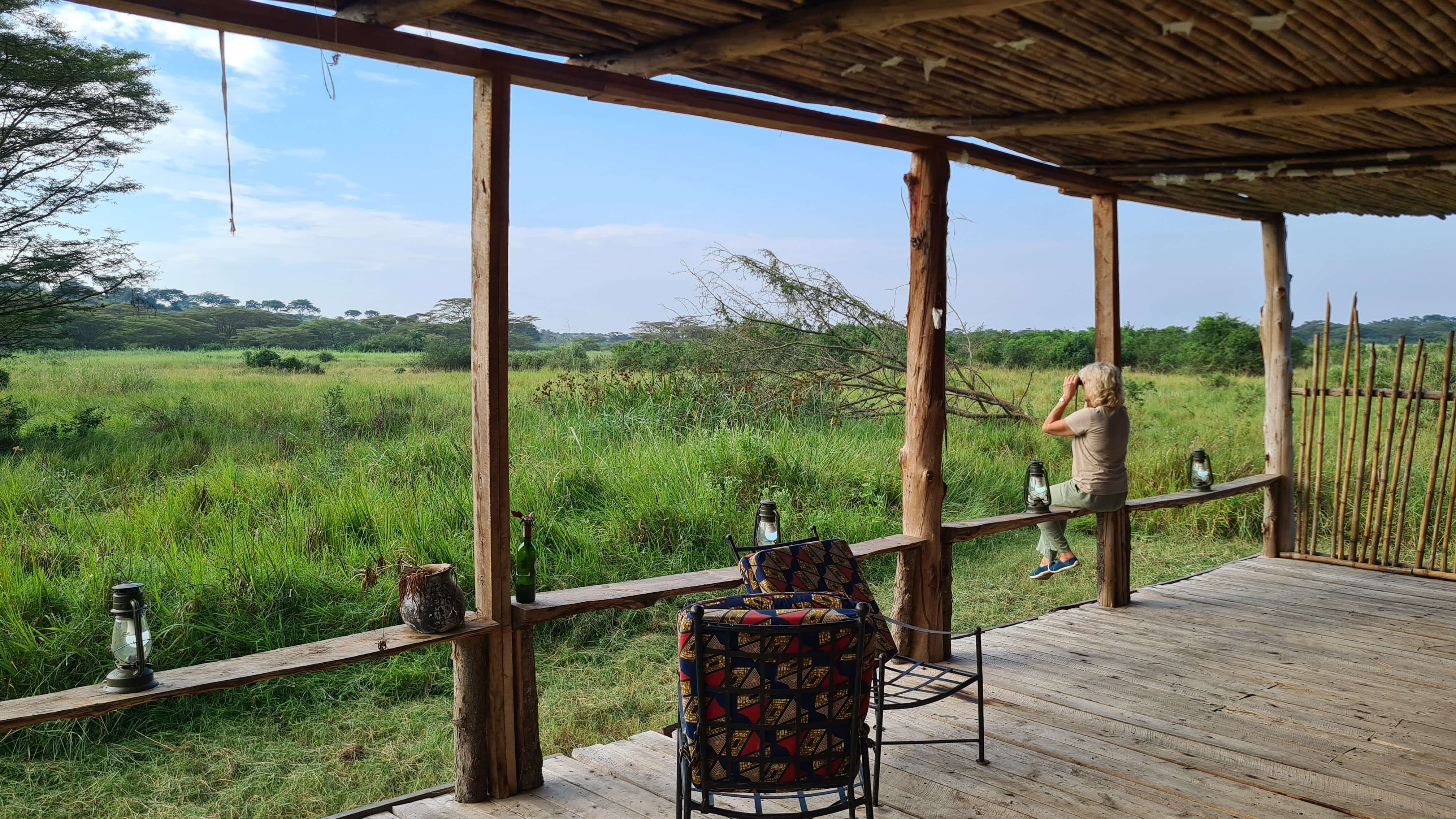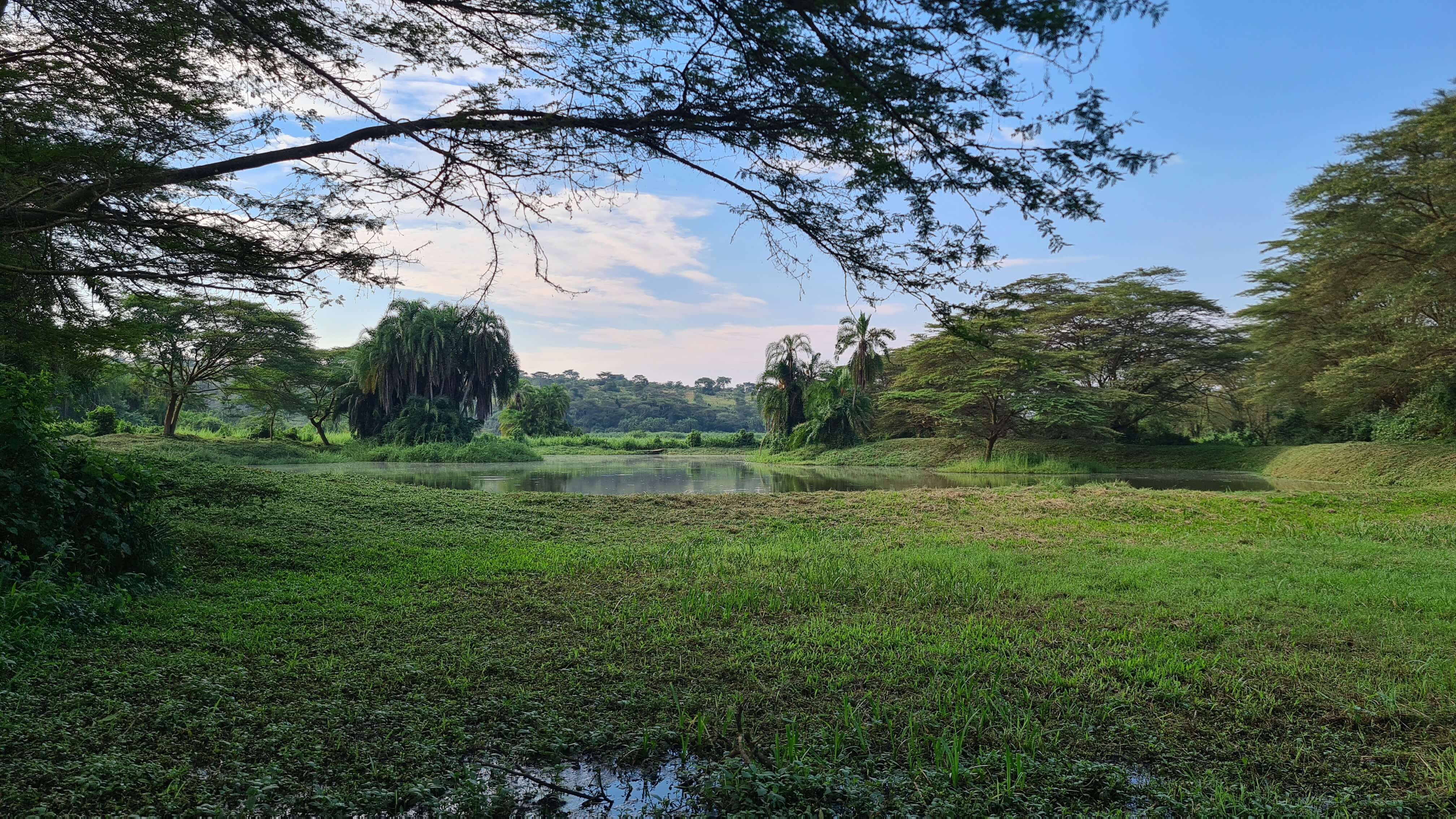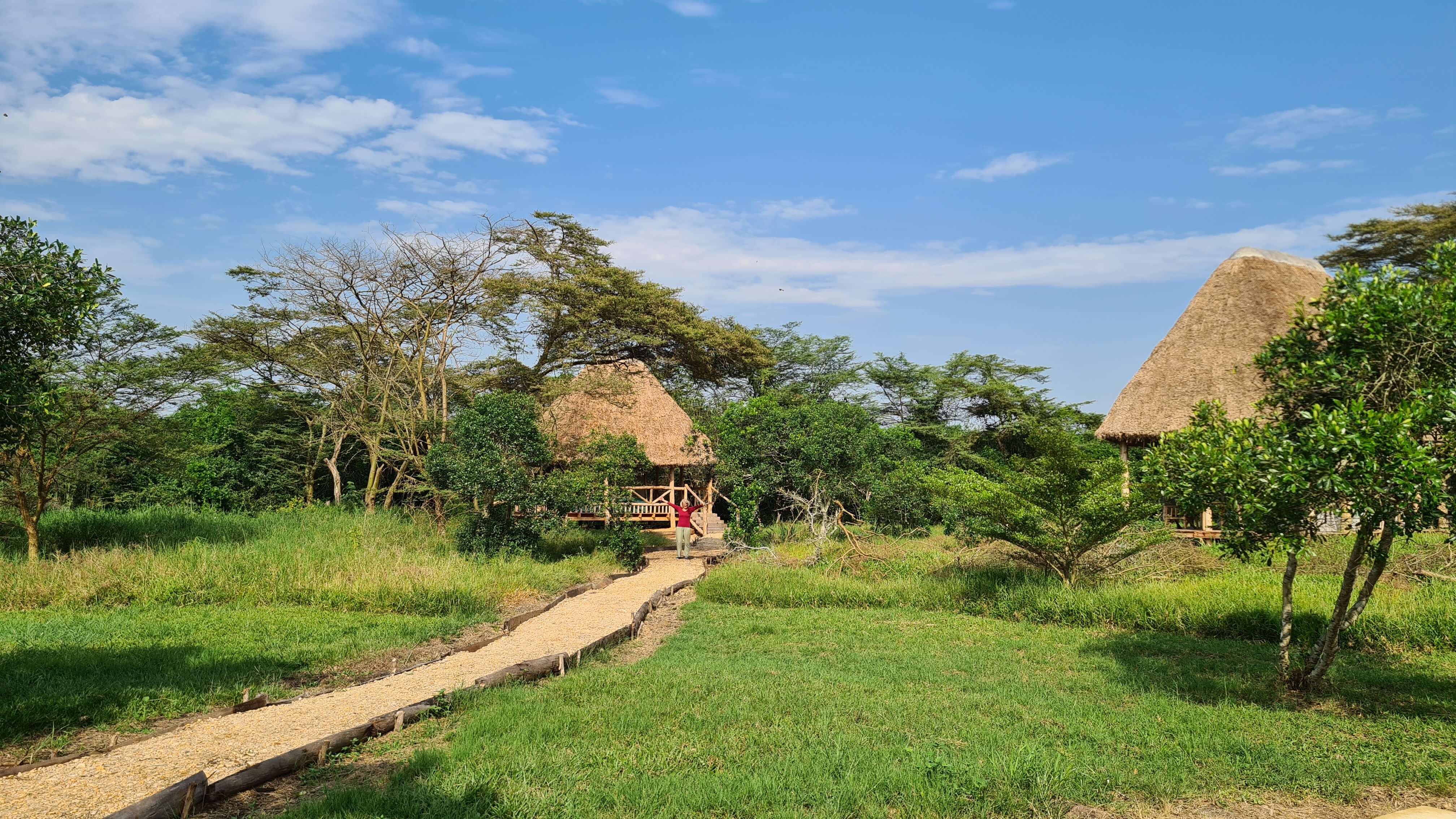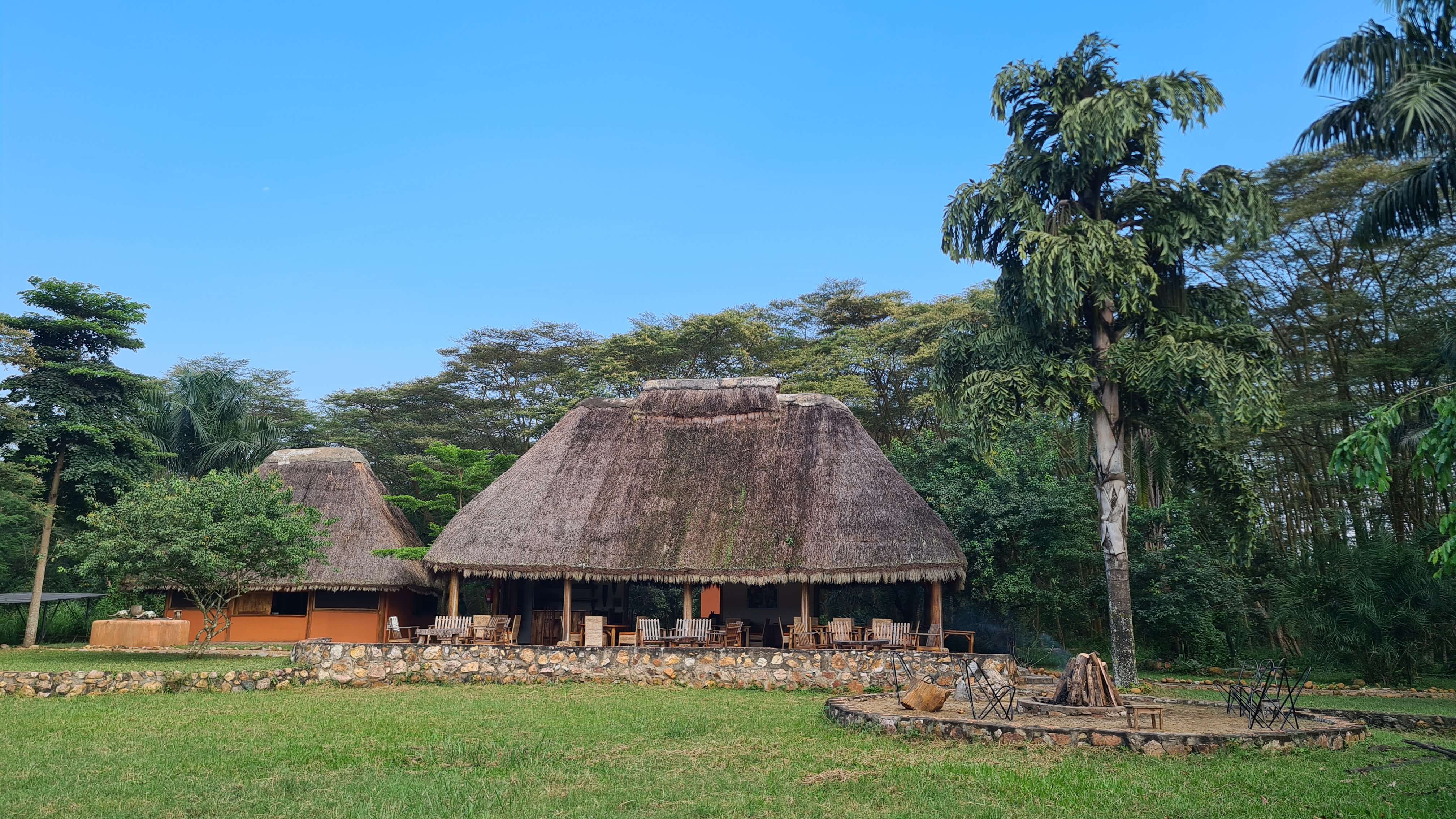 Auf dem Weg zur nahen Enjojo Lodge öffnet tatsächlich der Himmel seine Pforten. So checken wir in Ruhe ein und nehmen eine Erfrischung auf der Terrasse mit Blick in die herrliche Natur. Die Lodge und die Campsite ist urig-wild und wunderbar in einem verwachsenen Wald-/Sumpfgebiet gelegen. Nachdem der Regen aufgehört hat, machen wir uns gleich auf einen Erkundungsgang und entdecken außer vielen schönen Ecken auch unzählige Vögel wie Kingfisher in allen Größen und Farben, Ibisse, die großen Turacos, aber auch Affen in der grünen Wildnis. Trotz des vielen Wassers, gibt es überraschenderweise – und Gottseidank – kaum Moskitos.