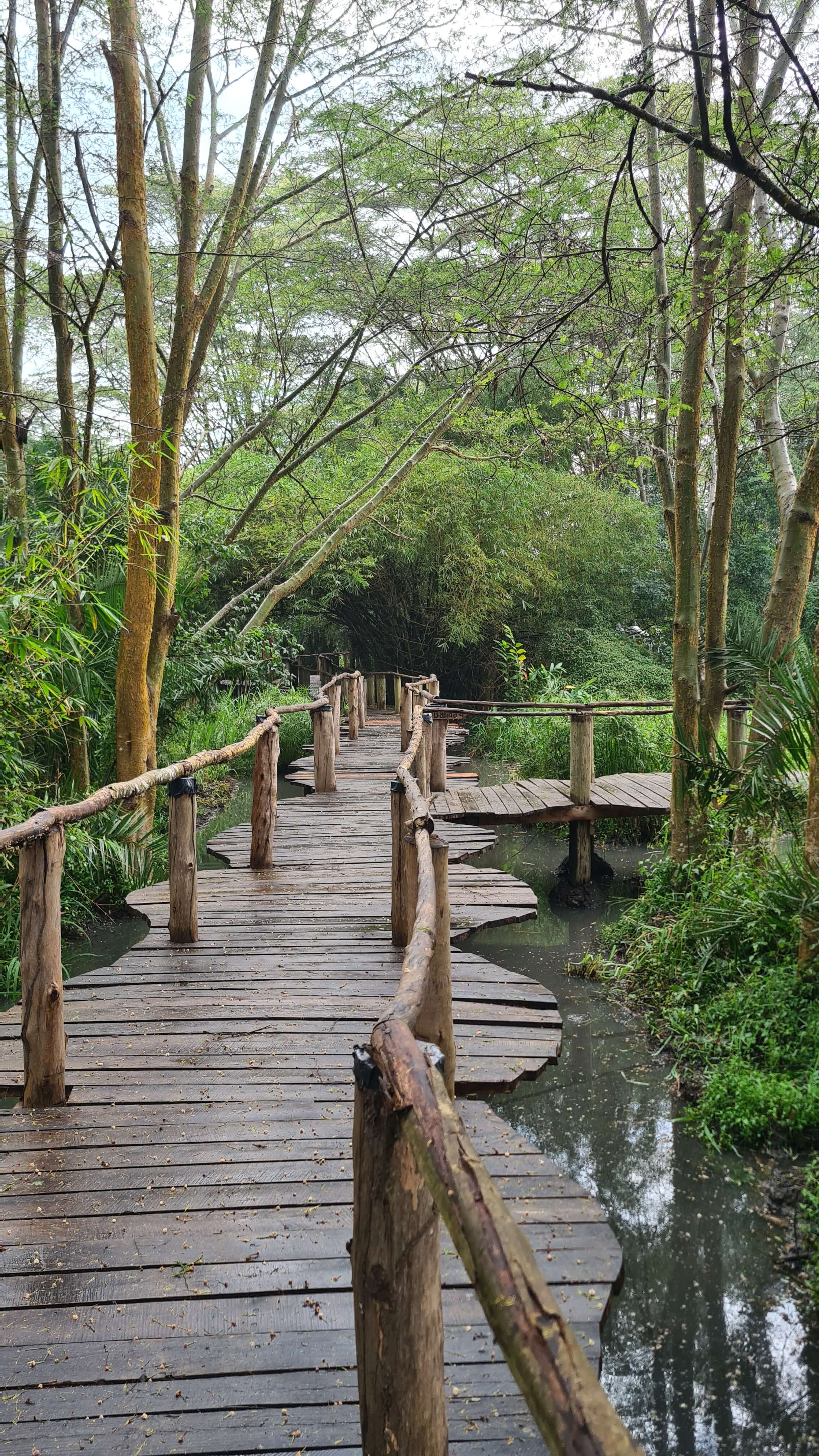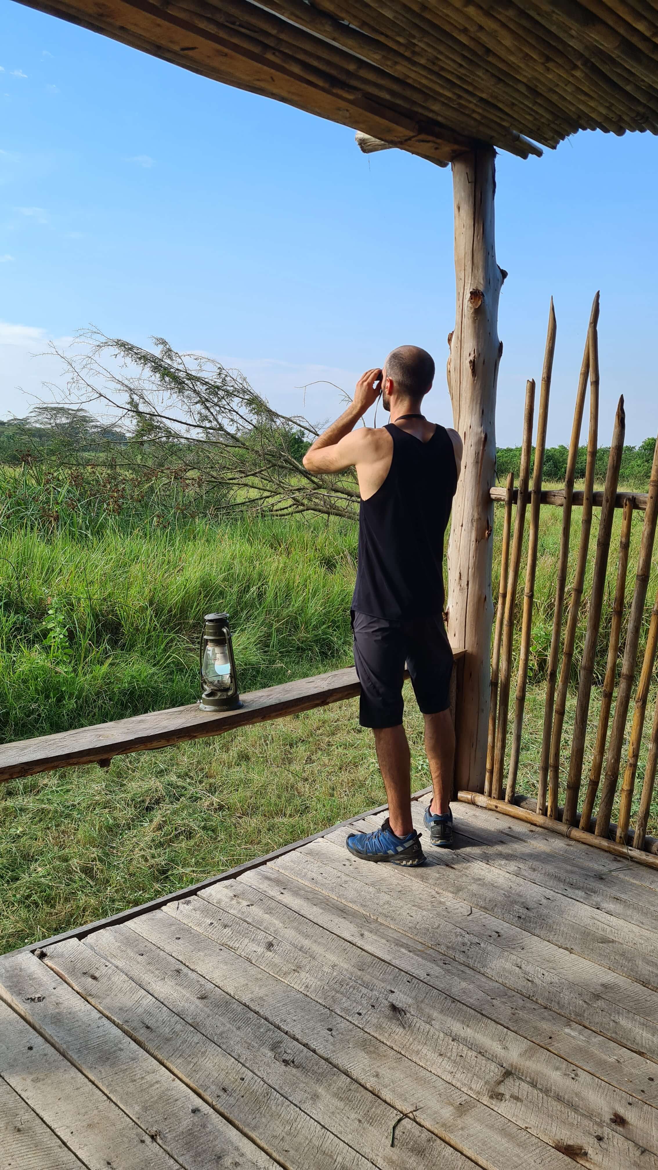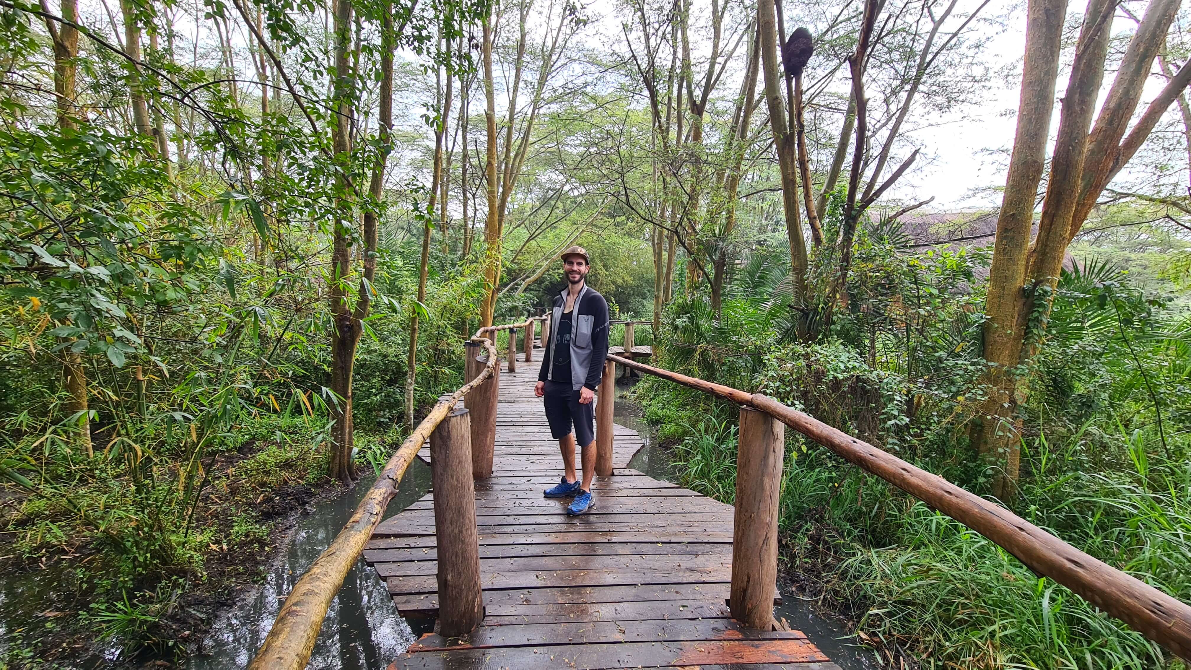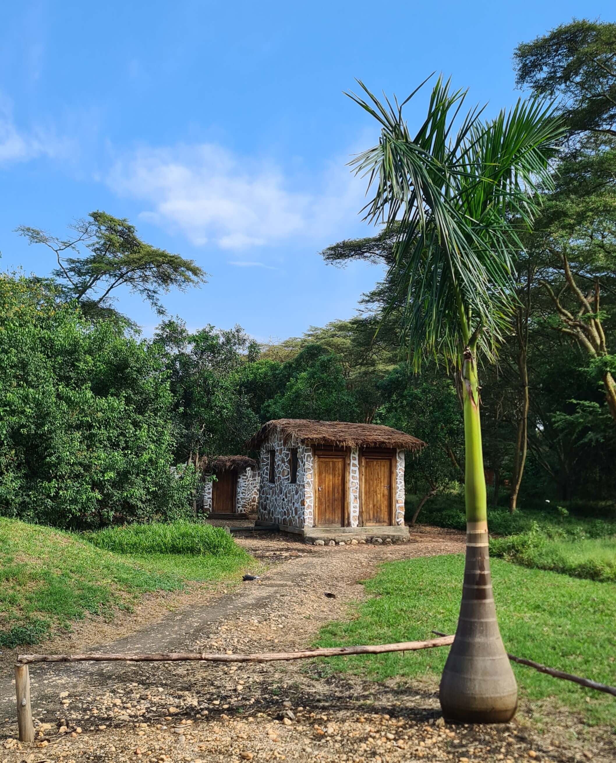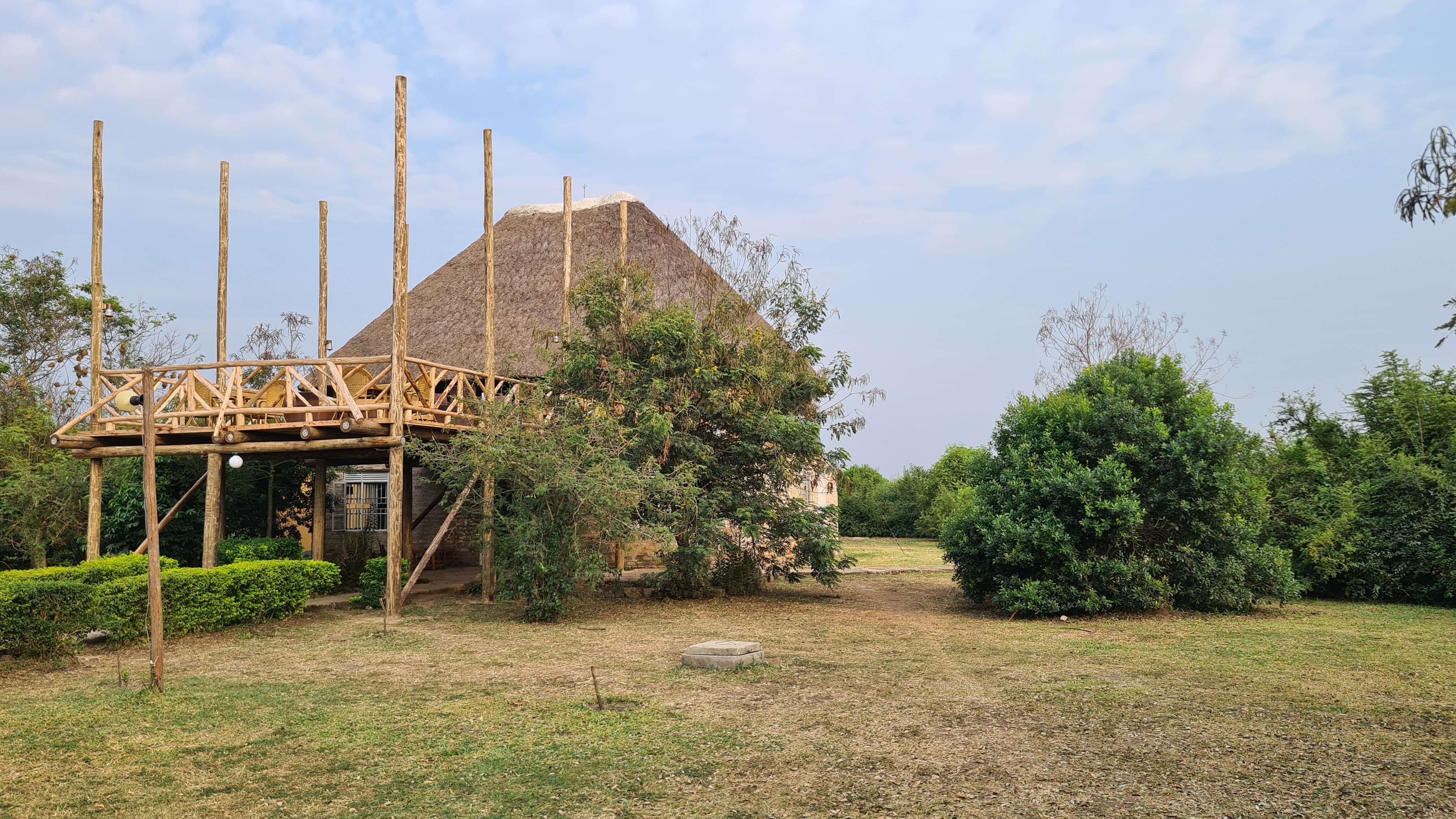 Auf dem Weg zur nahen Enjojo Lodge öffnet tatsächlich der Himmel seine Pforten. So checken wir in Ruhe ein und nehmen eine Erfrischung auf der Terrasse mit Blick in die herrliche Natur. Die Lodge und die Campsite ist urig-wild und wunderbar in einem verwachsenen Wald-/Sumpfgebiet gelegen. Nachdem der Regen aufgehört hat, machen wir uns gleich auf einen Erkundungsgang und entdecken außer vielen schönen Ecken auch unzählige Vögel wie Kingfisher in allen Größen und Farben, Ibisse, die großen Turacos, aber auch Affen in der grünen Wildnis. Trotz des vielen Wassers, gibt es überraschenderweise – und Gottseidank – kaum Moskitos.