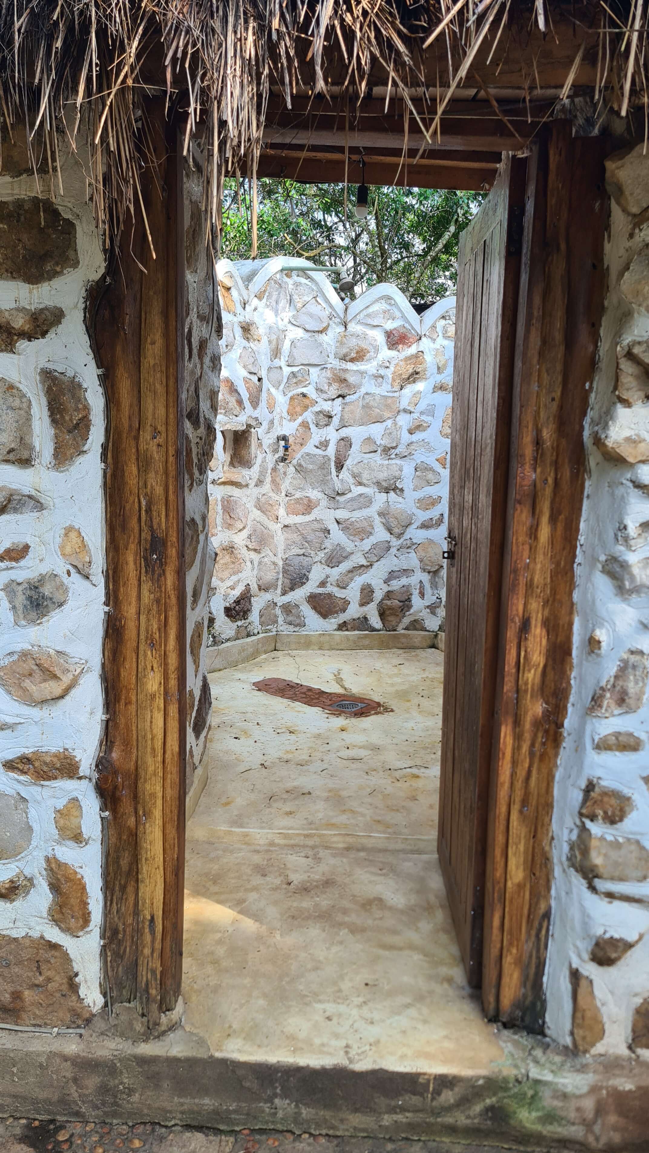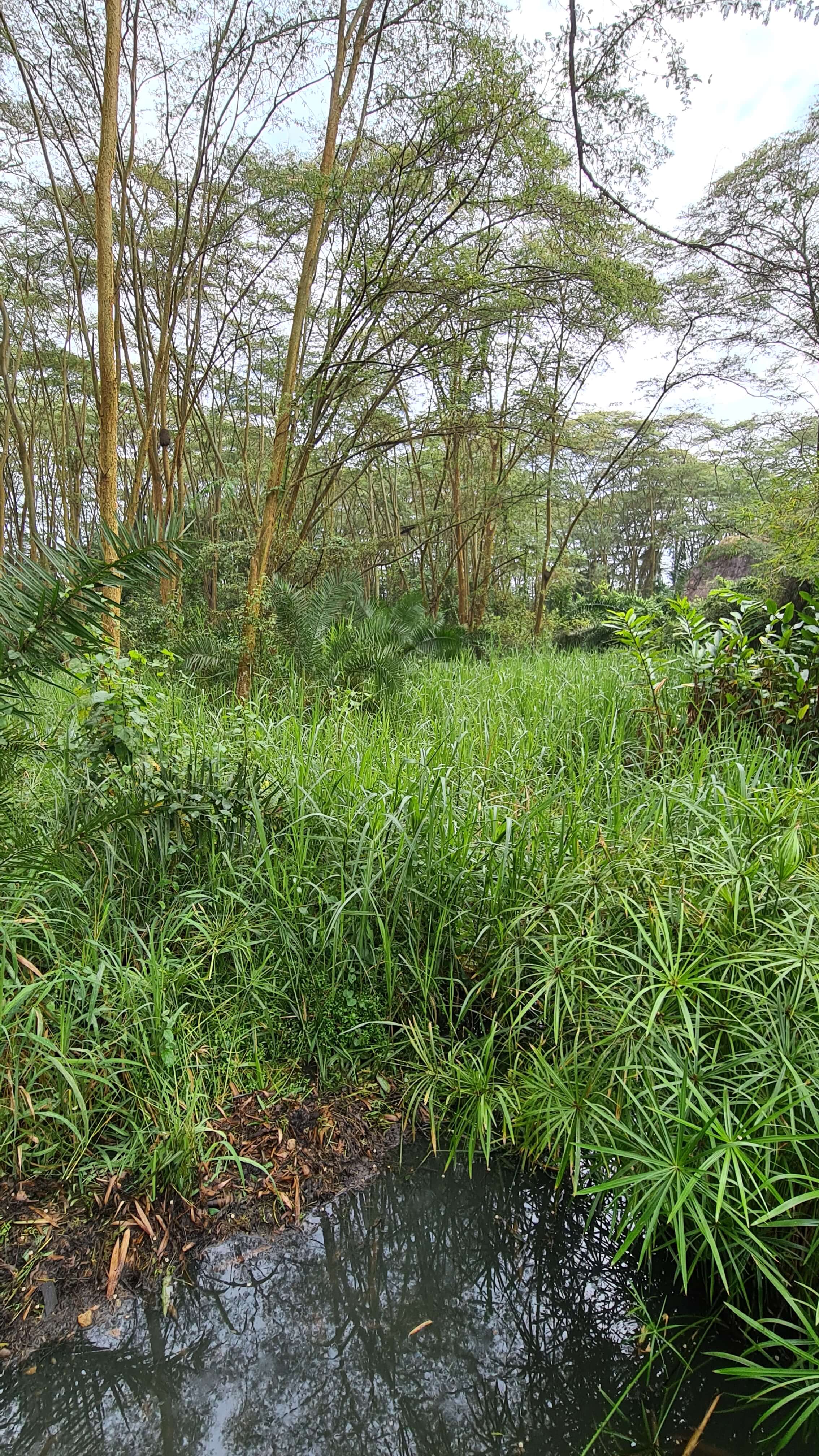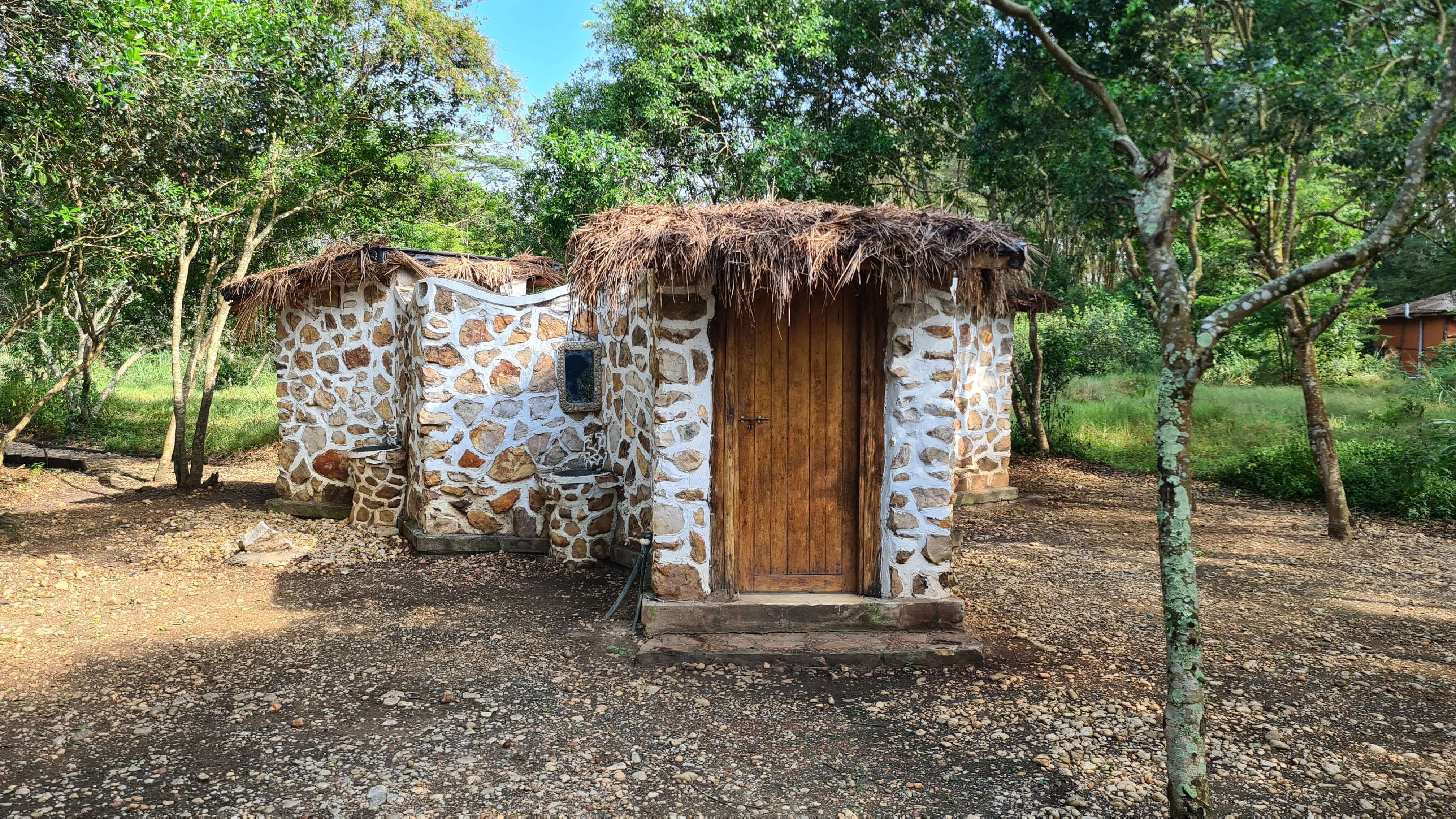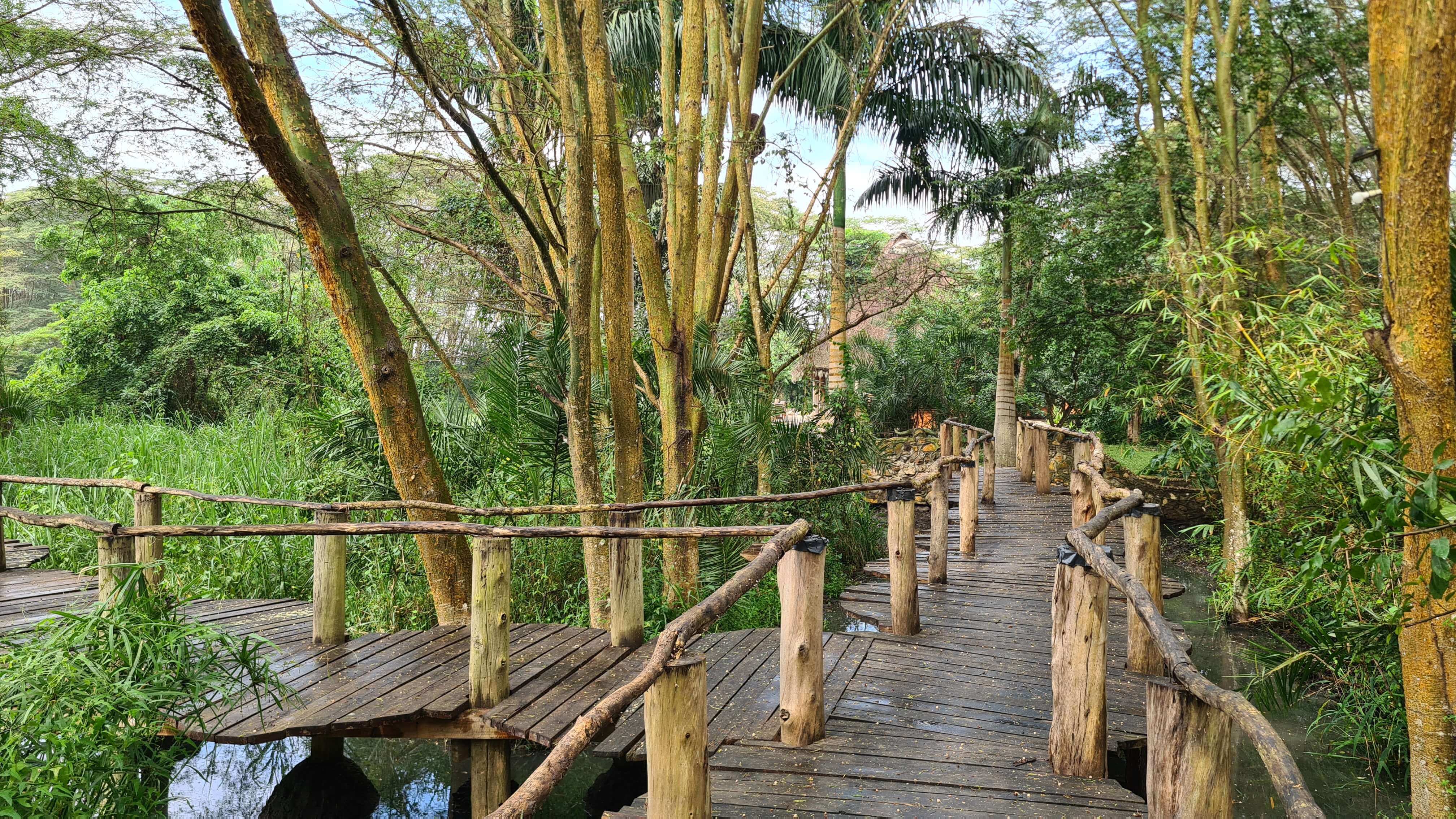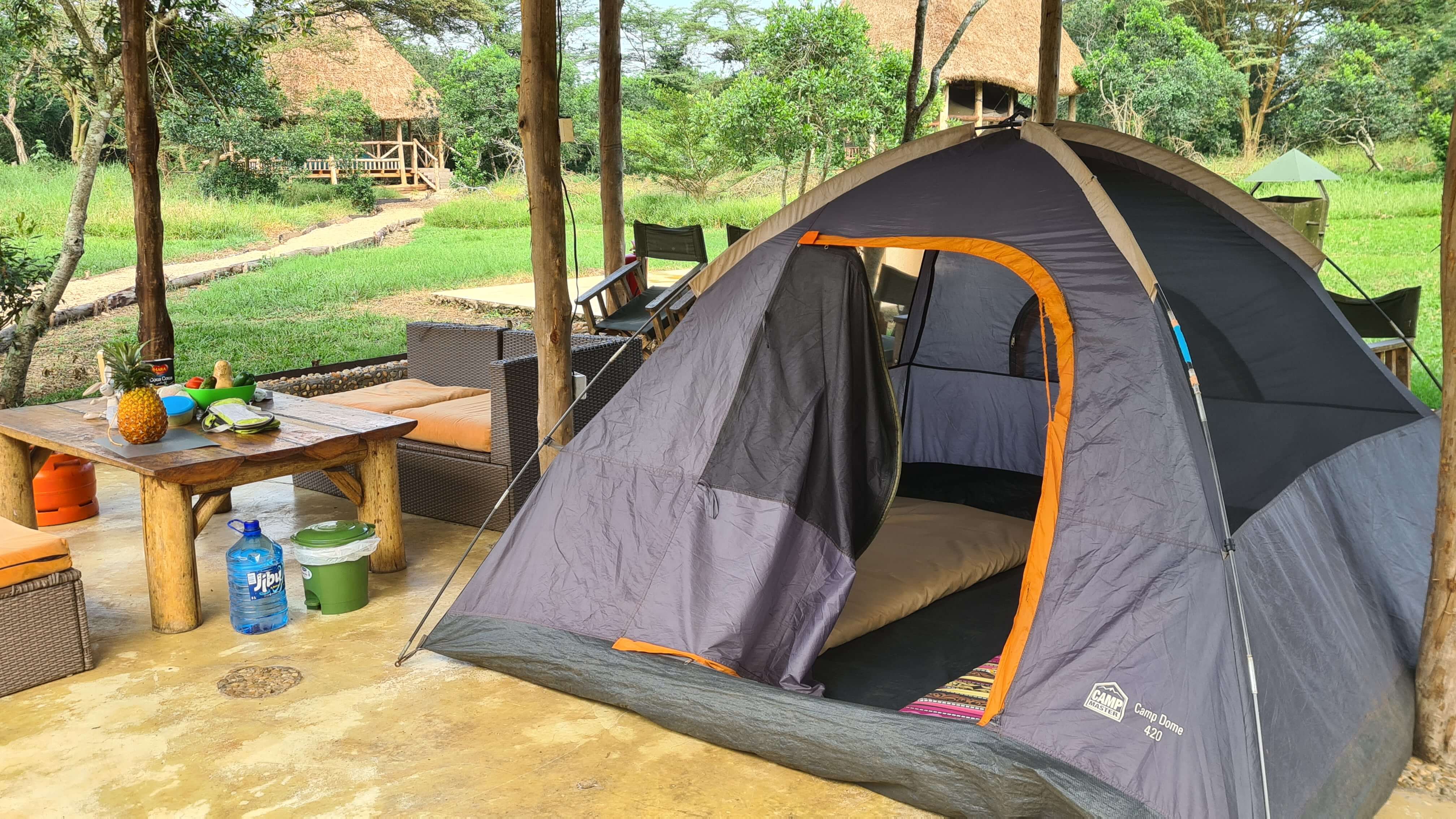 Auf dem Weg zur nahen Enjojo Lodge öffnet tatsächlich der Himmel seine Pforten. So checken wir in Ruhe ein und nehmen eine Erfrischung auf der Terrasse mit Blick in die herrliche Natur. Die Lodge und die Campsite ist urig-wild und wunderbar in einem verwachsenen Wald-/Sumpfgebiet gelegen. Nachdem der Regen aufgehört hat, machen wir uns gleich auf einen Erkundungsgang und entdecken außer vielen schönen Ecken auch unzählige Vögel wie Kingfisher in allen Größen und Farben, Ibisse, die großen Turacos, aber auch Affen in der grünen Wildnis. Trotz des vielen Wassers, gibt es überraschenderweise – und Gottseidank – kaum Moskitos.