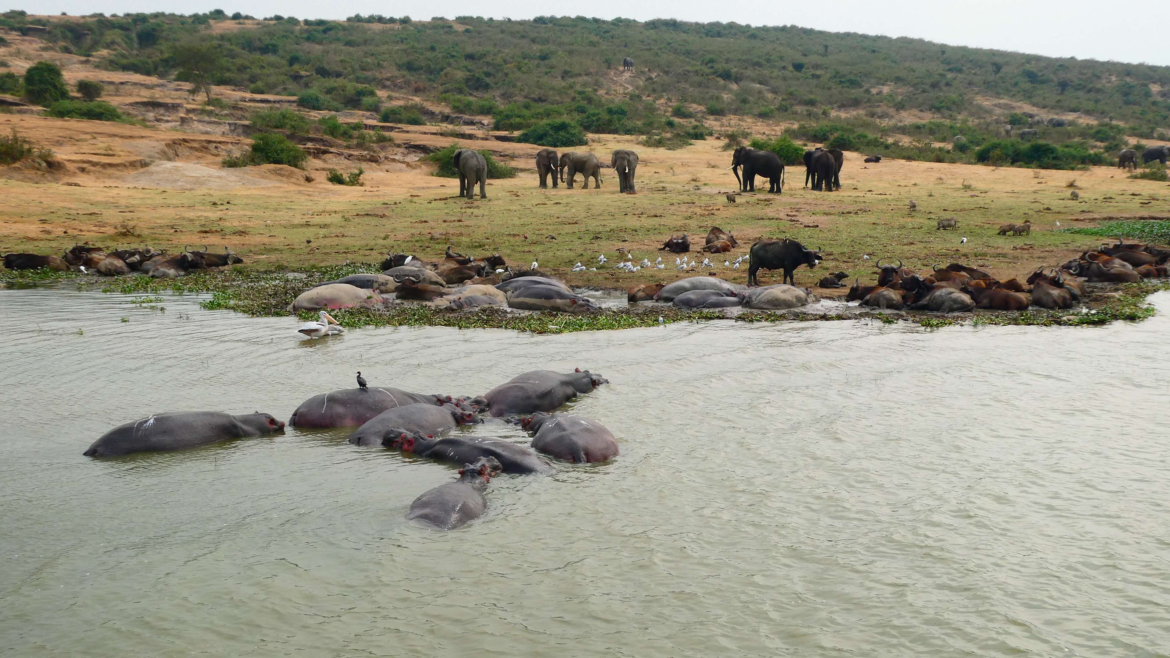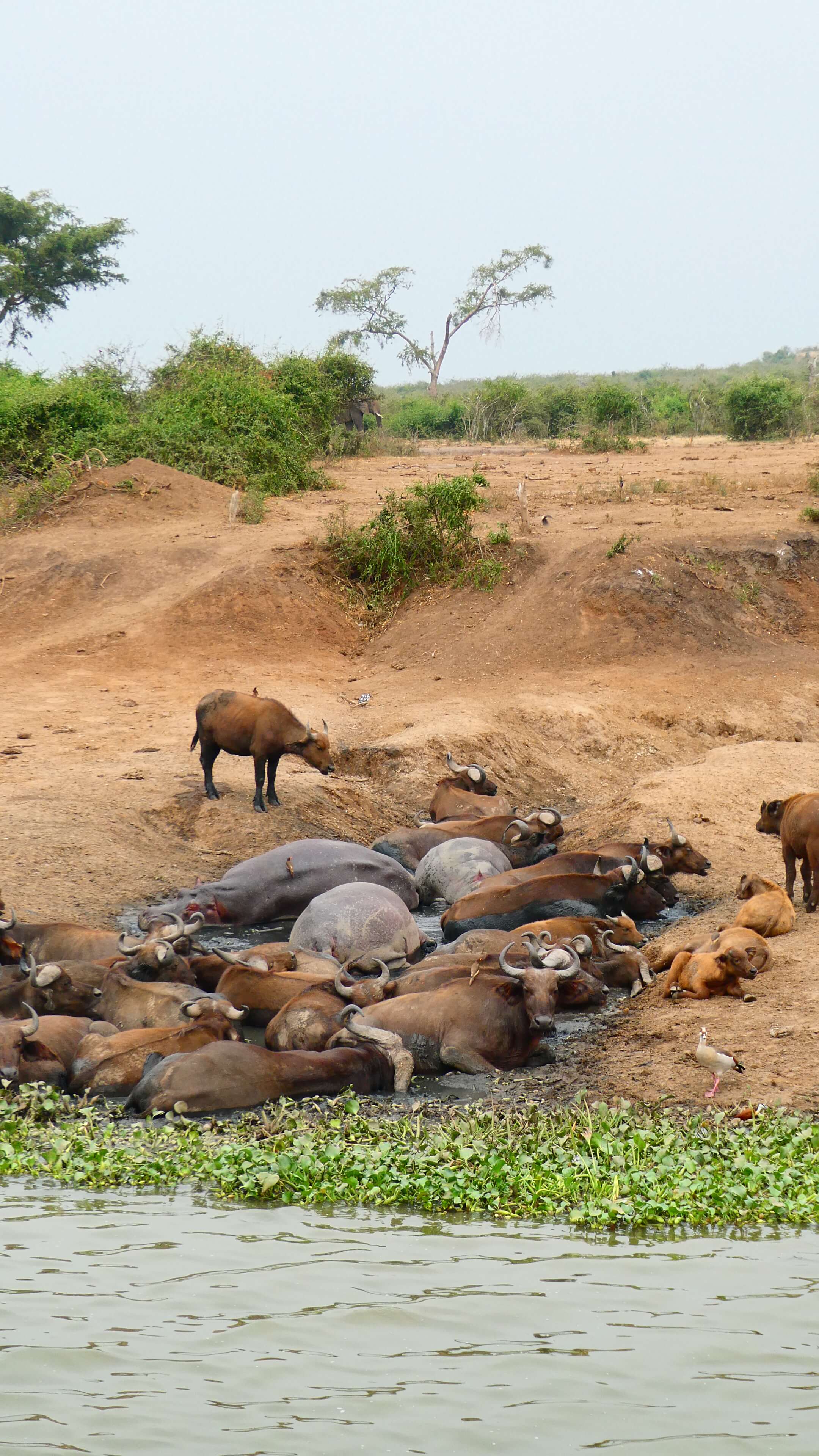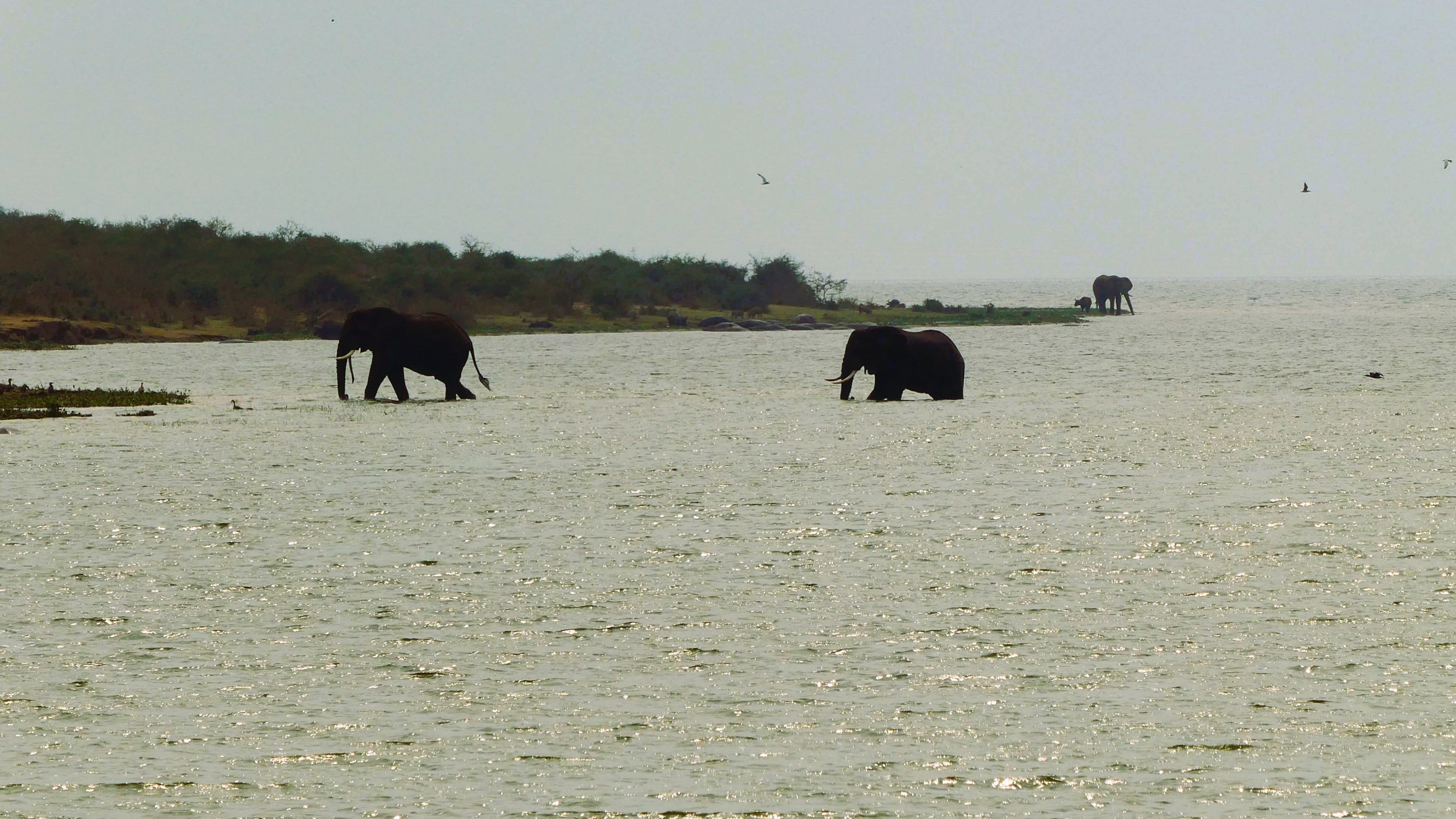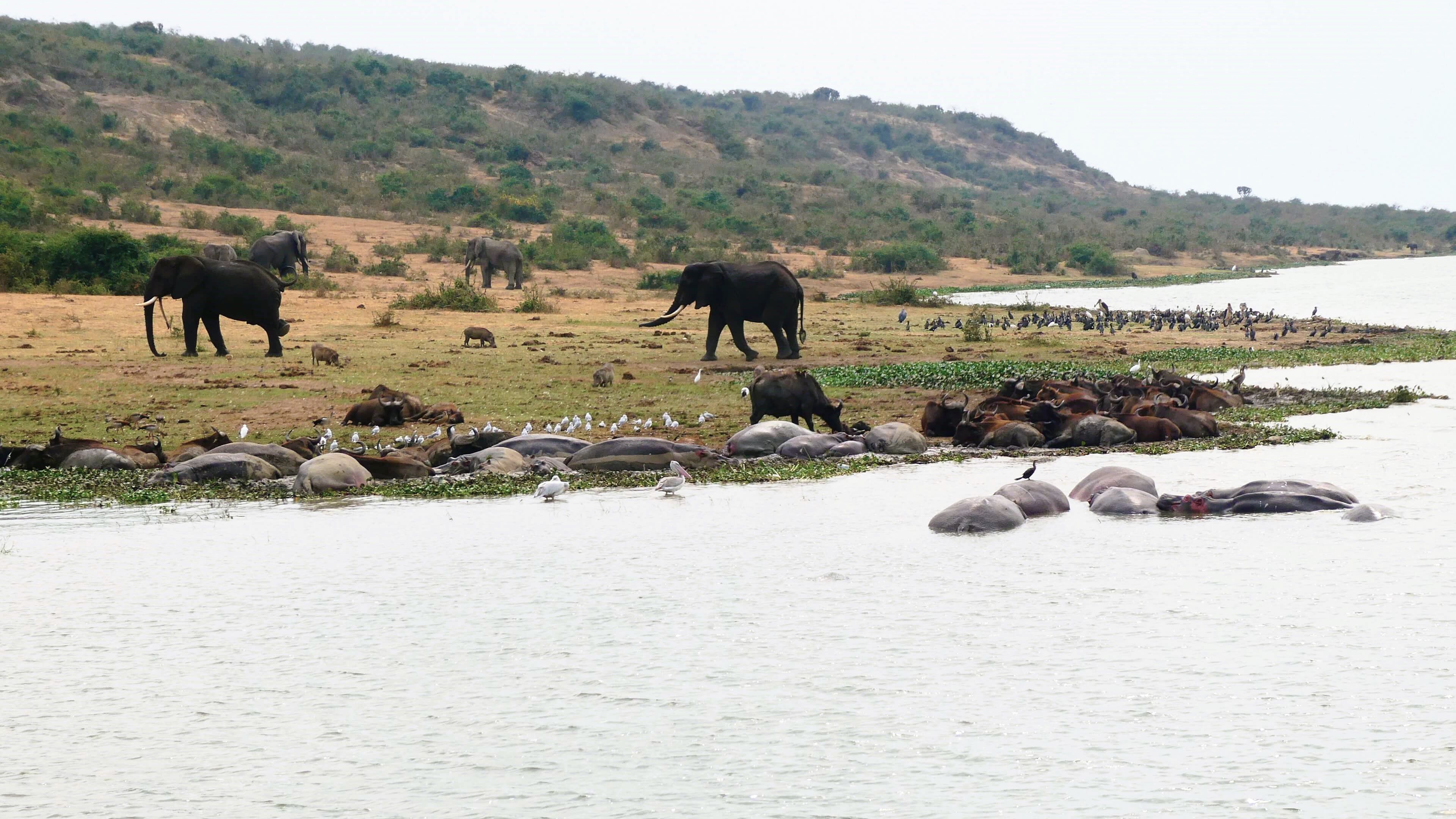 Völlig geflasht sind wir von der Atmosphäre am Delta, wo der Kazinga Channel in den Lake Edward mündet. Ein Paradies wie gemalt: Hier das Fischerdorf mit den Menschen und gleich daneben die Elefanten, die hier baden, grasen und dann in Herden wieder den Berg hinaufziehen.