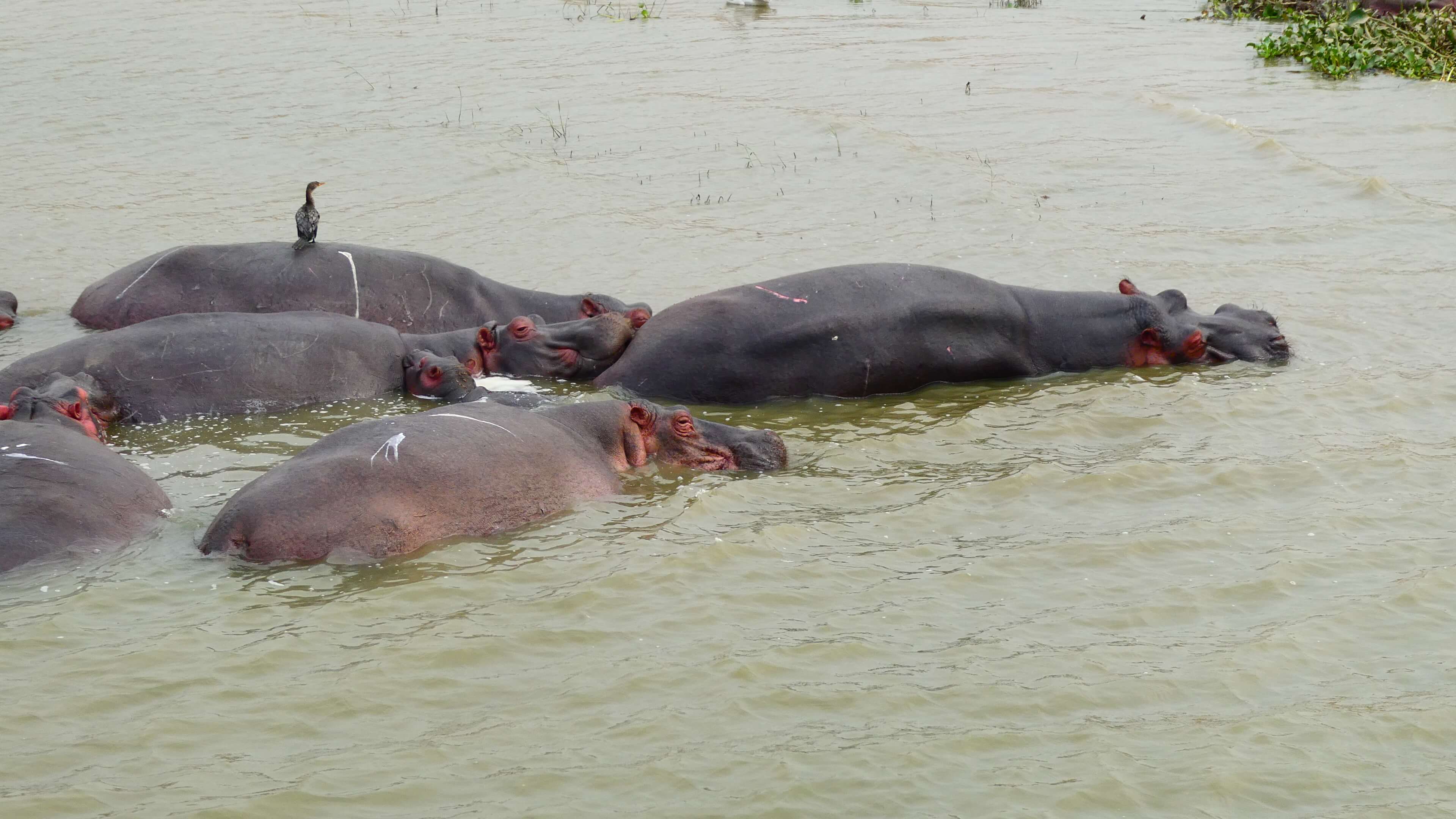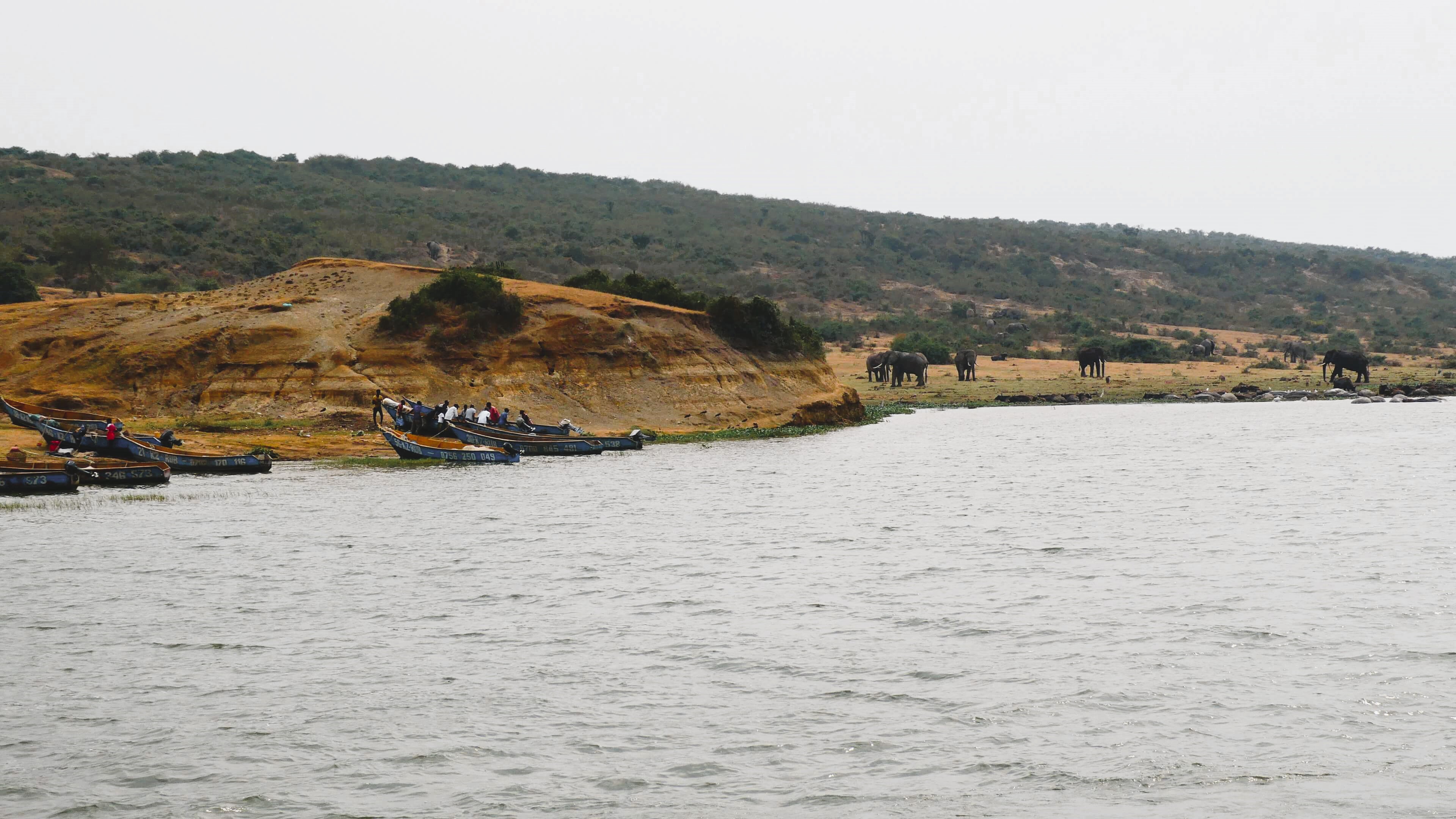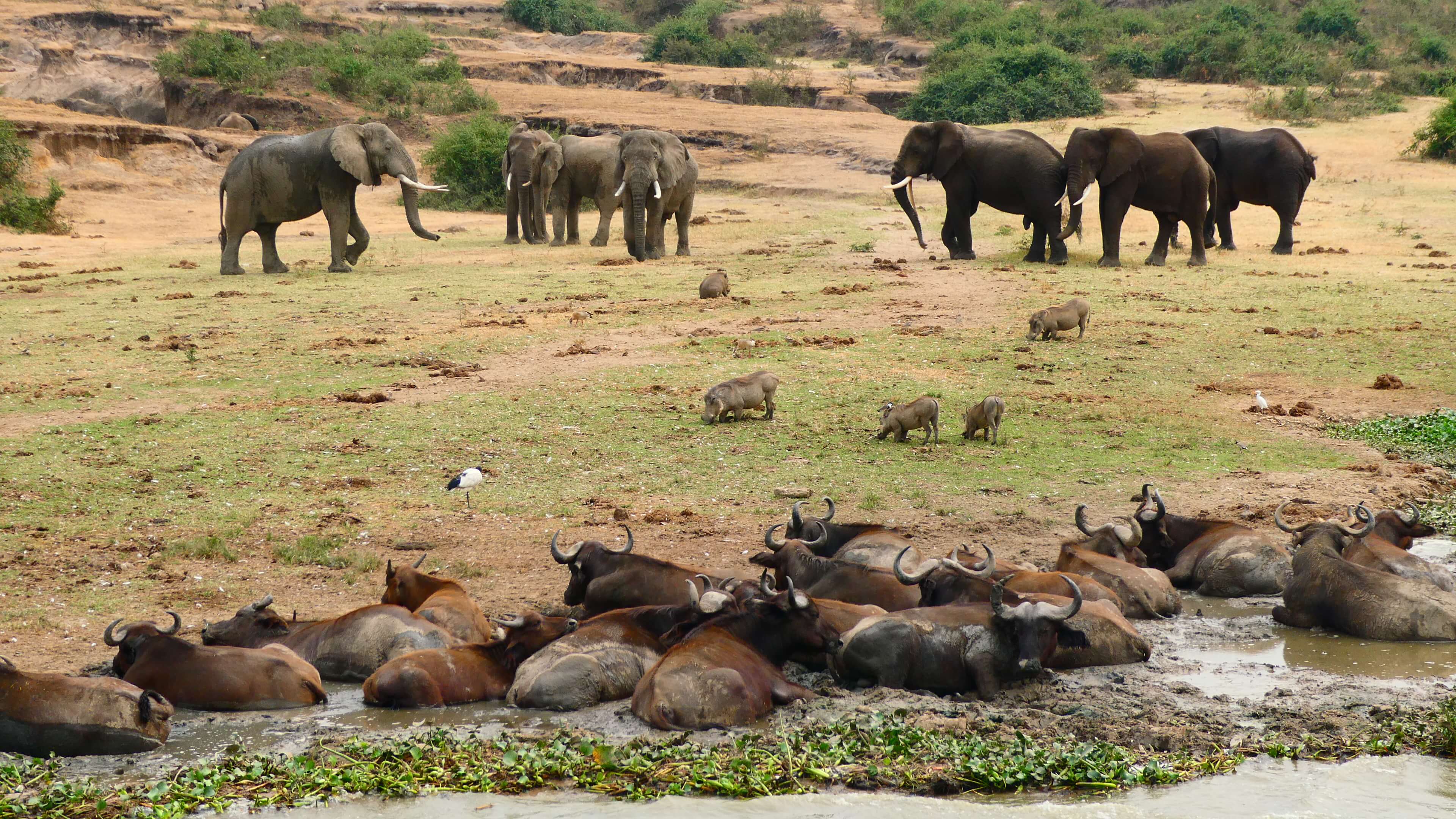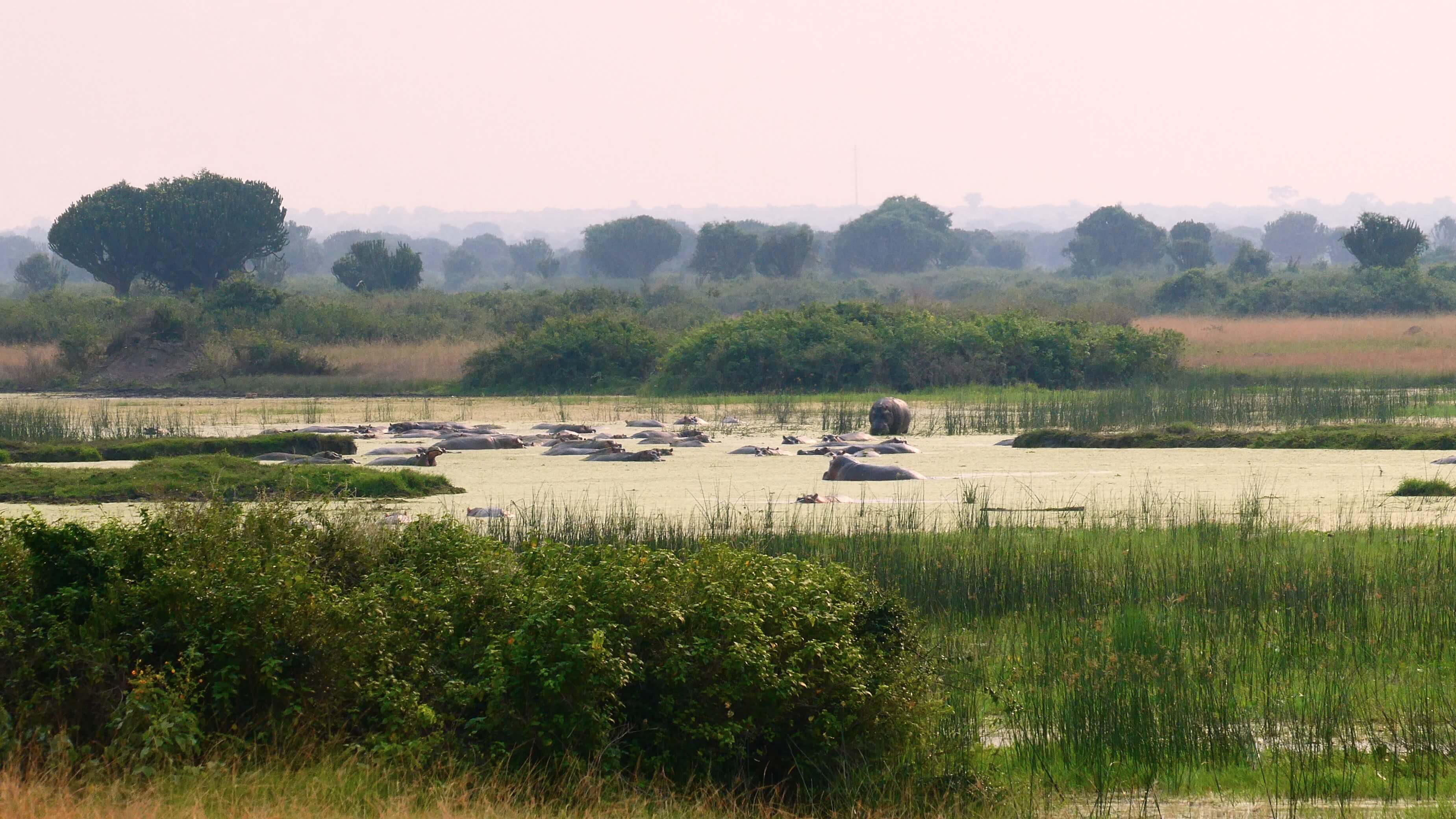 Völlig geflasht sind wir von der Atmosphäre am Delta, wo der Kazinga Channel in den Lake Edward mündet. Ein Paradies wie gemalt: Hier das Fischerdorf mit den Menschen und gleich daneben die Elefanten, die hier baden, grasen und dann in Herden wieder den Berg hinaufziehen.