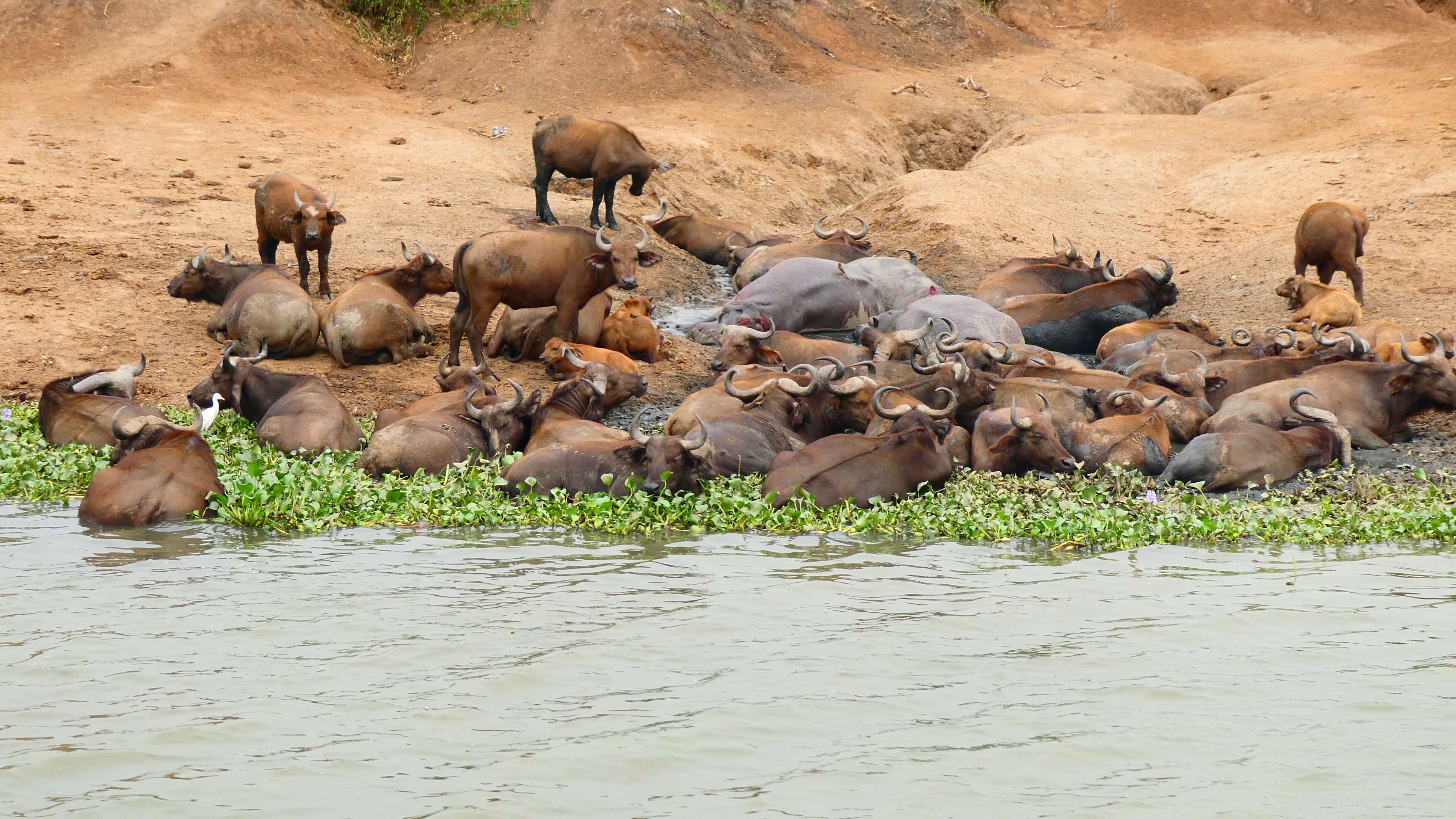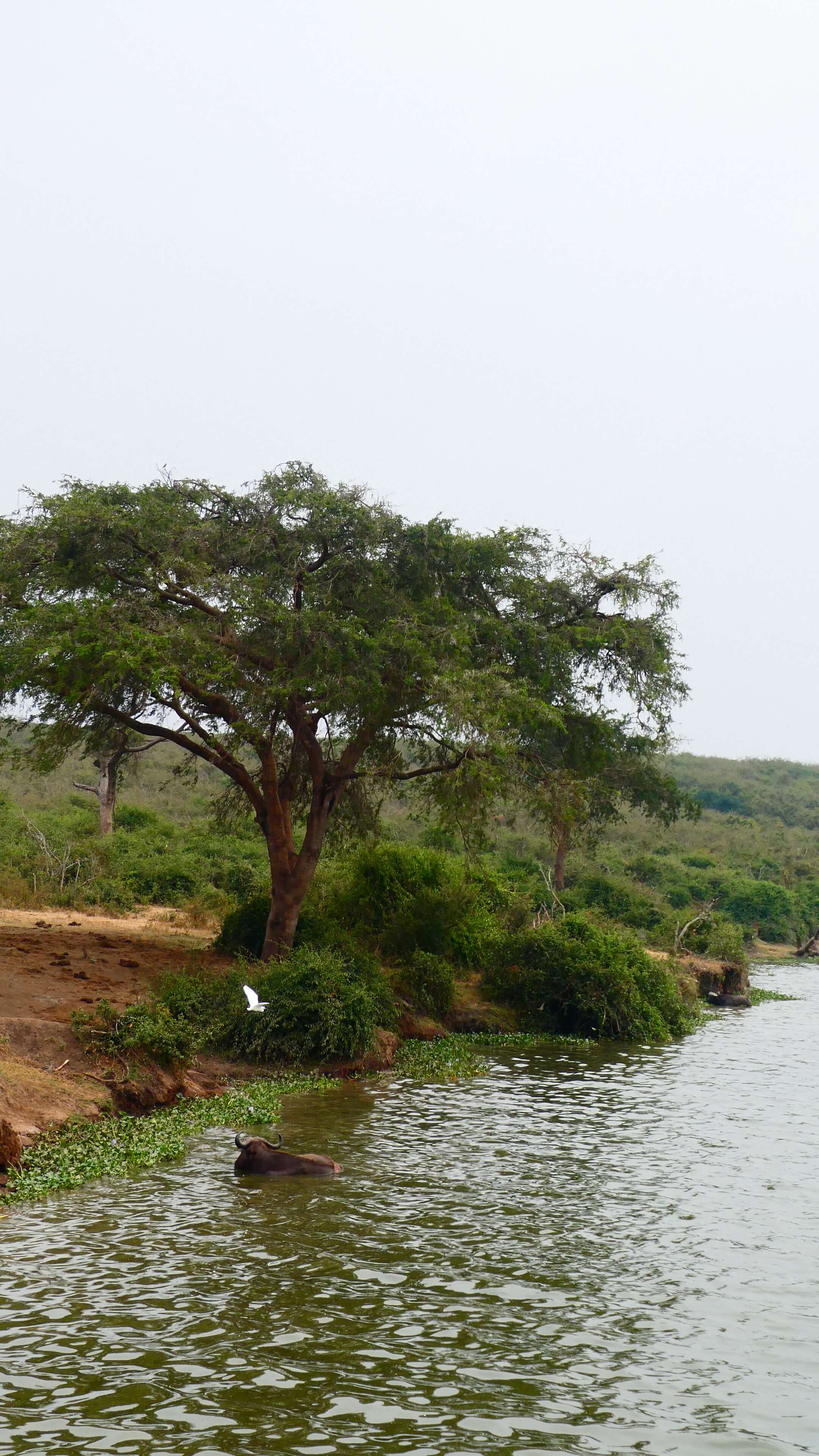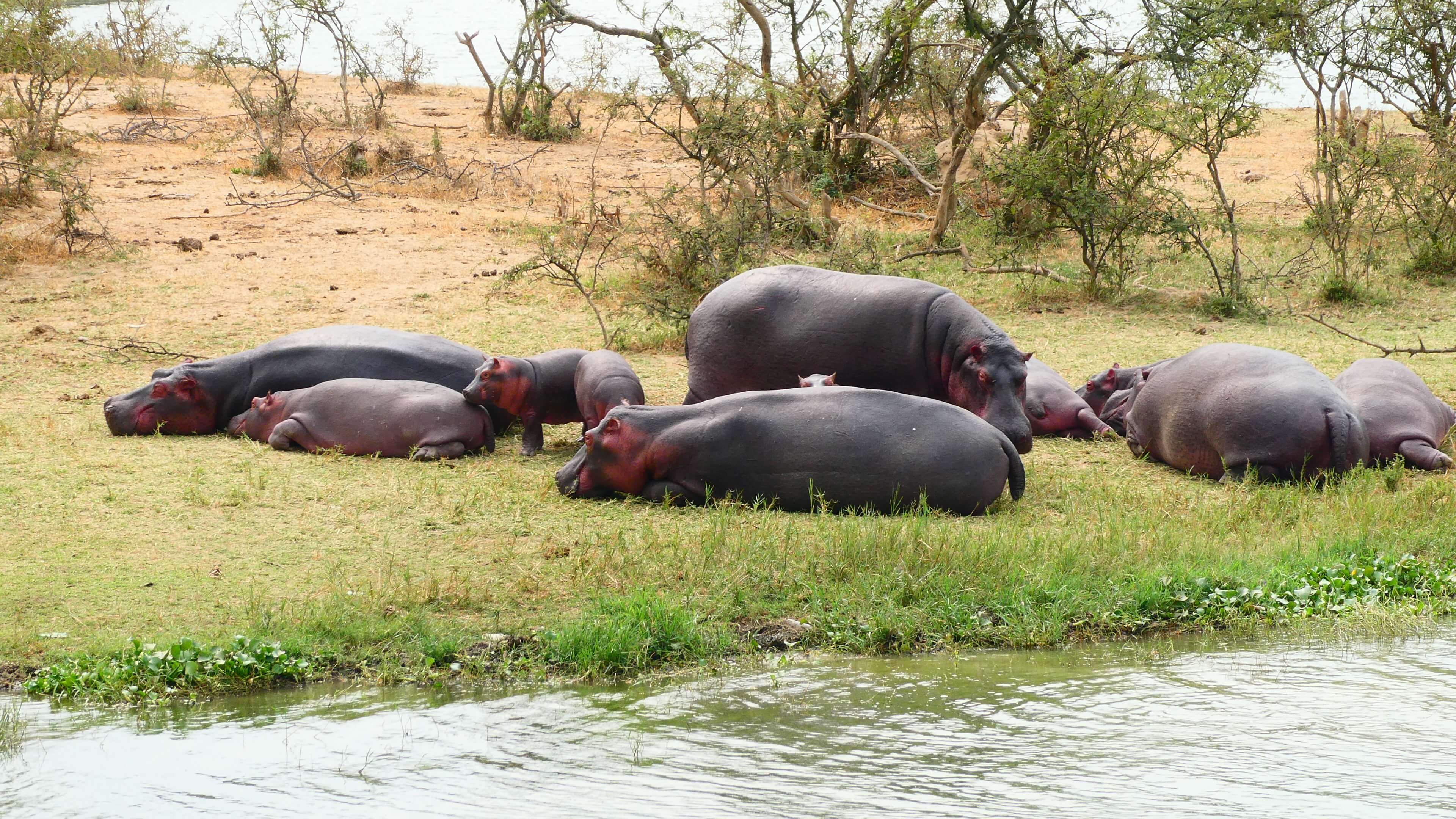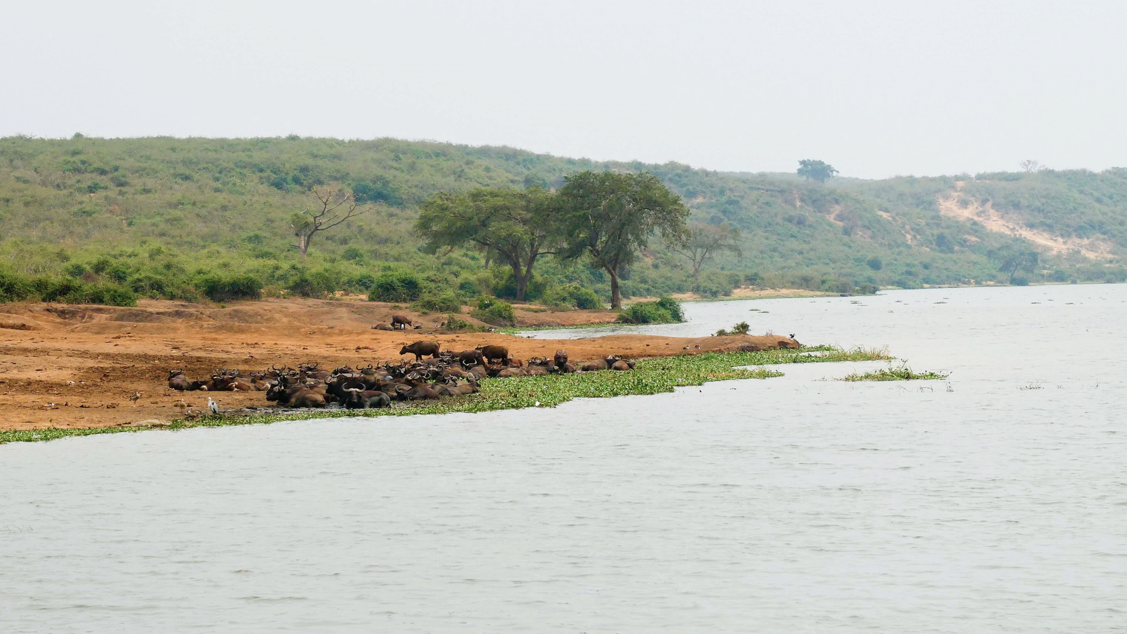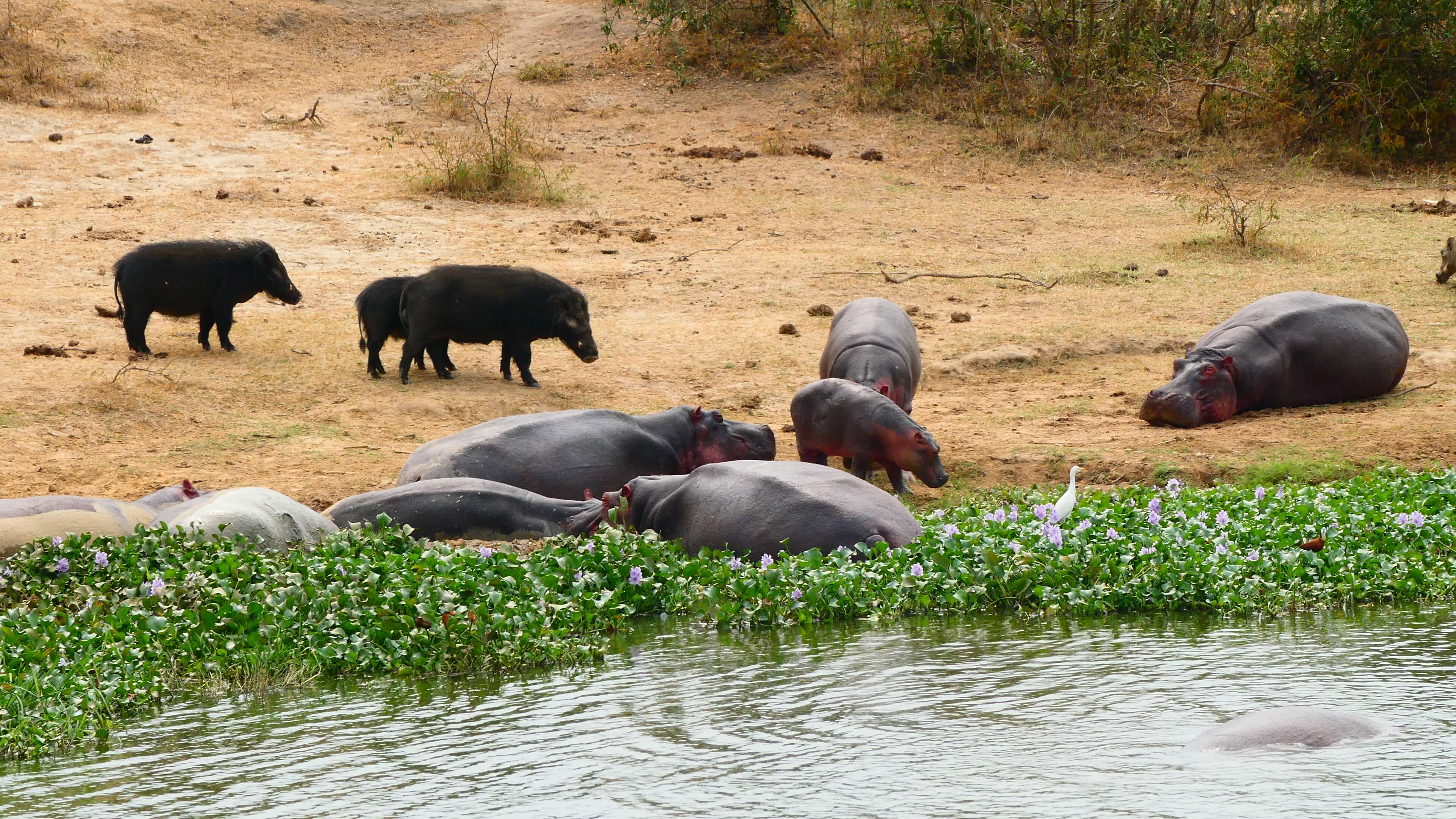 Völlig geflasht sind wir von der Atmosphäre am Delta, wo der Kazinga Channel in den Lake Edward mündet. Ein Paradies wie gemalt: Hier das Fischerdorf mit den Menschen und gleich daneben die Elefanten, die hier baden, grasen und dann in Herden wieder den Berg hinaufziehen.