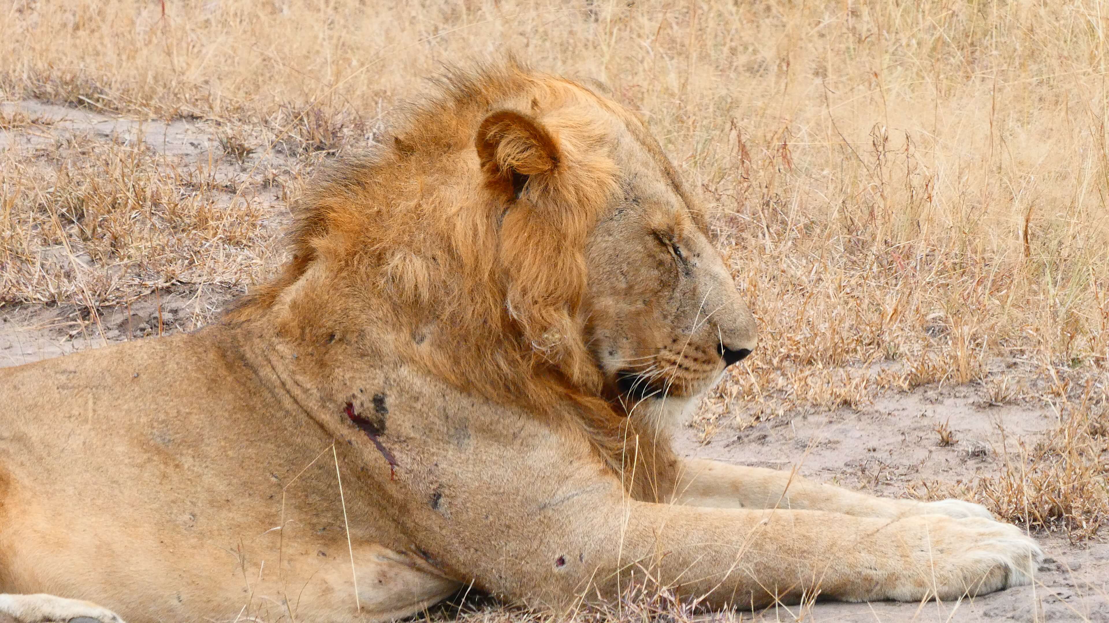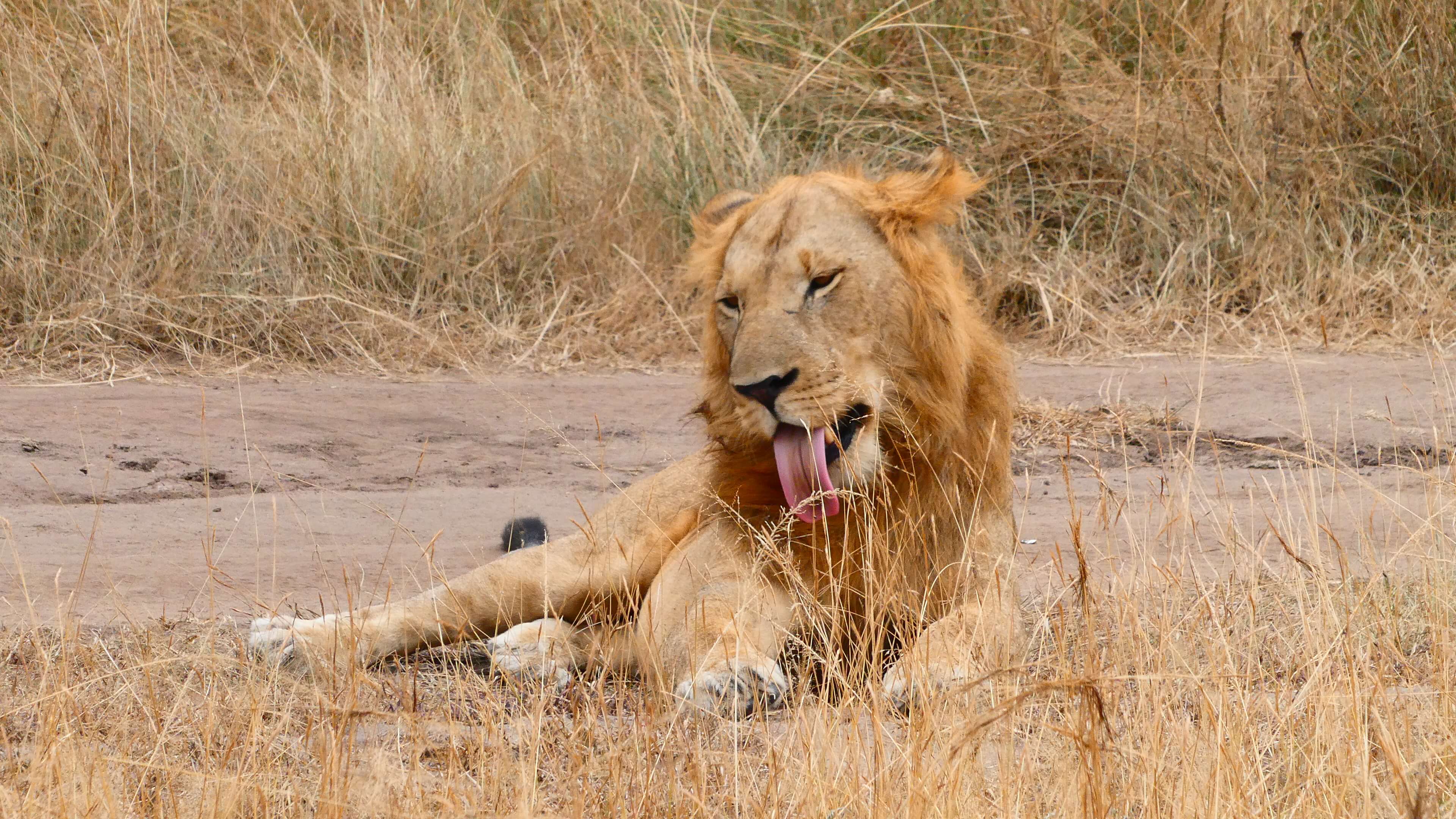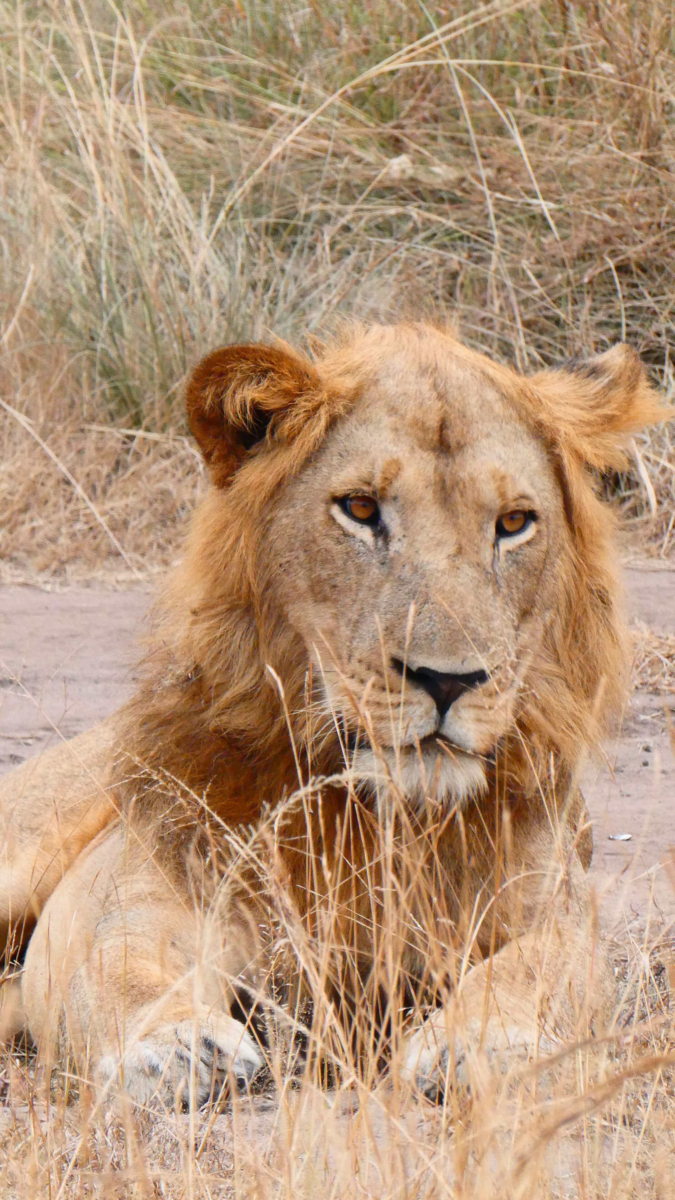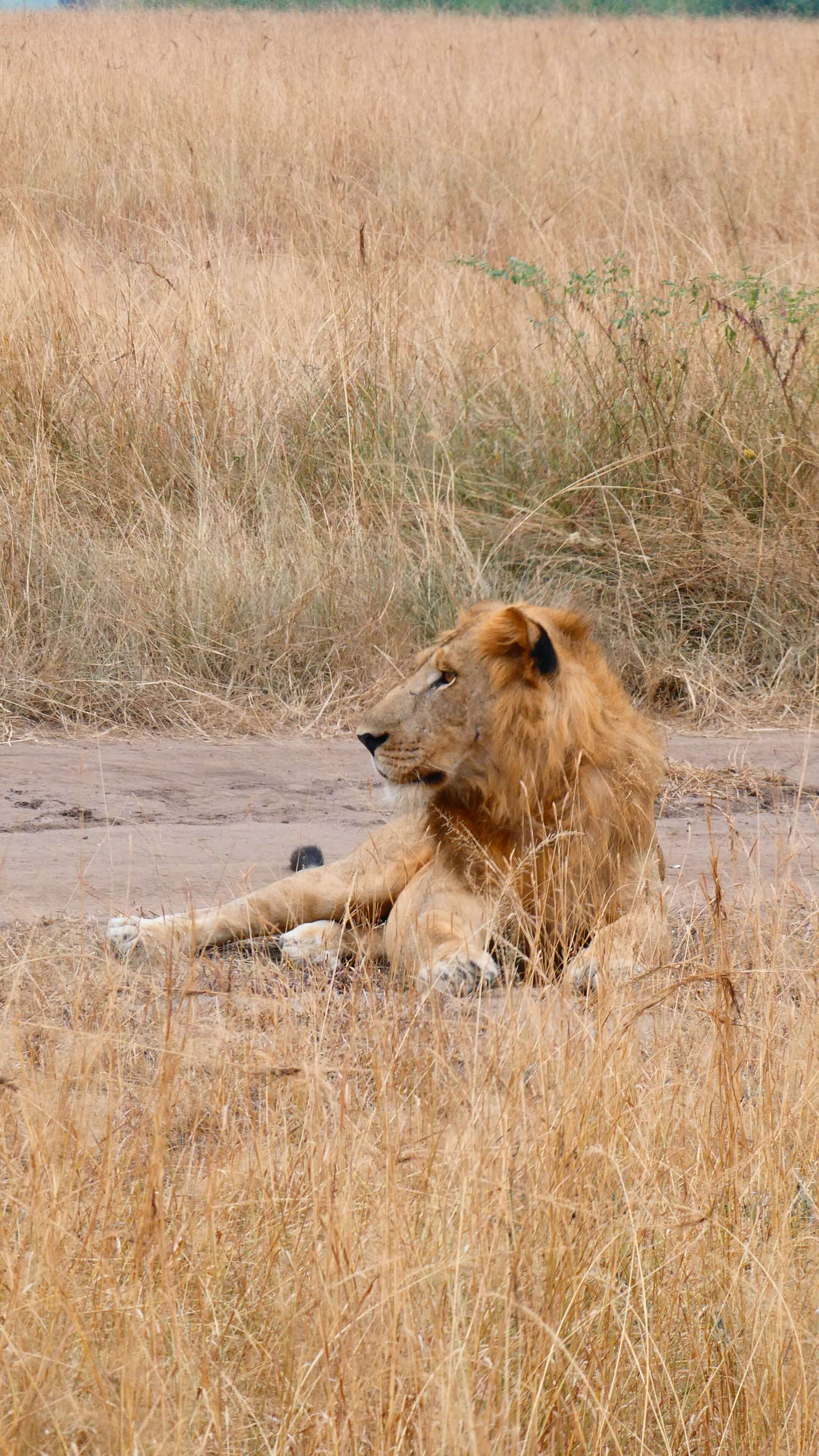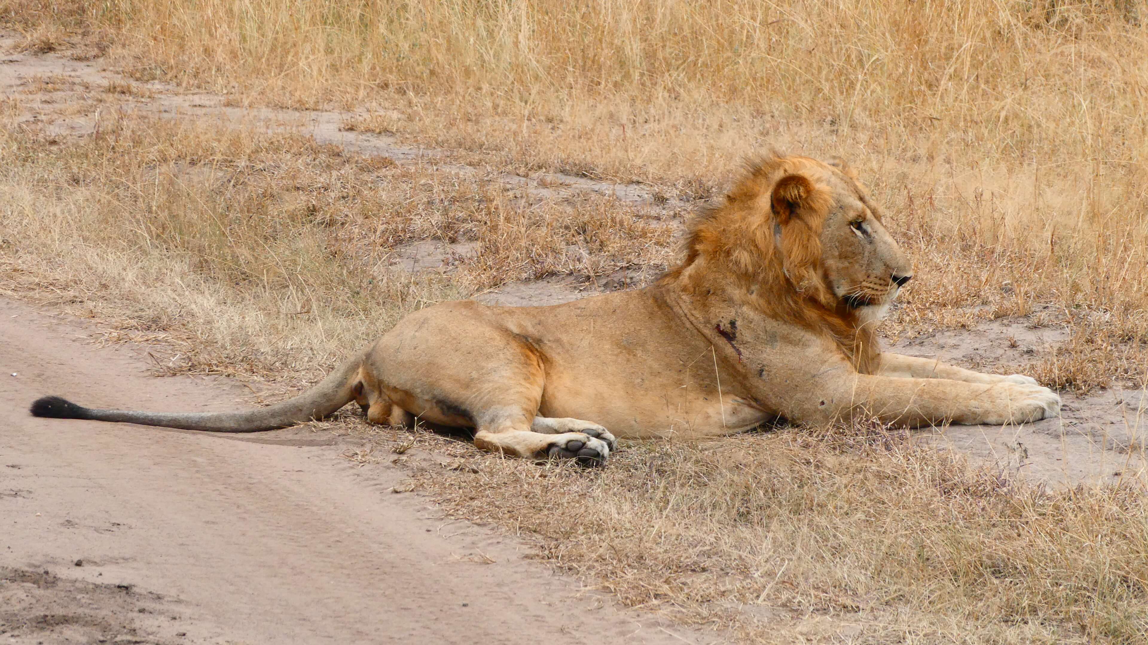 Weiter geht es kreuz und quer. Ronaldo führt uns über Wege, die wir alleine nie fahren gefahren wären. Dann erreichen wir einen Spot, wo schon drei Jeeps in Reihe stehen. Ein Löwenpaar lungert auf und neben der Straße rum. Seine Majestät ist völlig tiefenentspannt, typisch Katze halt.