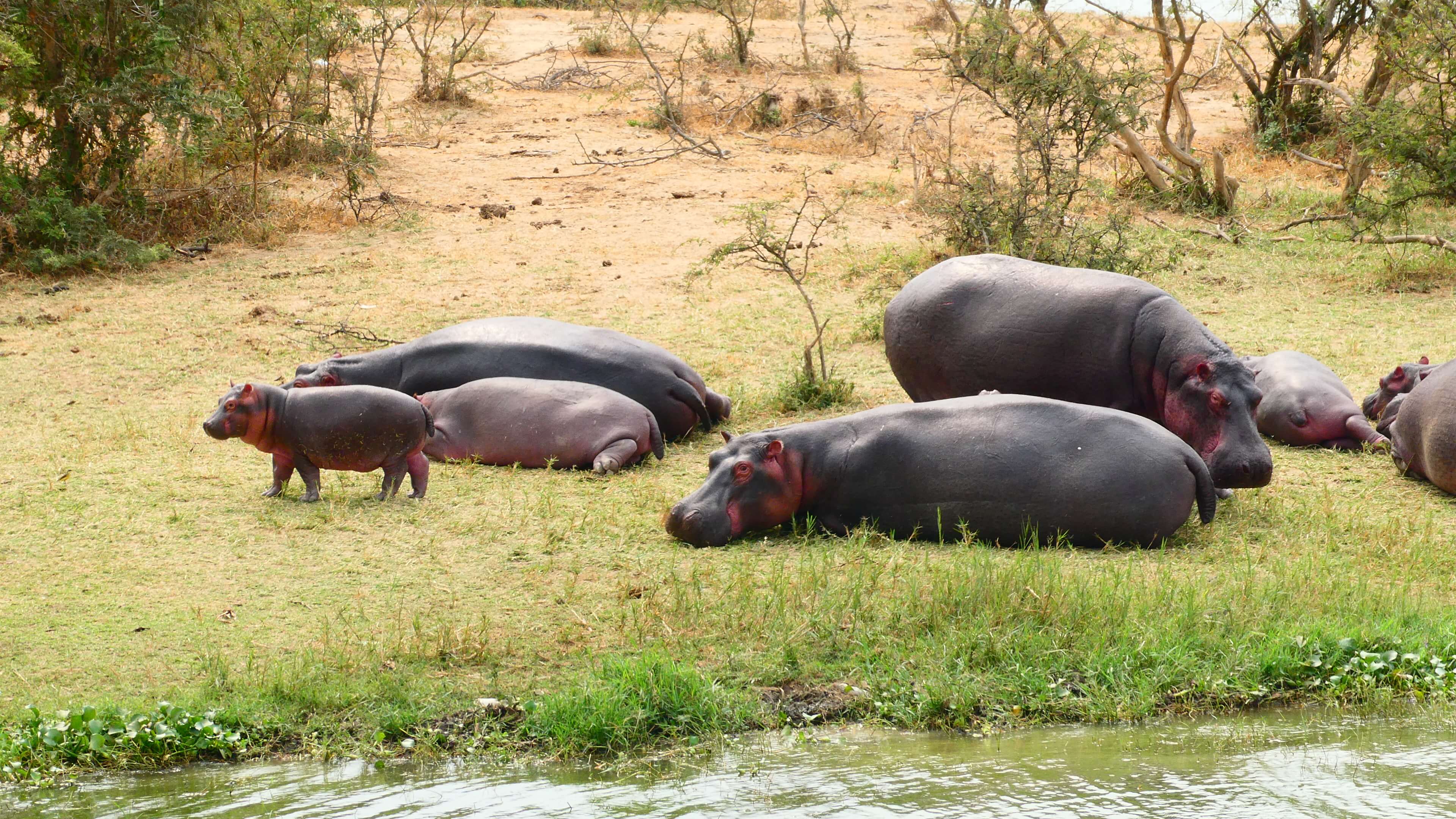 Die Landschaft ist wunderschön – viel offenes Grasland mit kleinen Bäumen und Büschen, dazwischen aber auch immer wieder die großen Akazien und die prächtigen Feigenbäume, auf denen es sich die Baumlöwen – eigentlich in der Mittagshitze – gerne gemütlich machen. Dann wieder schauen wir in die große, tieferliegende Ebene des Rift Valleys mit dem Ishasha-River, dem Grenzfluß zwischen Uganda und dem Kongo.