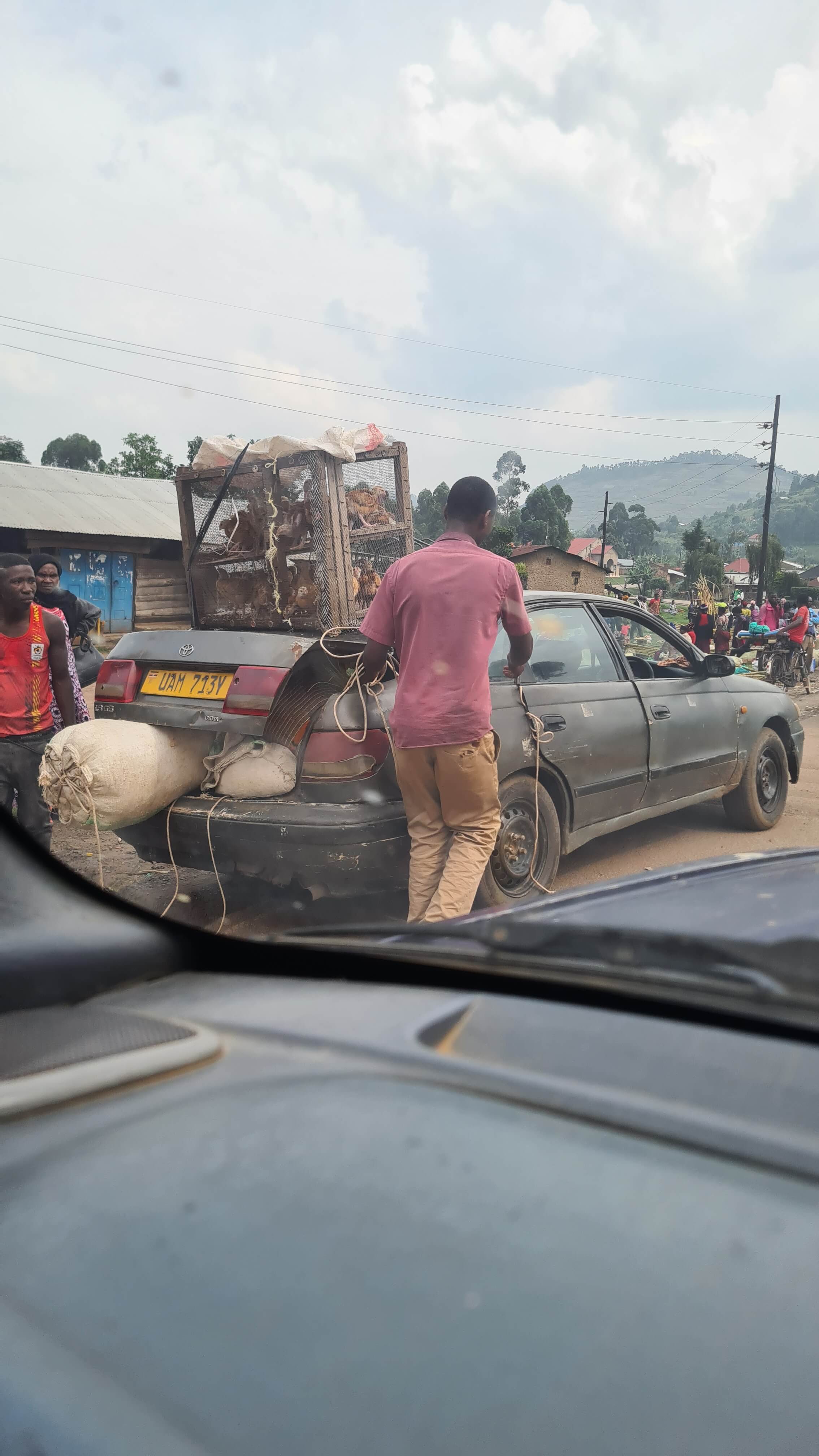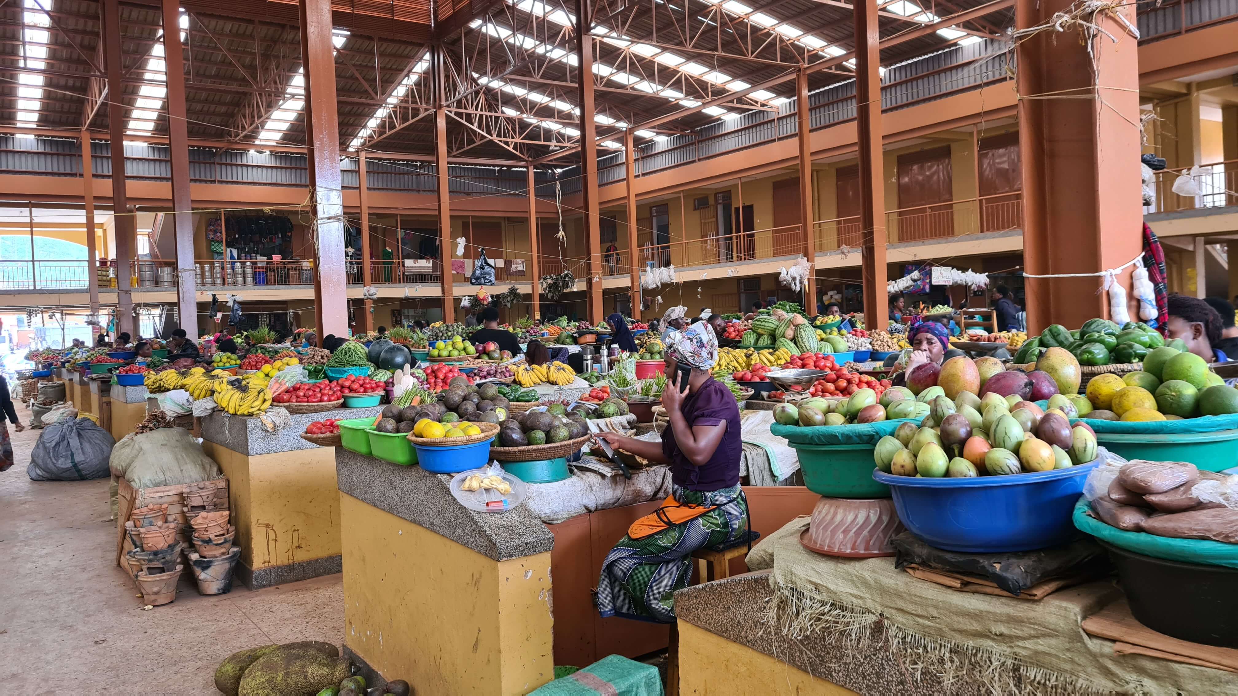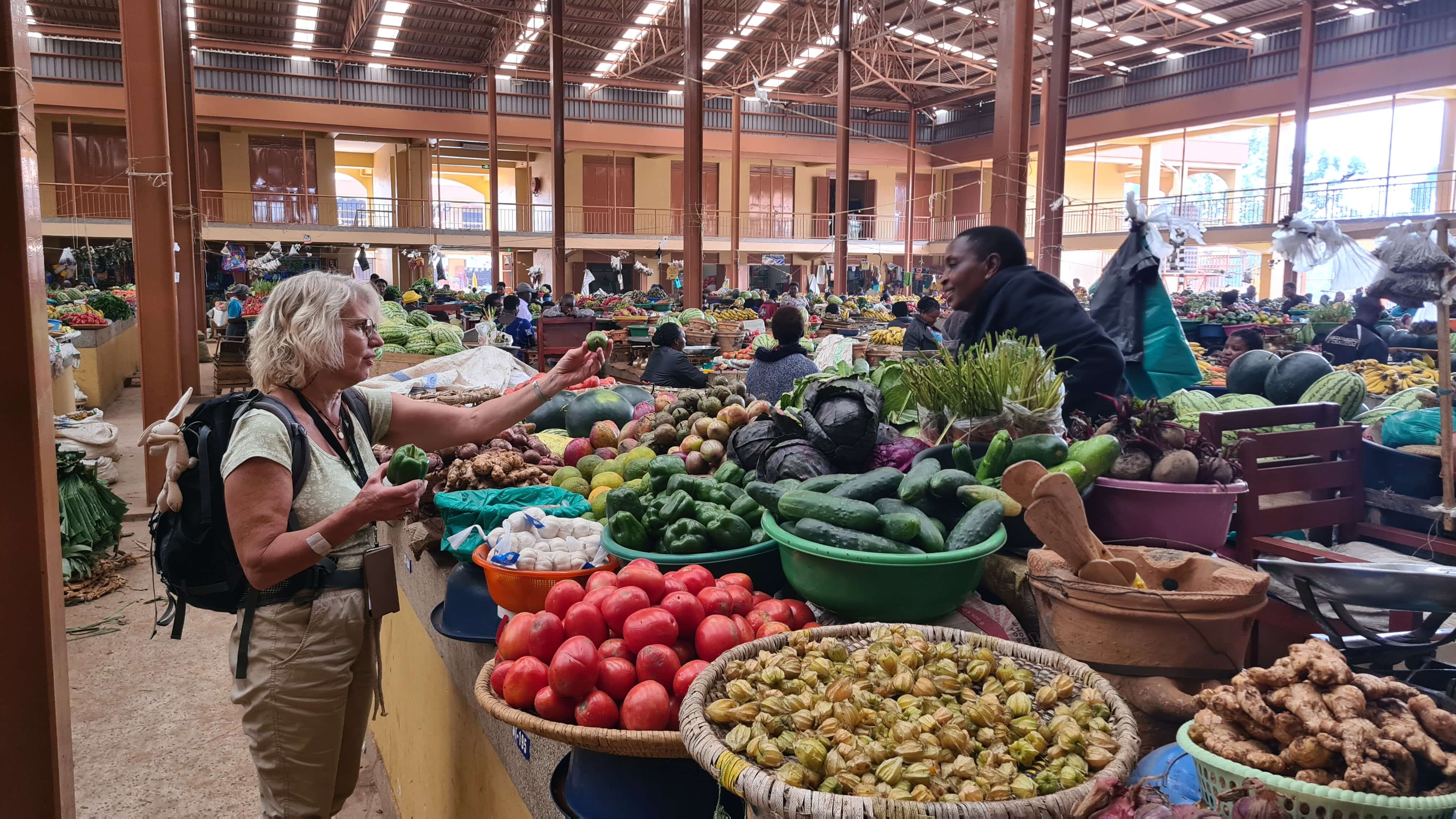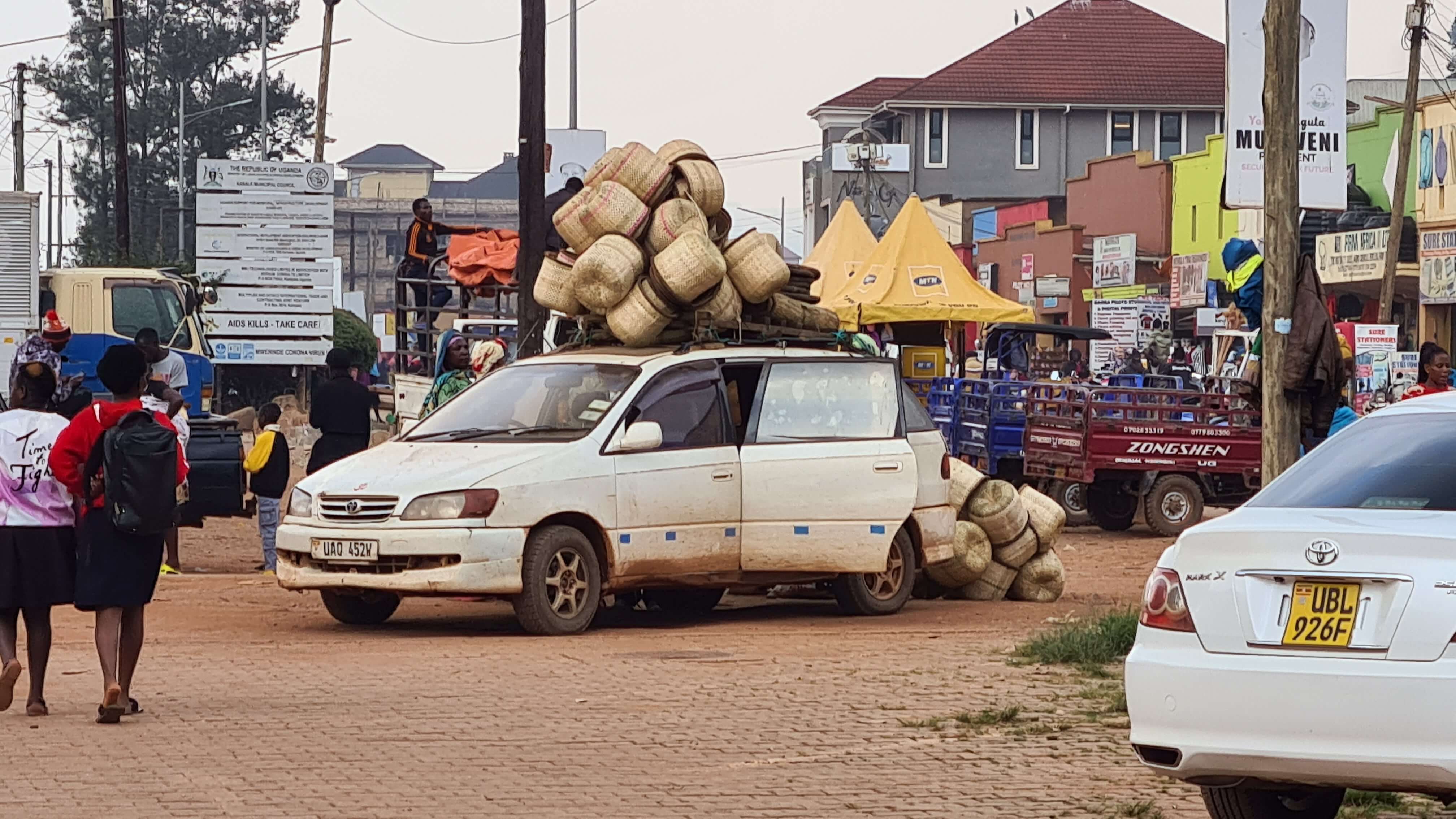 Um 10.30 Uhr sind wir wieder startklar für die Weiterfahrt zum Lake Mburo National Park. Erst geht es über Buckelpisten erneut vorbei an den Steinbrüchen zurück zur Main Road, dann weiter nach Kabale, einer wuseligen, recht adretten Stadt, in der uns die große Markthalle zu einem Stopp einlädt. Ob wir drei Parktickets für je 1.000 UGX löhnen müssen, weil wir Touristen sind oder ob wir damit ein Abo abgeschlossen haben, können wir nicht abschließend klären.