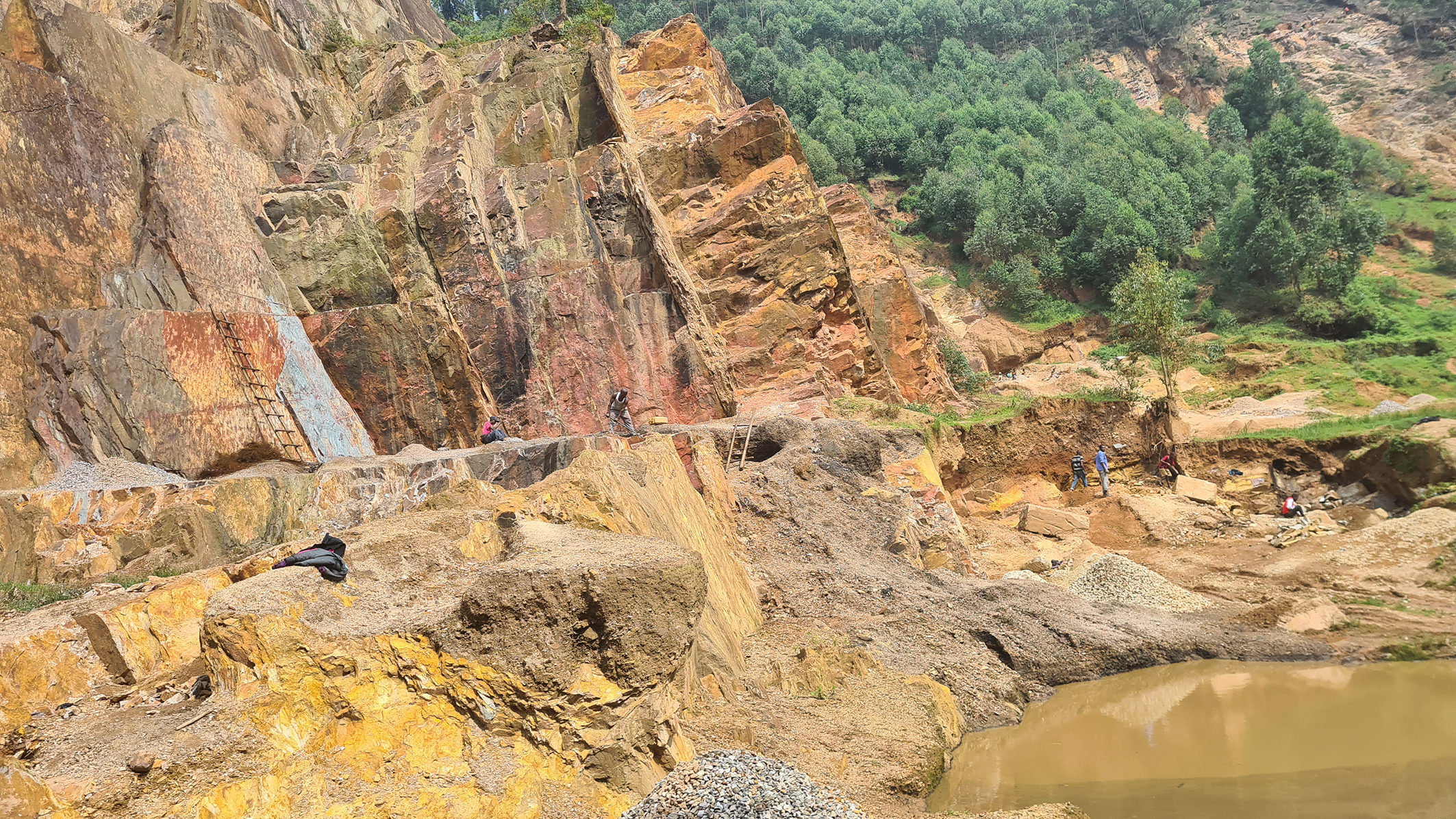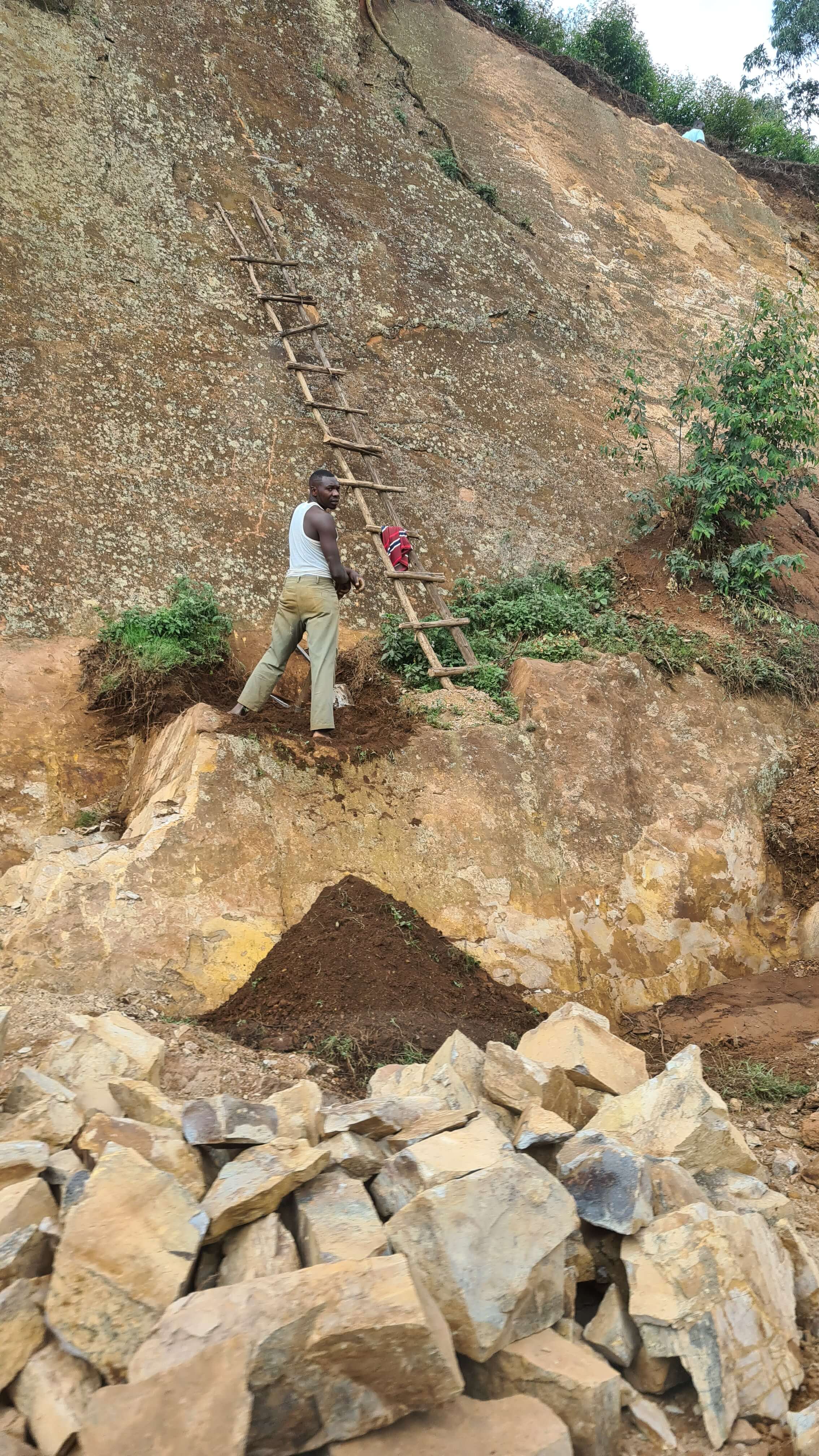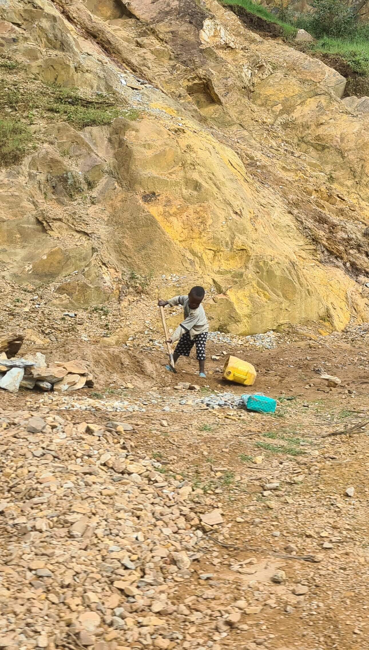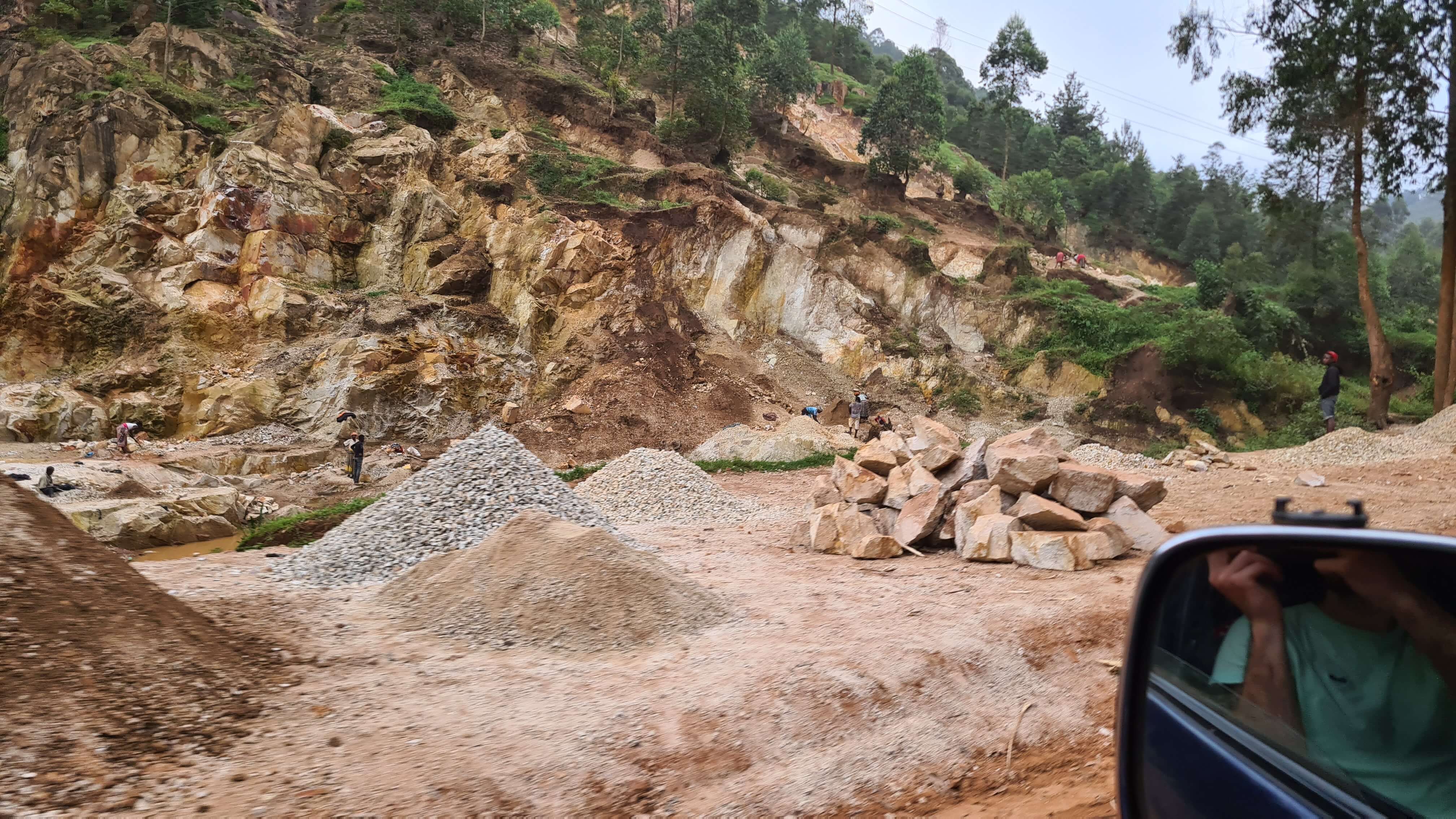 Kurz vor Kabale geht es dann wieder auf die rote Piste durch lichten Wald zum Lake Bunyonyi, vorbei an gewaltigen Steinbrüchen, in denen auch viele Kinder und Frauen Steine klopfen und zerkleinern. Wir wissen eigentlich gar nicht, was in Uganda damit gebaut wird. Die Häuser sind aus Lehm oder Ziegelsteinen und einen Straßen- oder Landschaftsbau gibt es ja nahezu nicht.