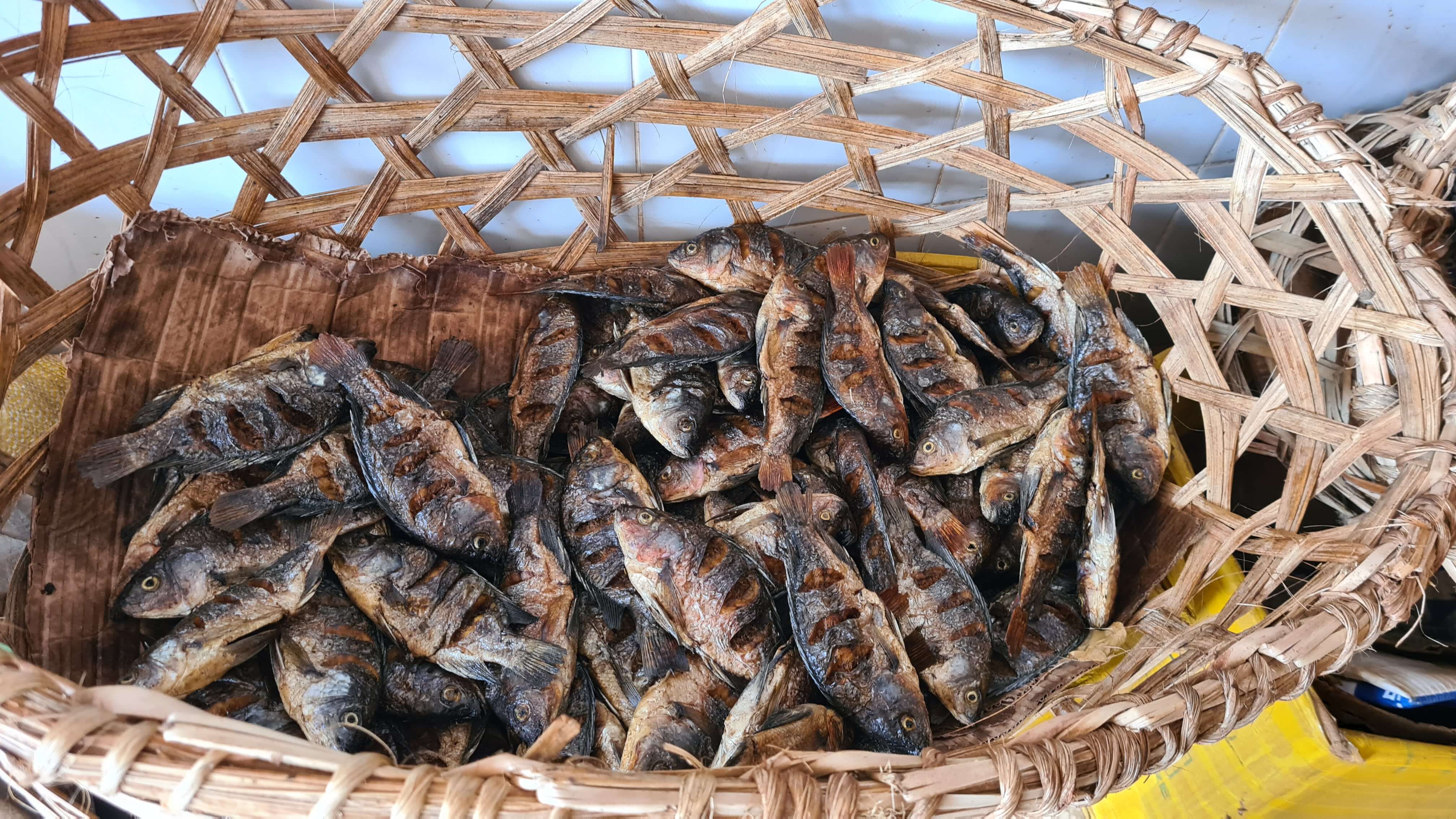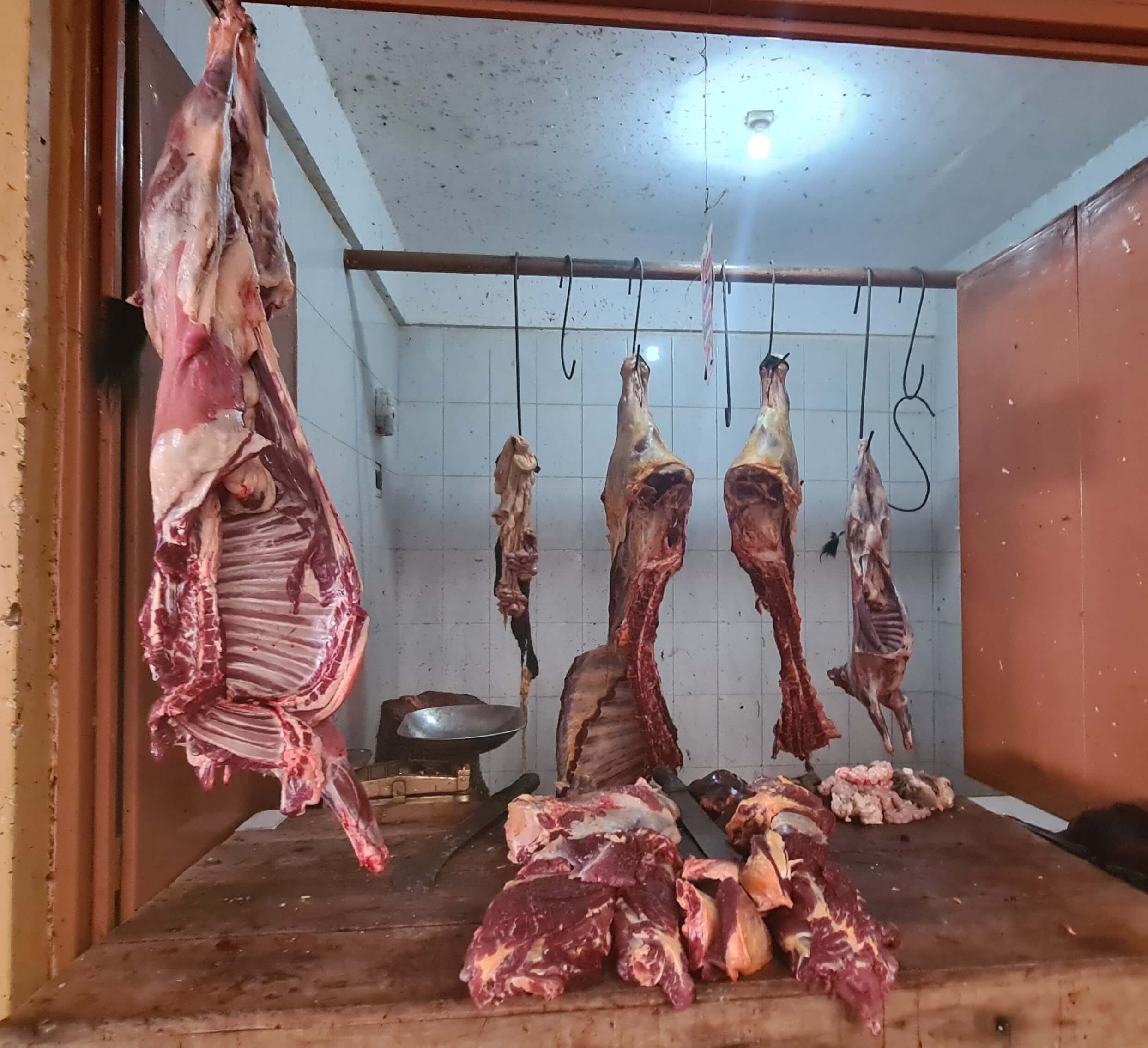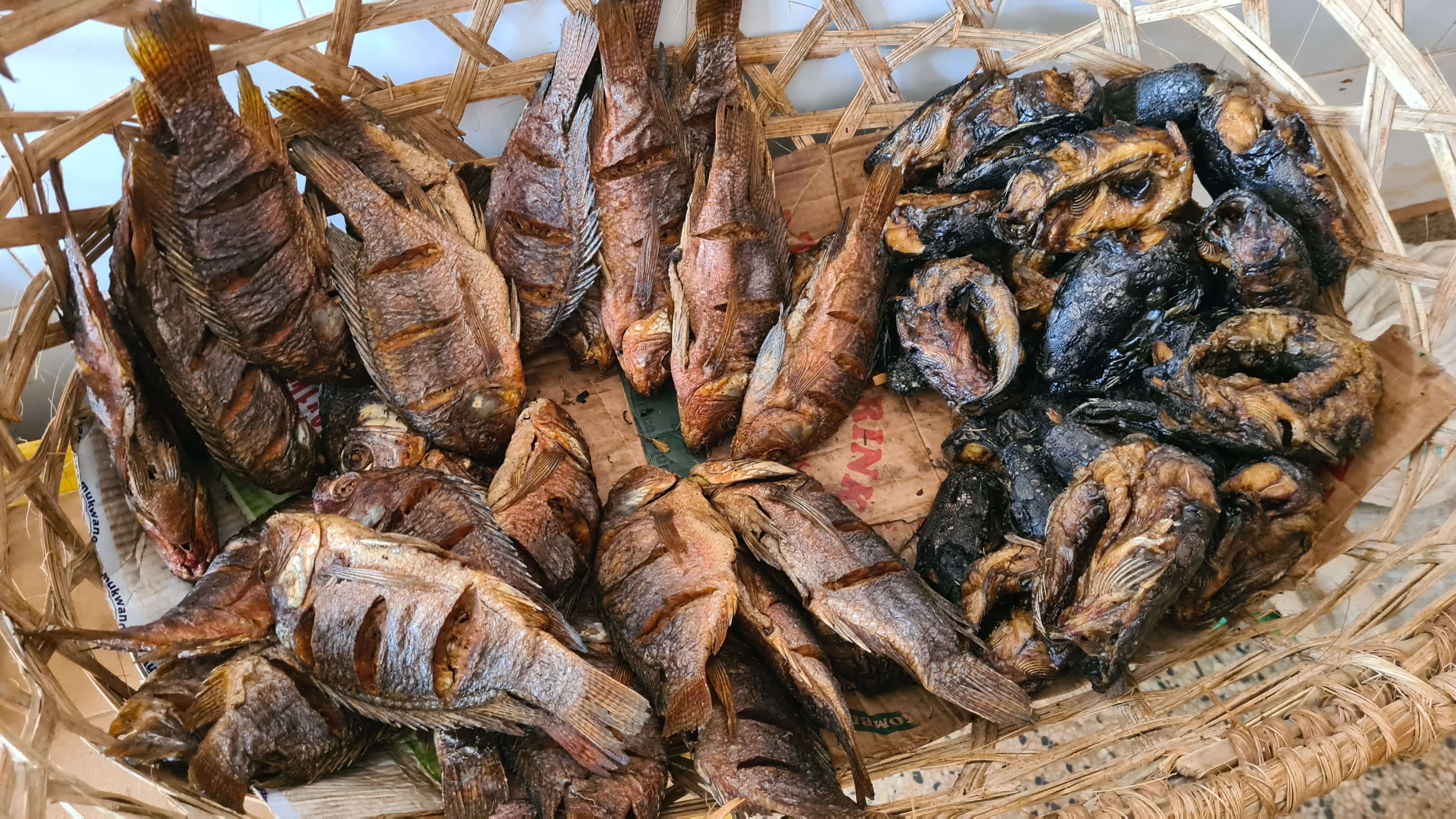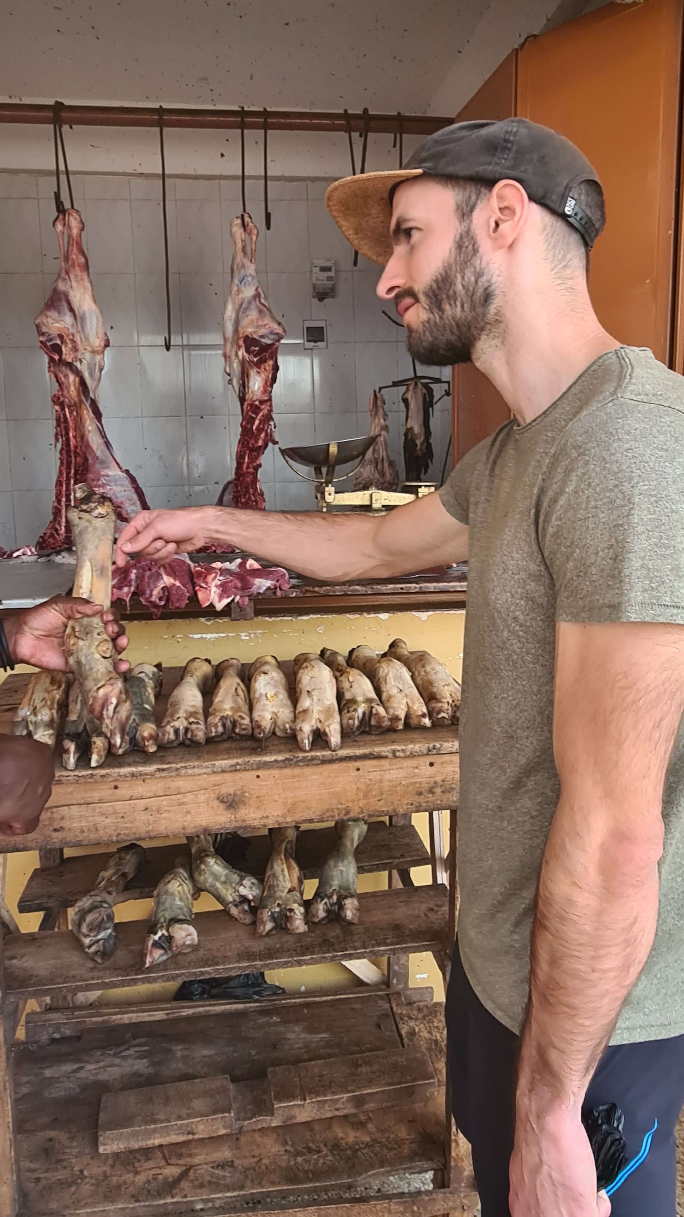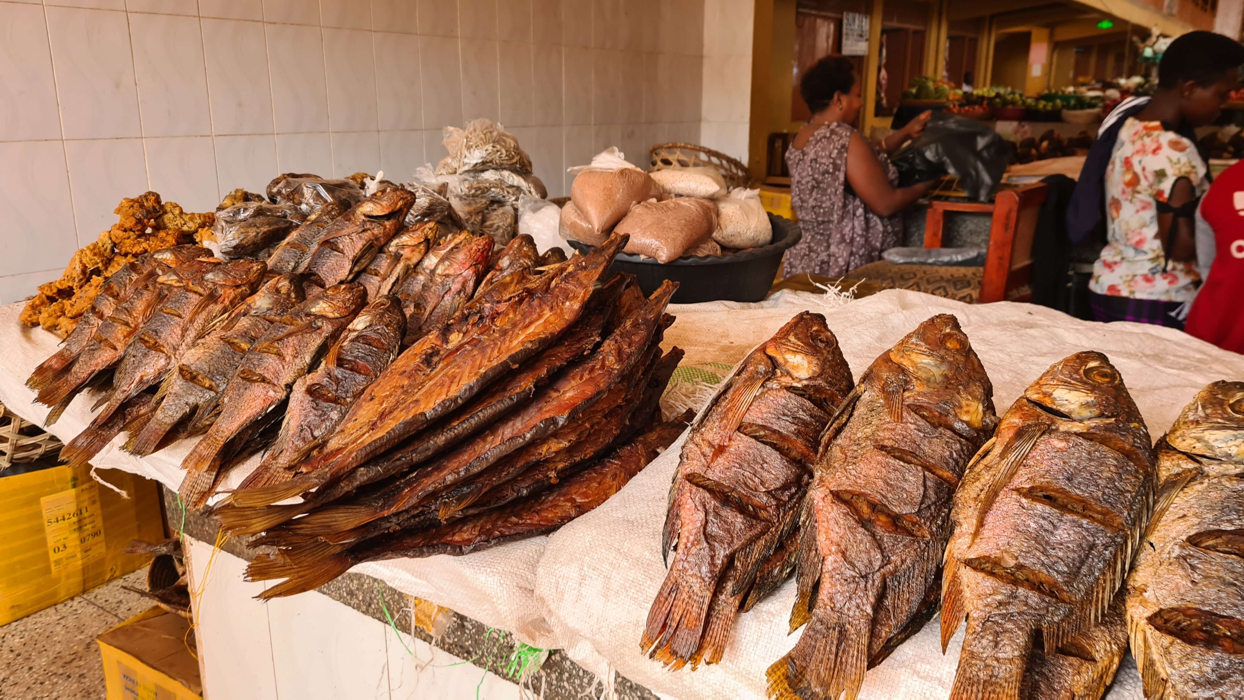 In der riesigen Halle gibt es Obst und Gemüse in Hülle und Fülle. Obwohl wir für die letzten zwei Camptage eigentlich nicht mehr viel brauchen, können wir den Auslagen nicht widerstehen. Die Avocados – dreimal so groß wie daheim und mit 50 ct spottbillig – sind sensationell. Rund um den Veggie-Markt gruppieren sich die Metzger mit ihrer gewöhnungsbedürftigen Fleischbeschau ohne Kühlung. Wir kommen ins Gespräch, die Verkäufer, insbesondere die männlichen, sind sehr offen und freuen sich über unser Interesse. Es gibt Ziege und Kuh und von beiden Tieren wird wirklich alles samt Haut und Haaren verarbeitet. In einer kleinen Ecke finden wir auch etwas geräucherten Fisch … und wenn Matthias nur wolle, wäre auch gleich eine ugandische Ehefrau „im Angebot“.