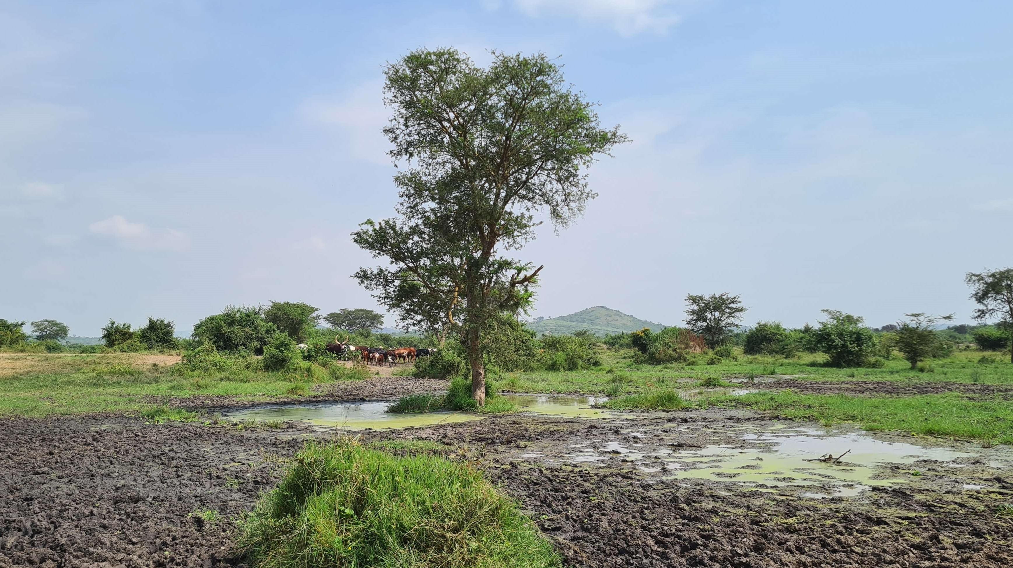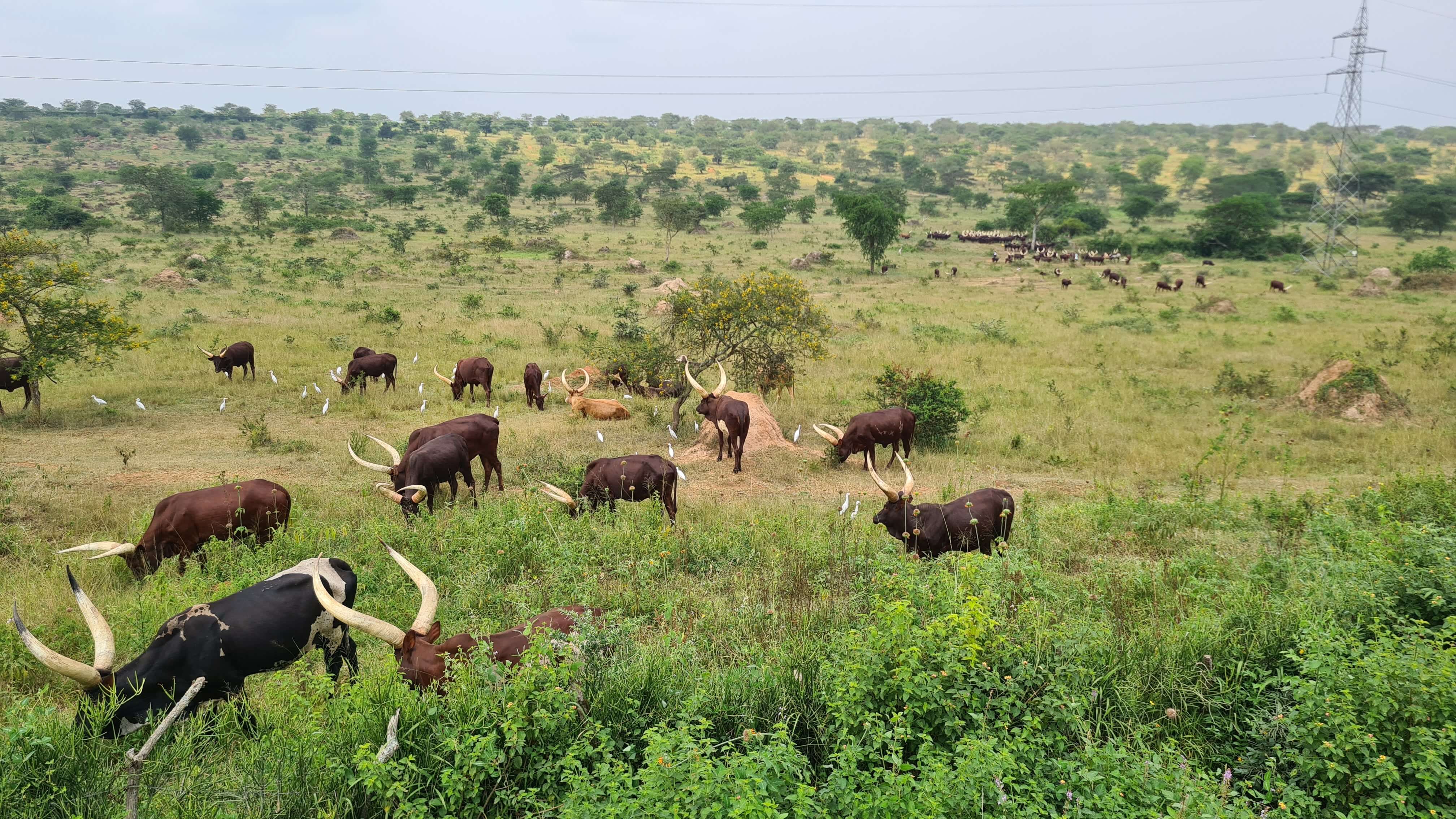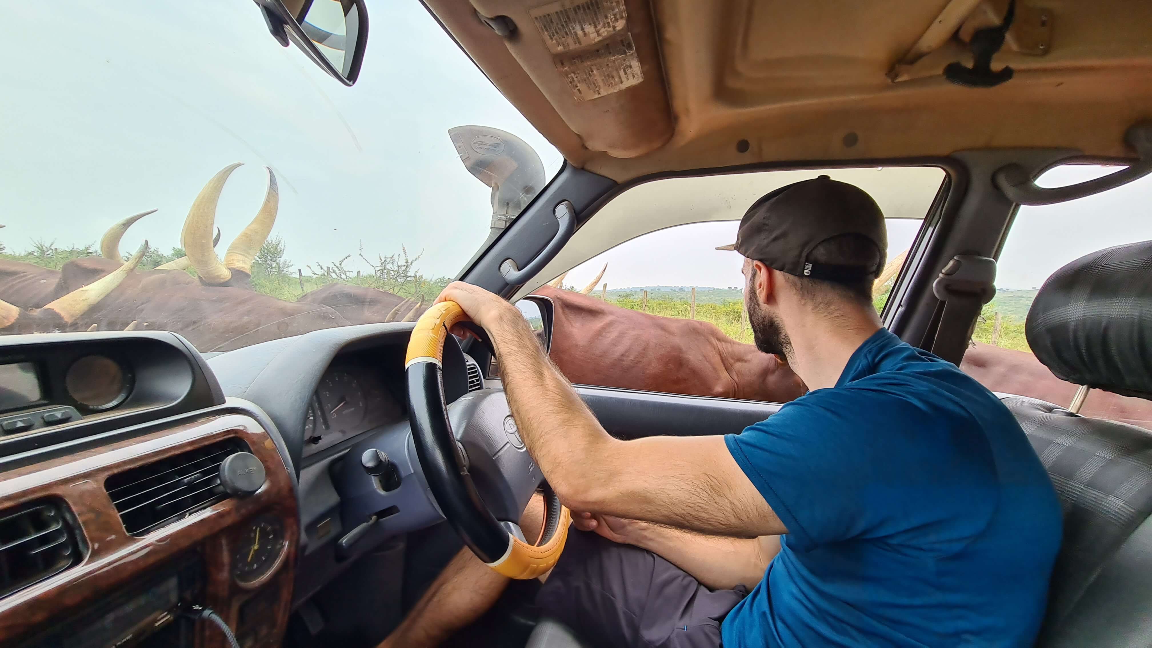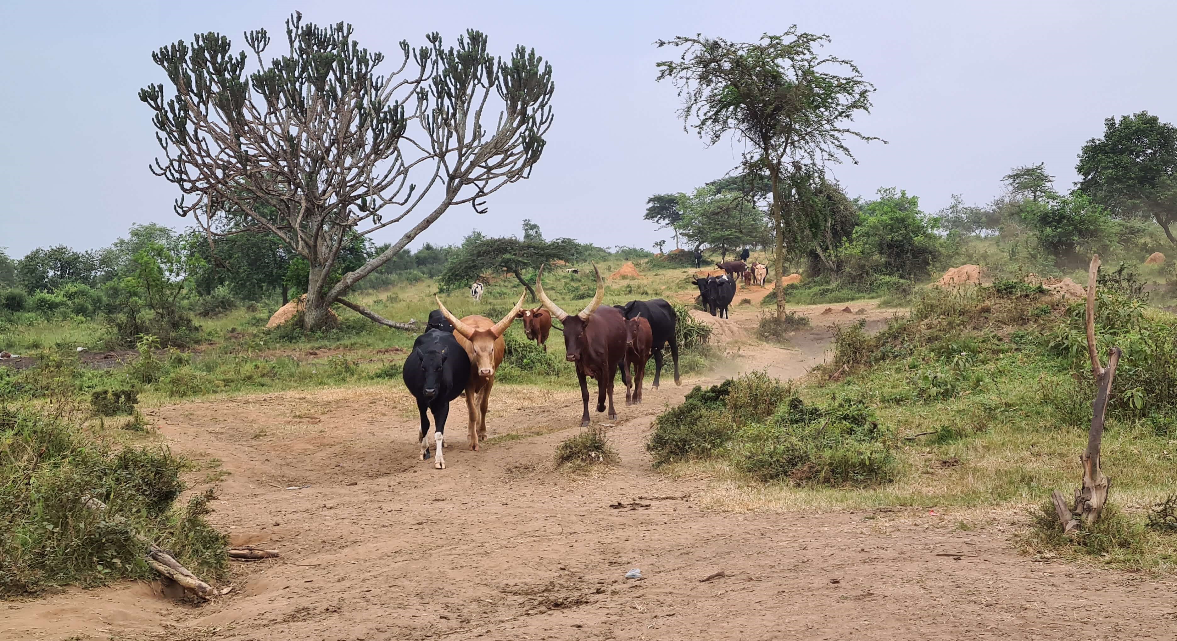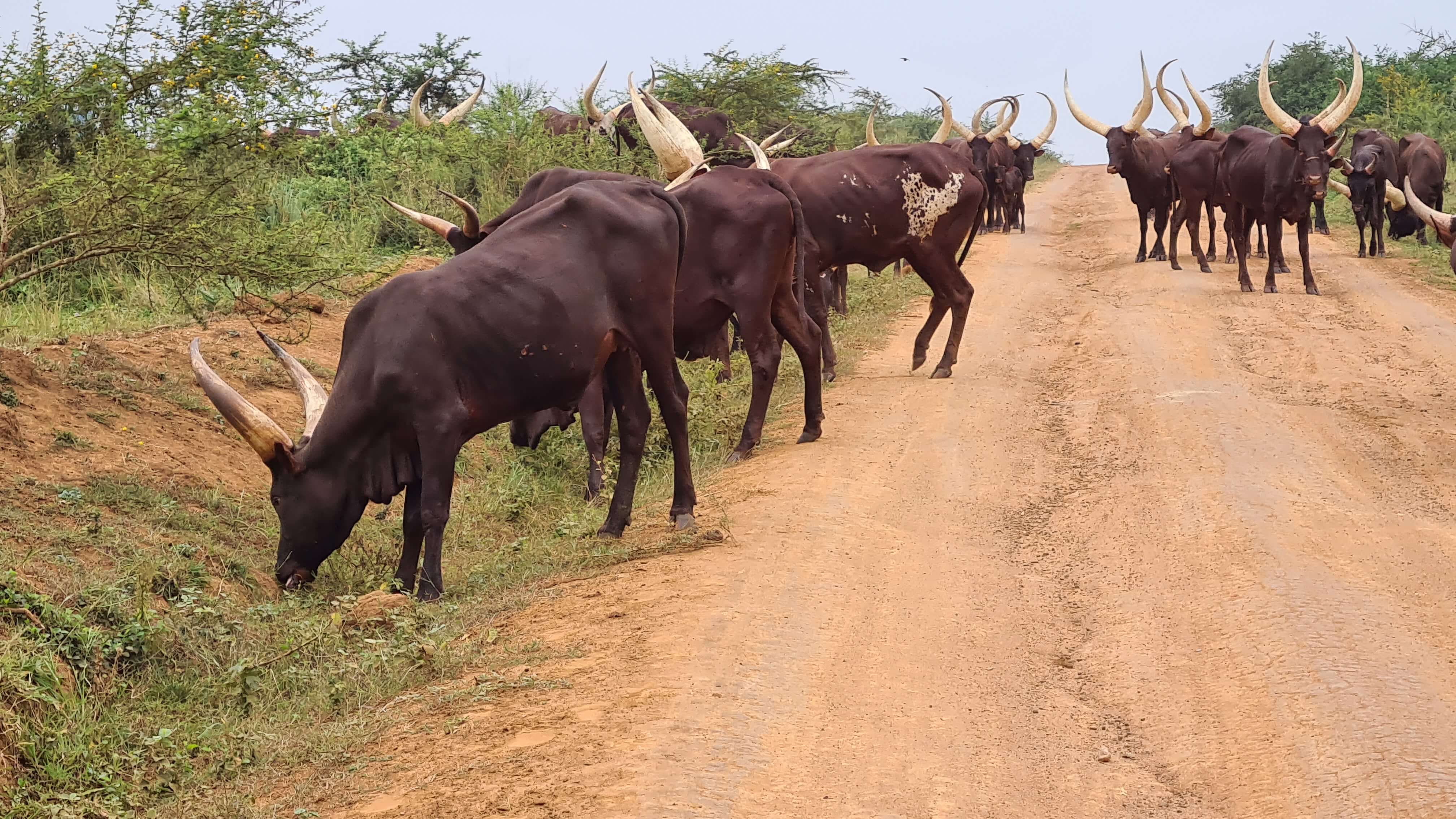 Nach rund 5 Stunden erreichen wir die Zufahrtsstraße zum nicht eingezäunten Lake Mburo National Park. Vor einer einfachen Stangerl-Absperrung wartet ein junger Mann auf uns – in den Händen einen Kanister mit Spritzpistole. Er müsse – kostenpflichtig – die Reifen desinfizieren, das sei vorgeschrieben, erklärt er uns in rudimentärem Englisch. Ehrlich gesagt schaut der Desinfektionsstopp vor der Bohnenstangen-Barriere und mit einer Notunterkunft aus Plastikplanen eher nach einem self-made Geschäftsmodell aus. Aber tatsächlich erfahren wir später im Camp, dass durch die Desinfektion ein Übergreifen der Maul- und Klauenseuche auf den Nationalpark verhindert werden soll, wo nicht nur wilde Huftiere, sondern auch große Herden der wunderschönen Ankole-Rinder zuhause sind.