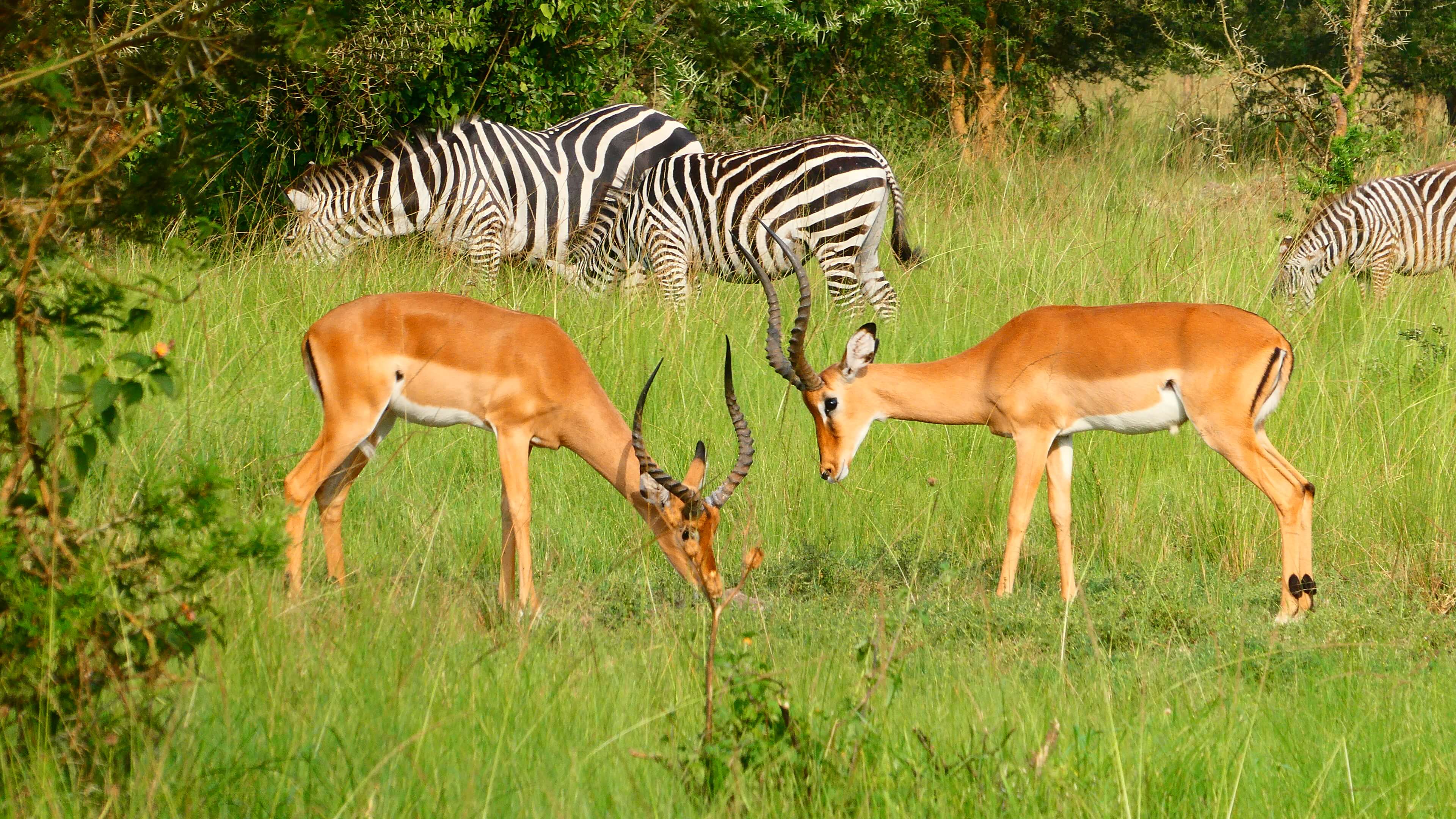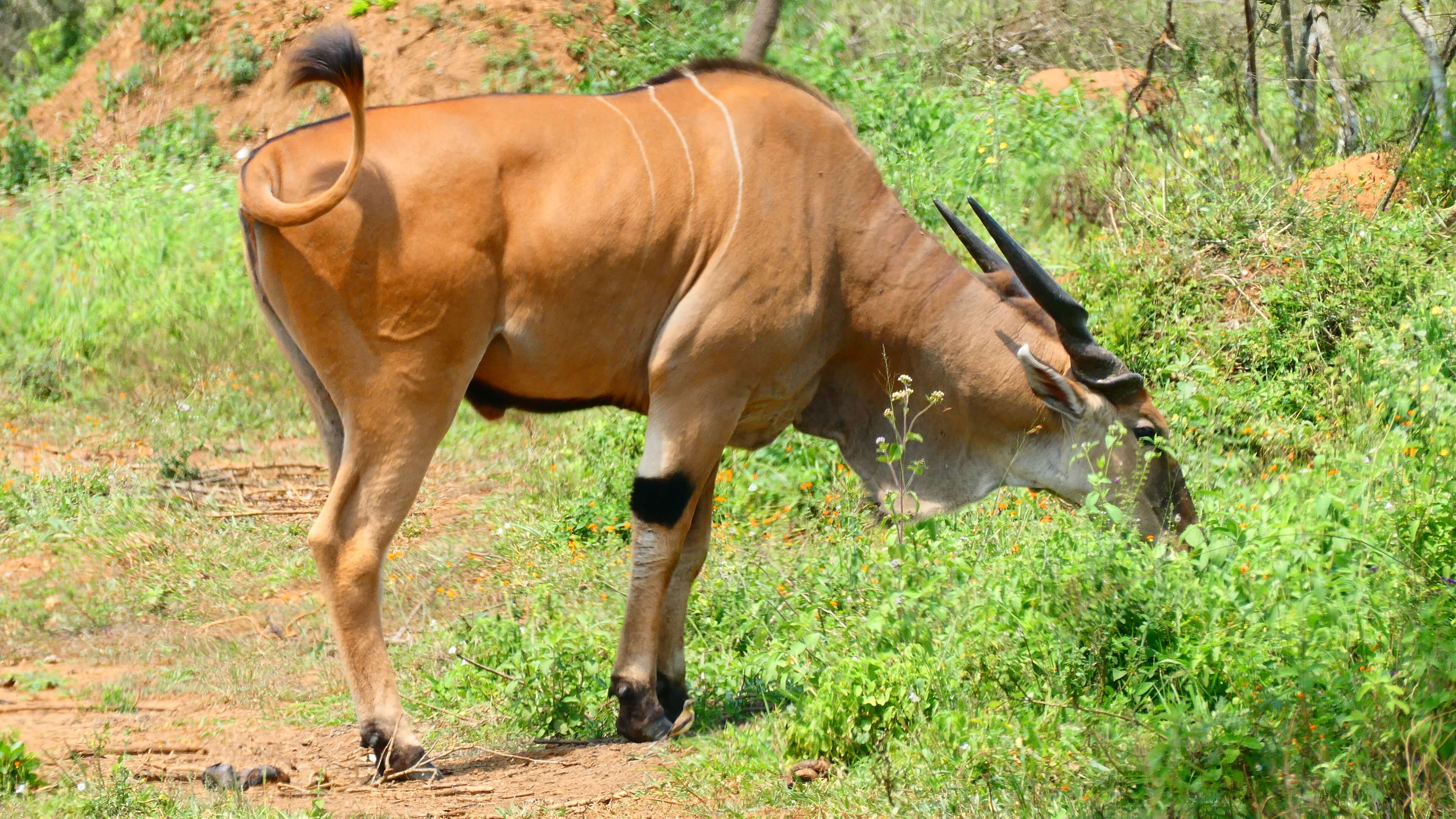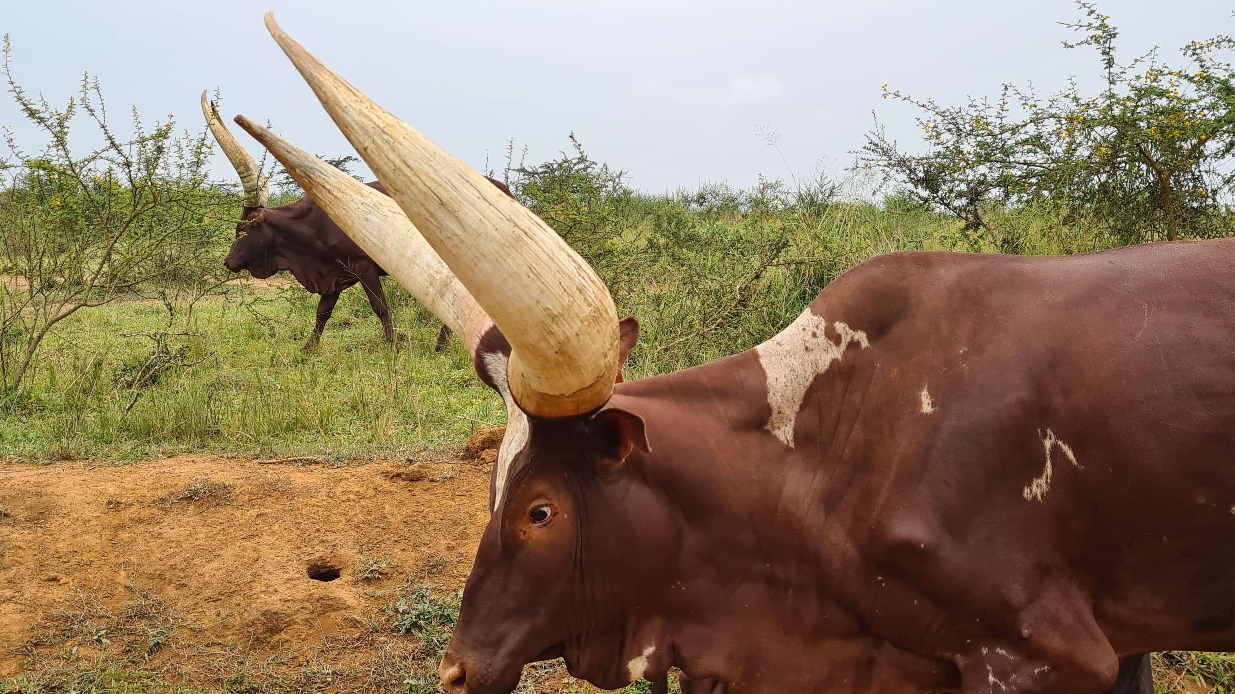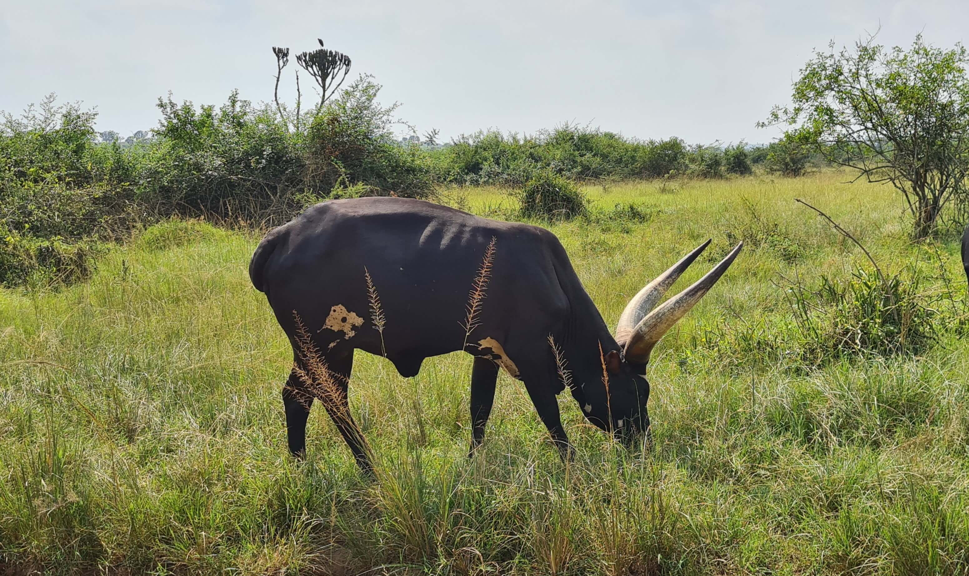 Kaum wohnlich eingerichtet, treffen wir uns um 16.30 Uhr auch schon wieder mit John zu einem Nature Walk. Für schlappe 10 $/Person durchstreifen wir zwei Stunden lang zu Fuß die Wiesen und Weiden, erfahren von John unglaublich viel über Zebras und Impalas – beide Tierarten gibt es in Uganda nur im Mburo und im Kidepo Nationalpark – und auch über die Ankole-Rinderzucht. Es ist fast noch schwieriger diese Longhorn-Rinder zu fotografieren, als das scheue Eland (Riesenantilope) vor die Linse zu bekommen. Denn die Farmer und Hirten werden richtig aggressiv, wenn man ungefragt Fotos der anmutigen Tiere macht, da oft genug damit Geschäfte gemacht werden und sie dabei leer ausgehen.
