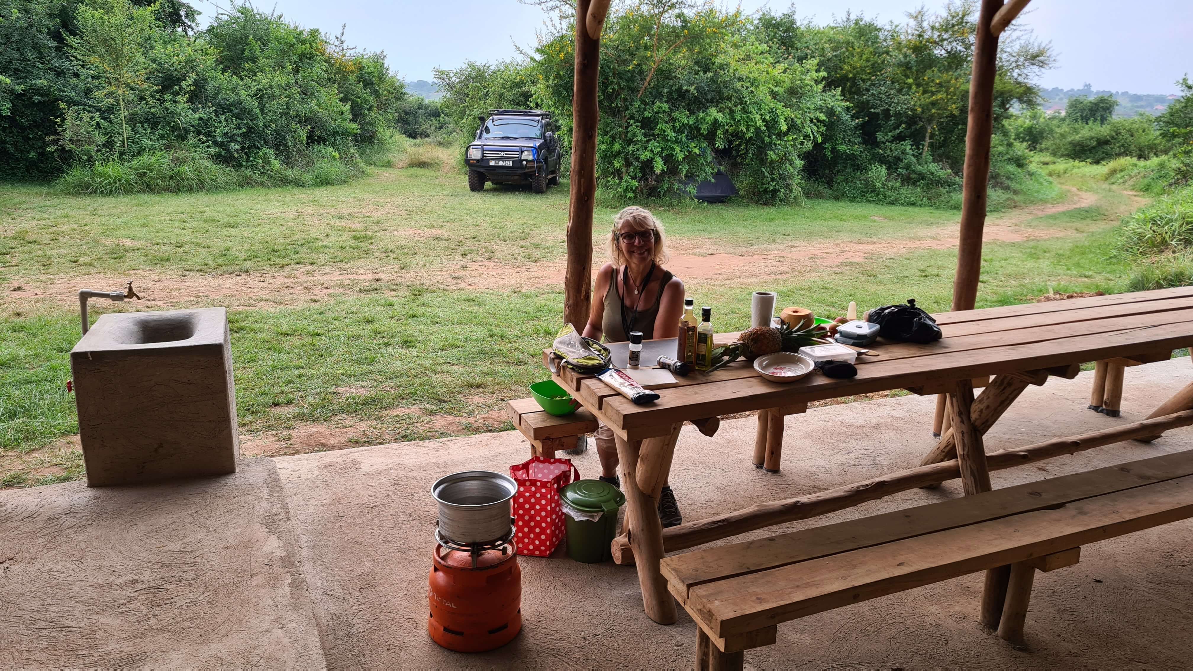 John hat – wie eigentlich alle Guides, die wir hatten – eine ganz herzliche Art und Weise, uns die Schönheit der Natur im warmen Licht der untergehenden Sonne nahe zu bringen. Jetzt wird es aber Zeit fürs Duschen und Kochen. Schon ziemlich müde schmeißen wir in der tollen Picknick-Area den Gaskocher für Spaghetti mit Avocadosoße an. Auch das Frühstück und der Mittagssalat für den morgigen Safari-Tag wollen vorbereitet sein. Im Finstern liefert dann doch tatsächlich noch ein Motorradfahrer ein neues Zelt für uns an! Unglaublich, die Lieferung erfolgte erst mit dem Matatu von Entebbe nach Lyantonde (225 km) und von dort mit Boda-Boda in unser Camp (26 km einfache Strecke). Vermutlich werden wir es noch nicht einmal brauchen, denn wie uns John sagte, hat es in der Region seit Wochen nicht mehr geregnet und der Nachthimmel zeigt sich auch fast sternenklar.