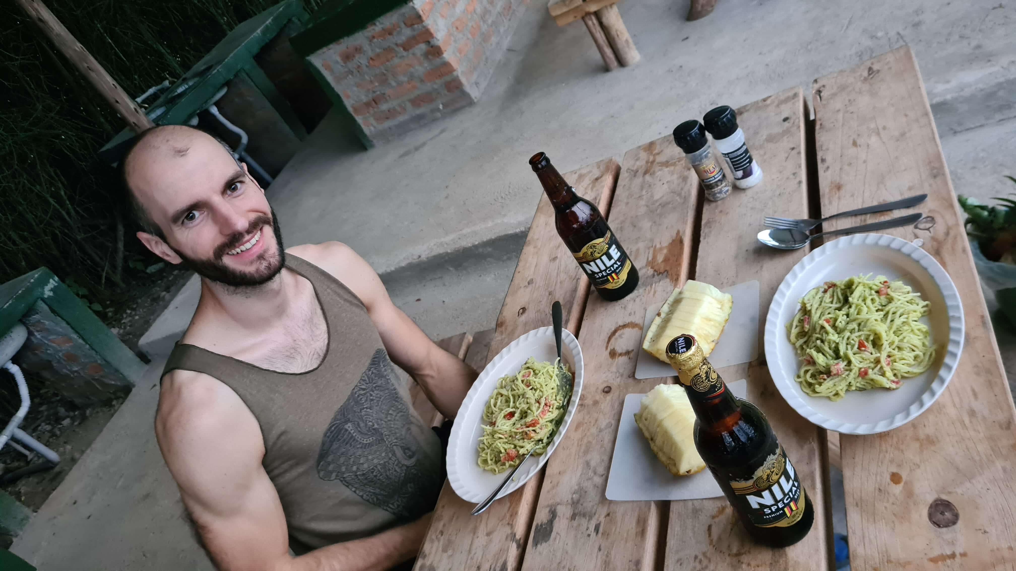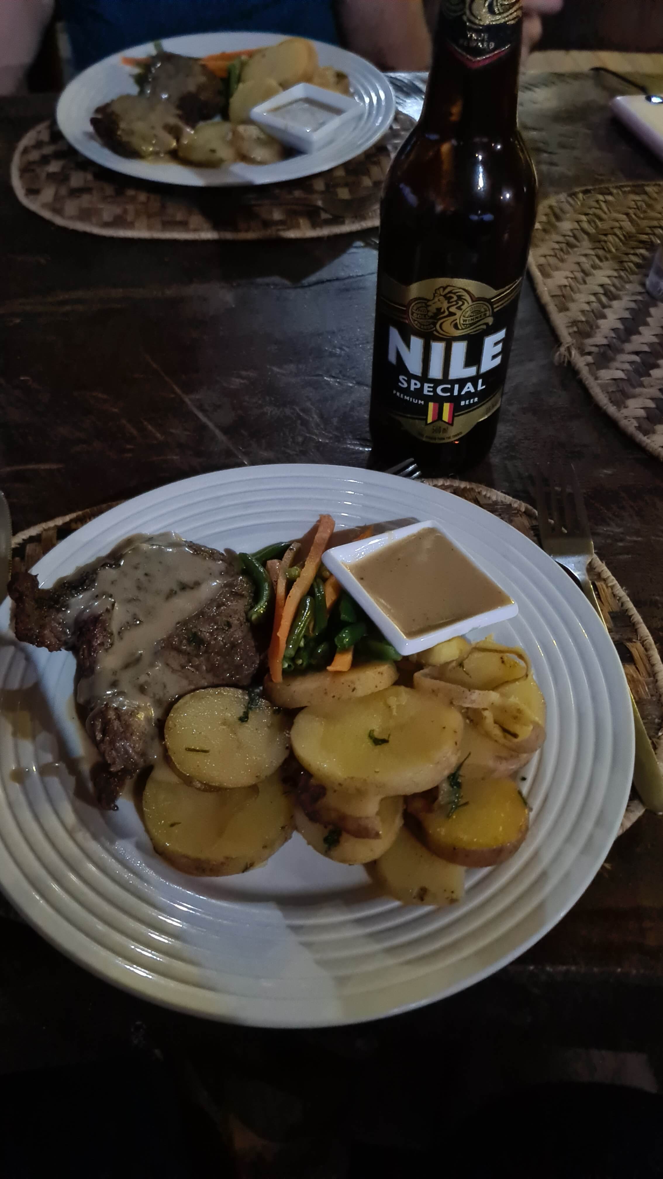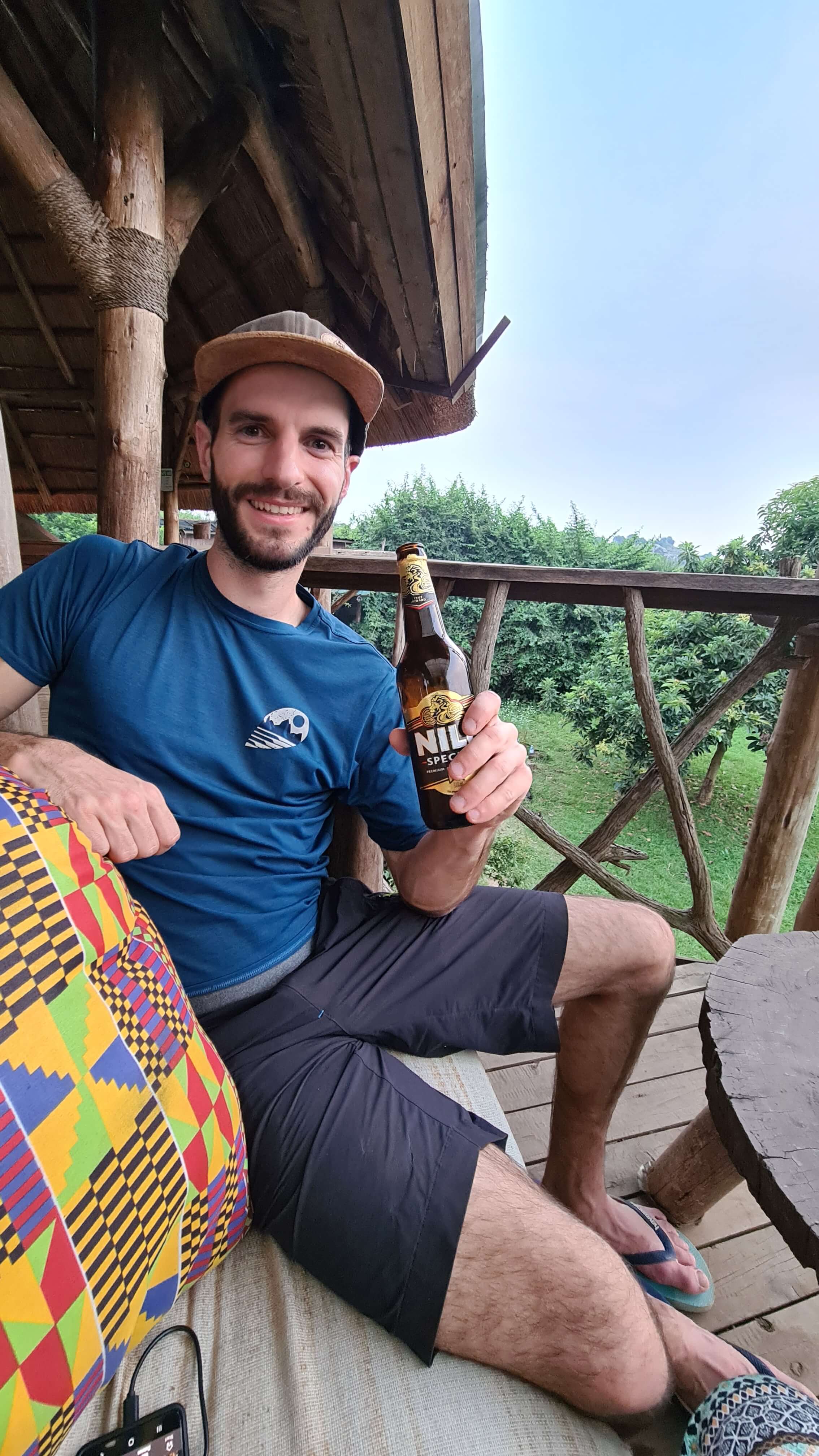 Ach, das war ja nochmal ein vorzüglicher Safari-Tag in Uganda. Heute bleibt unser Gaskocher kalt und wir lassen uns mit einem vorzüglichen 3-Gänge-Menü in dem wunderbaren Freiluft-Restaurant des Leopard Rest Camps verwöhnen, wobei die abendliche Dosis Nile Bier natürlich auch nicht fehlen darf.