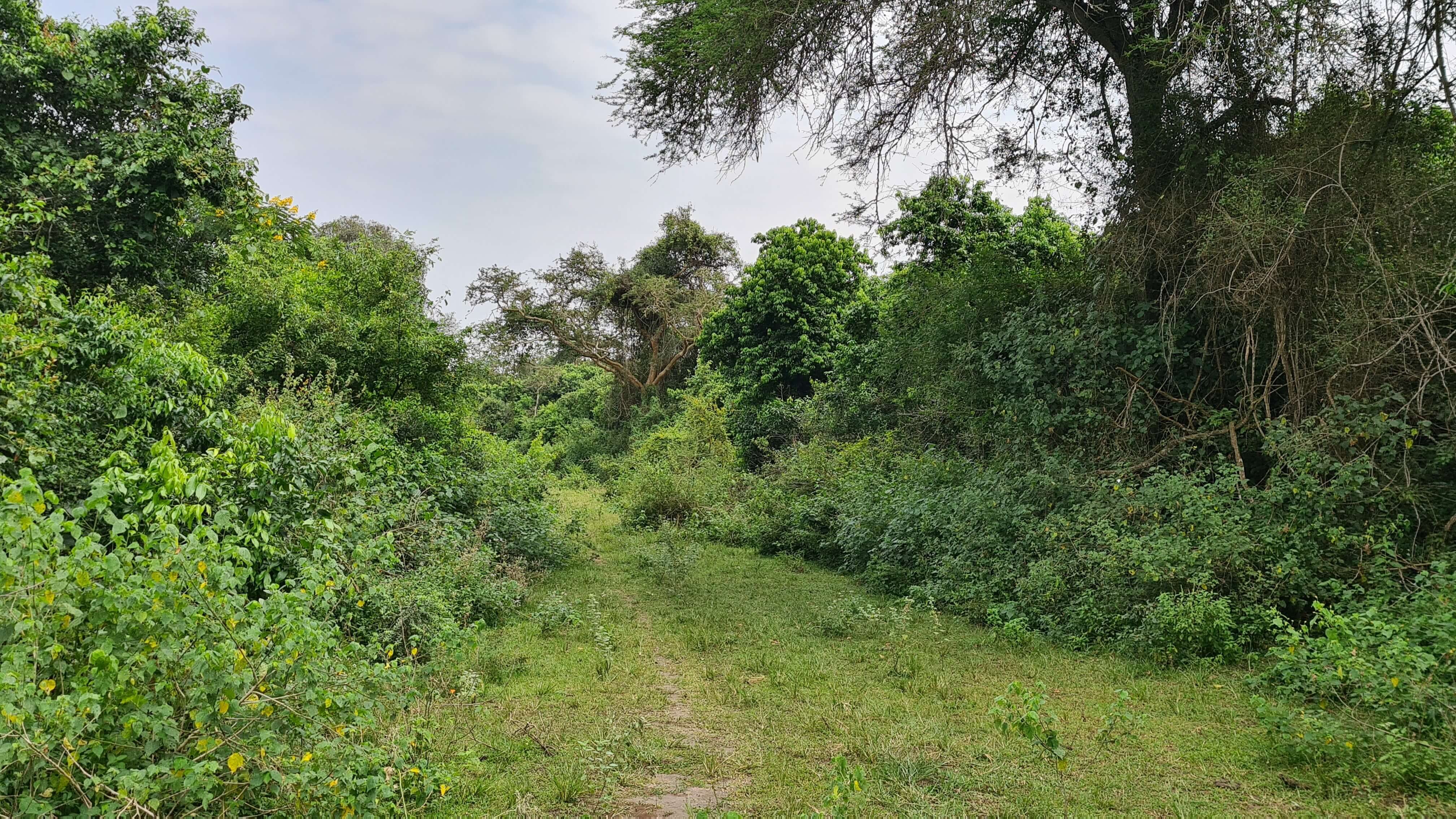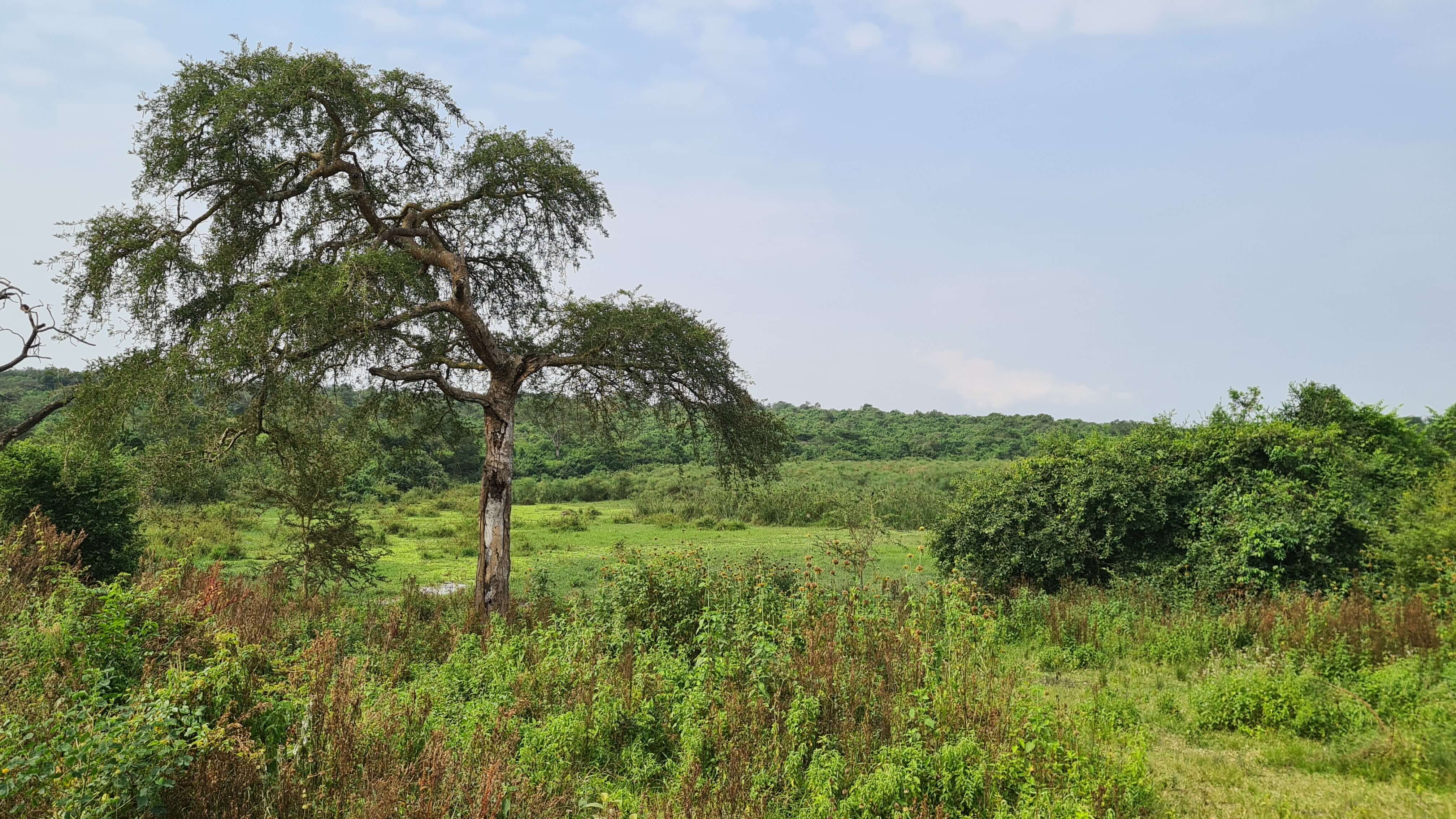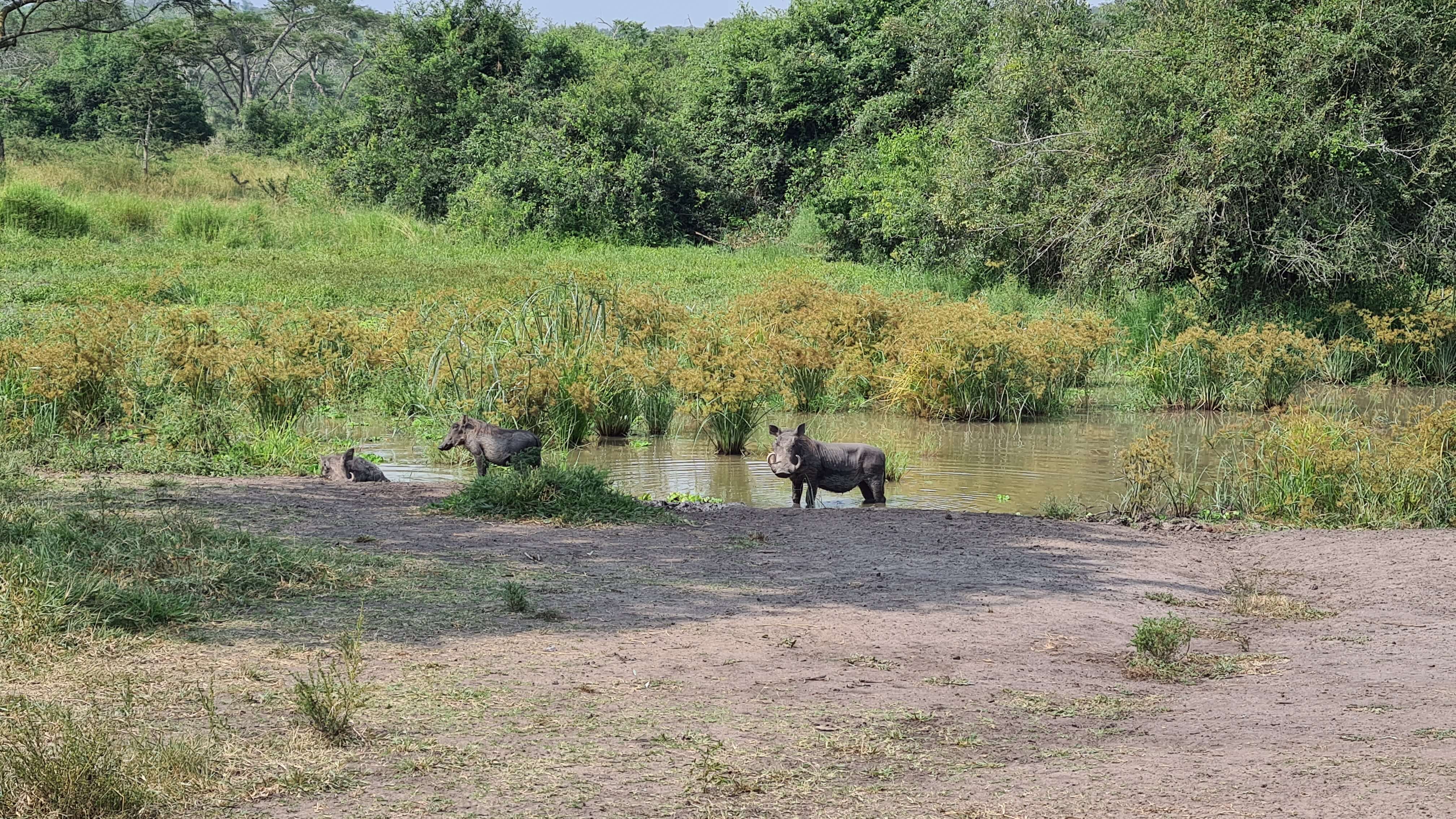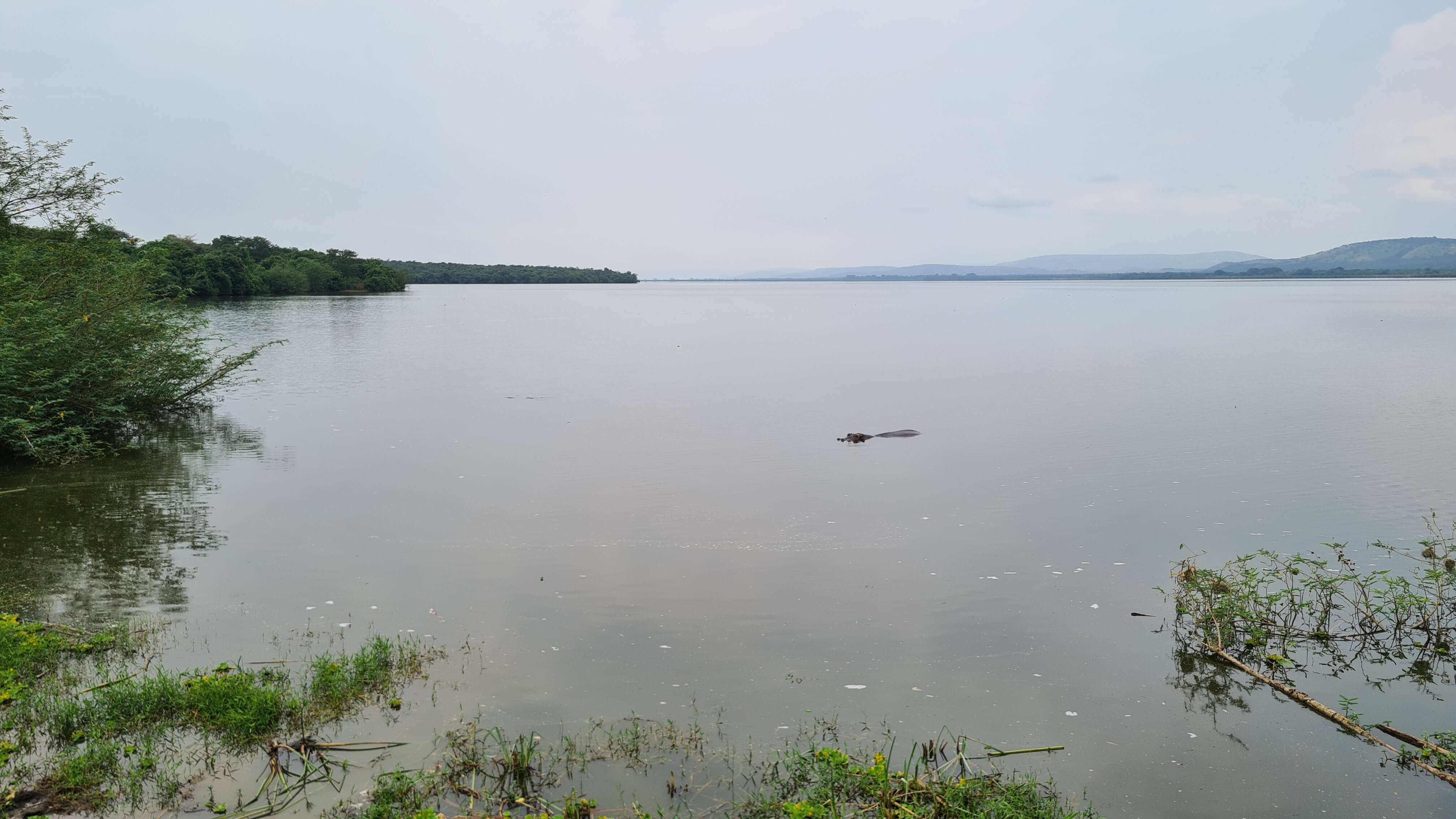 Gerne würden wir näher an den See, um die Nilpferde, die wir hören, auch zu sehen. Aber das ist fast unmöglich und in Anbetracht des Krokodils, das wir von unserem Frühstücksspot aus ins Wasser spurten sehen, vielleicht doch nicht so wünschenswert.