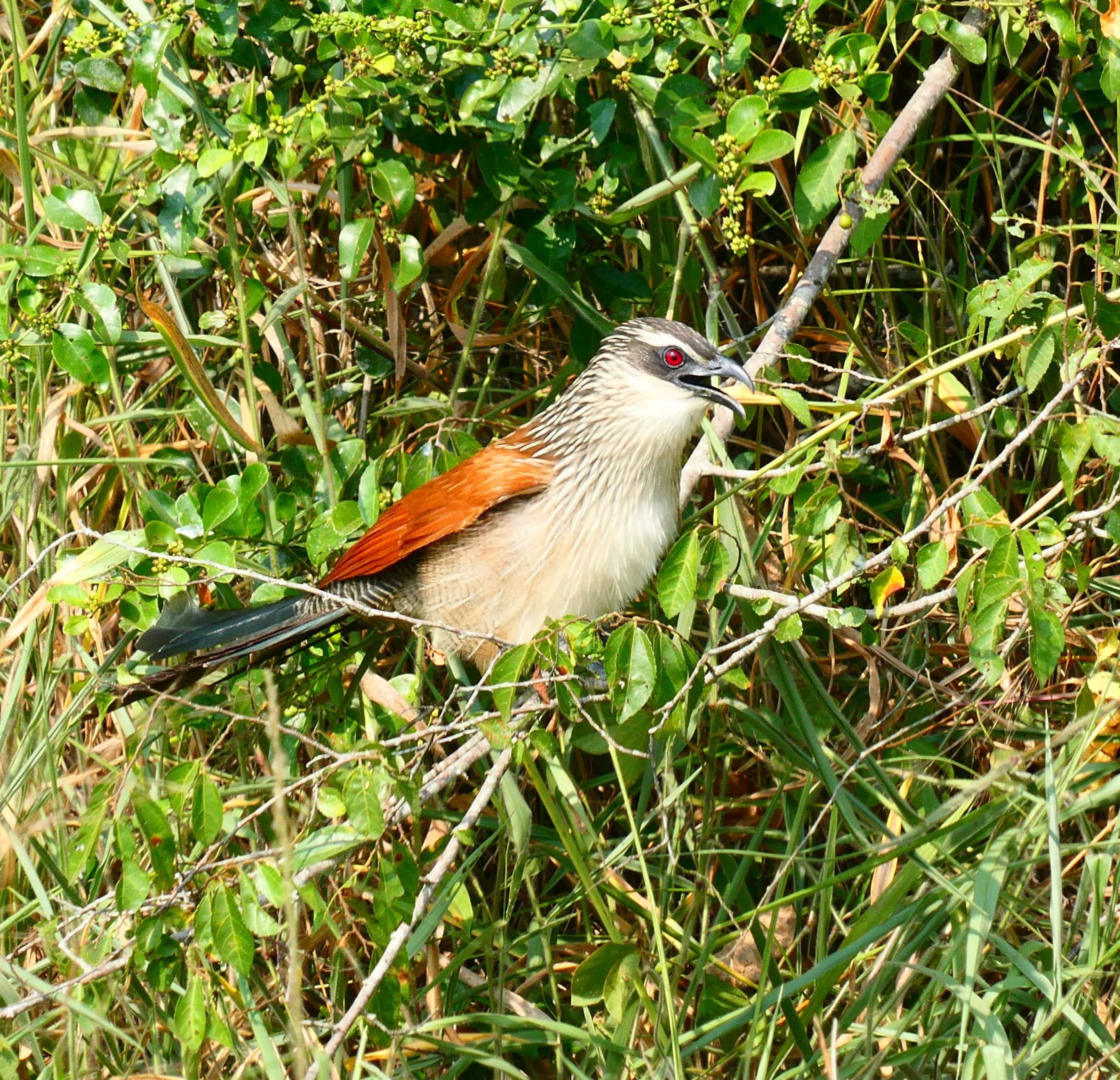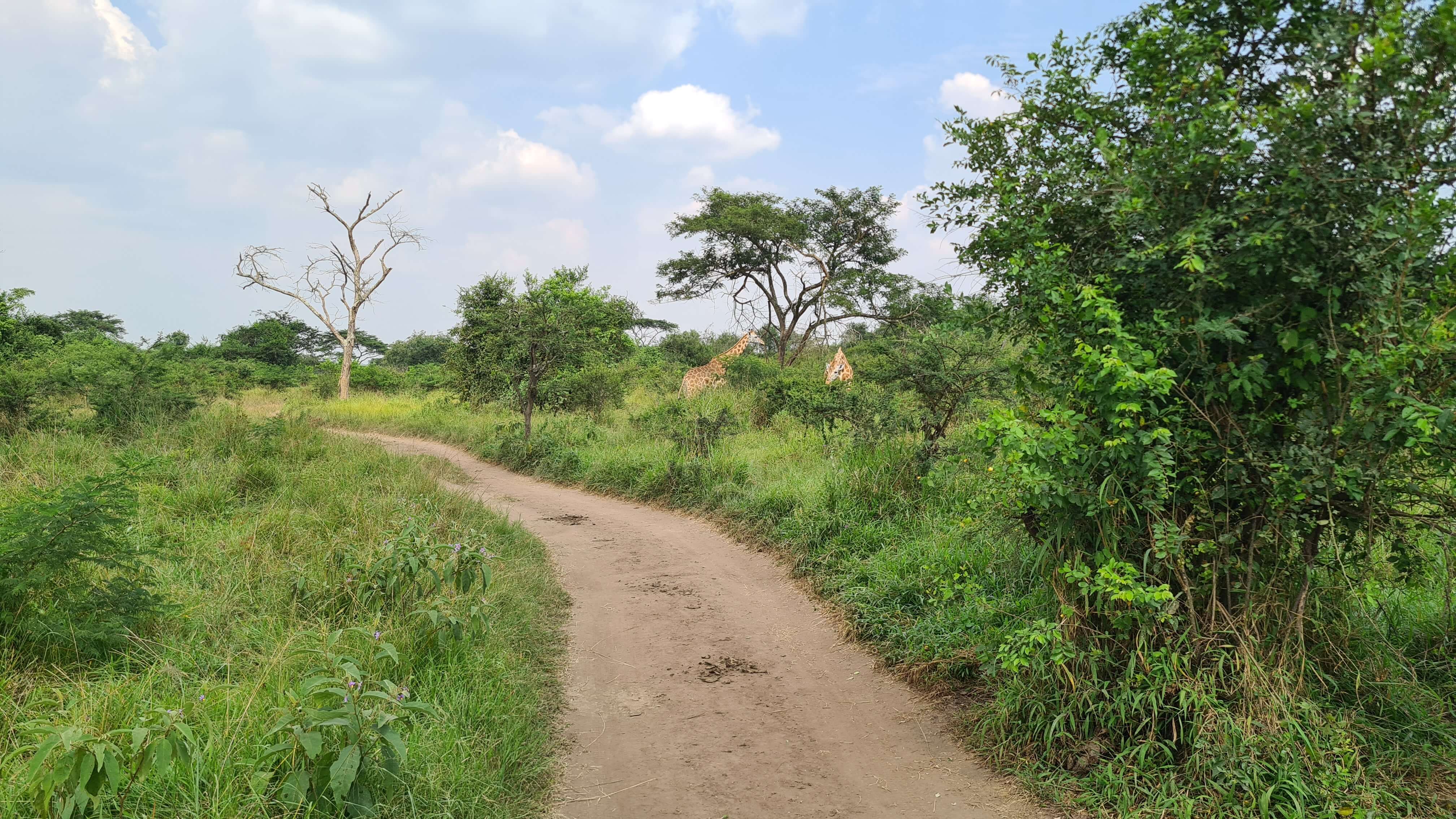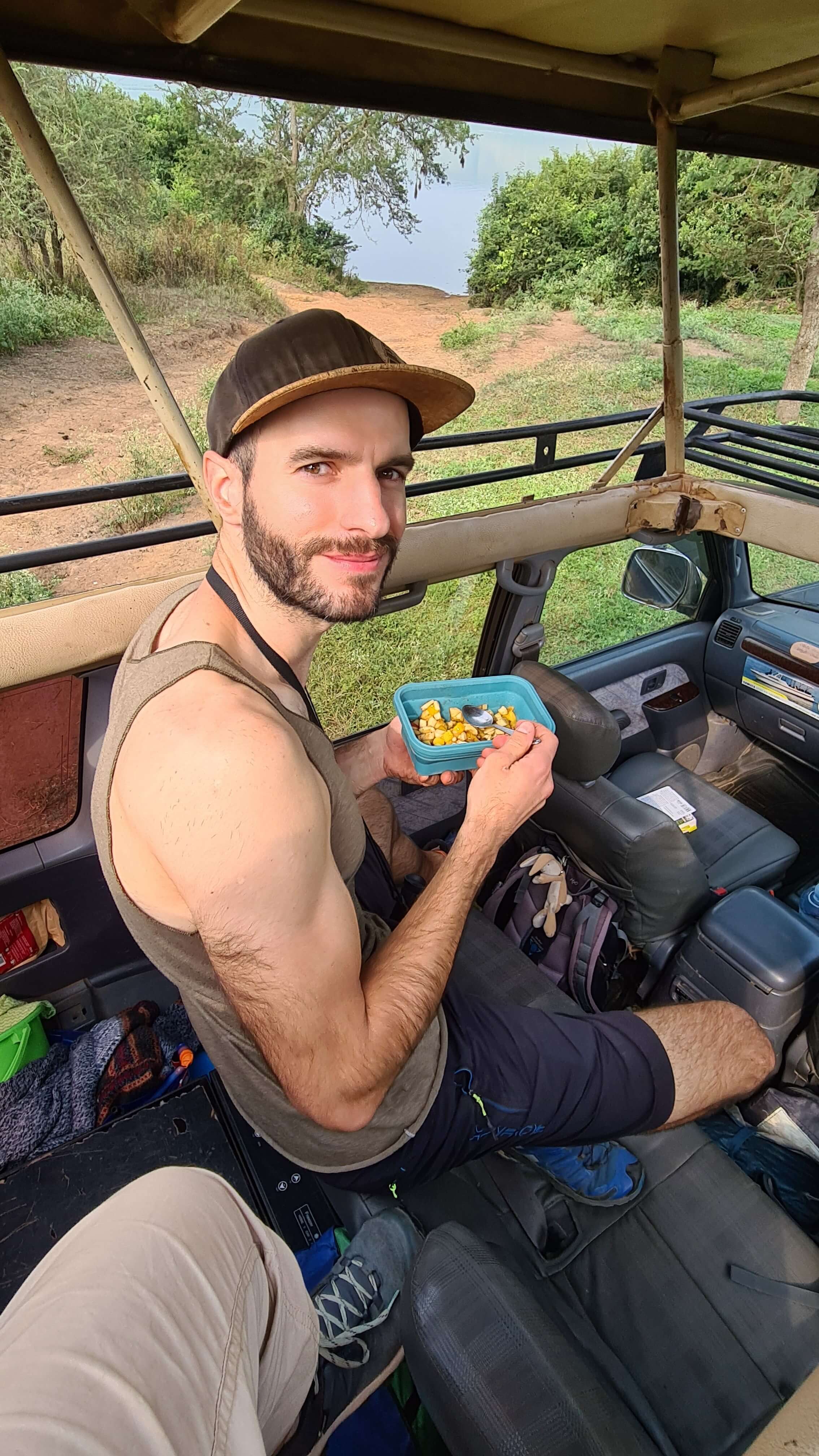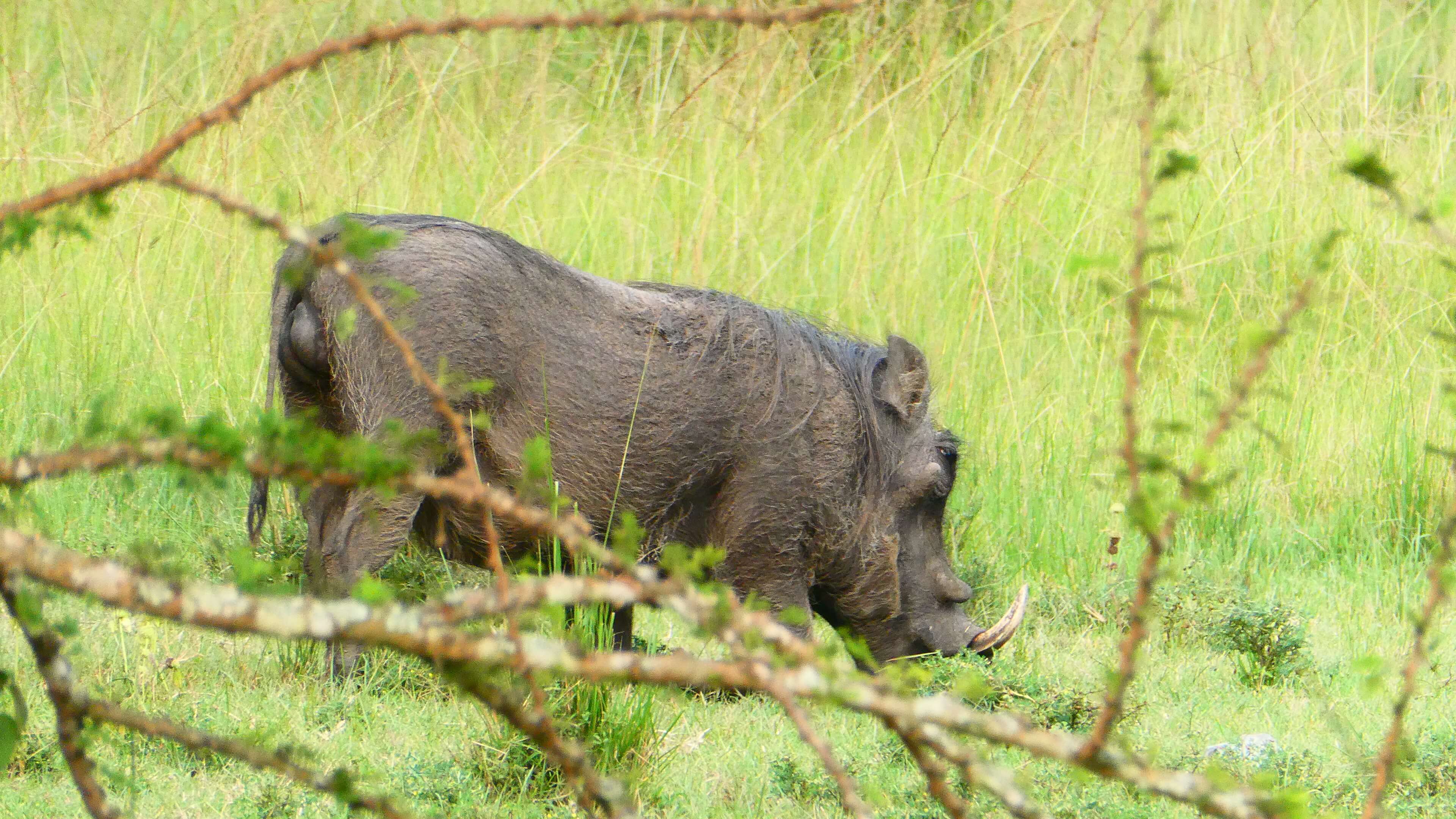 Gerne würden wir näher an den See, um die Nilpferde, die wir hören, auch zu sehen. Aber das ist fast unmöglich und in Anbetracht des Krokodils, das wir von unserem Frühstücksspot aus ins Wasser spurten sehen, vielleicht doch nicht so wünschenswert.