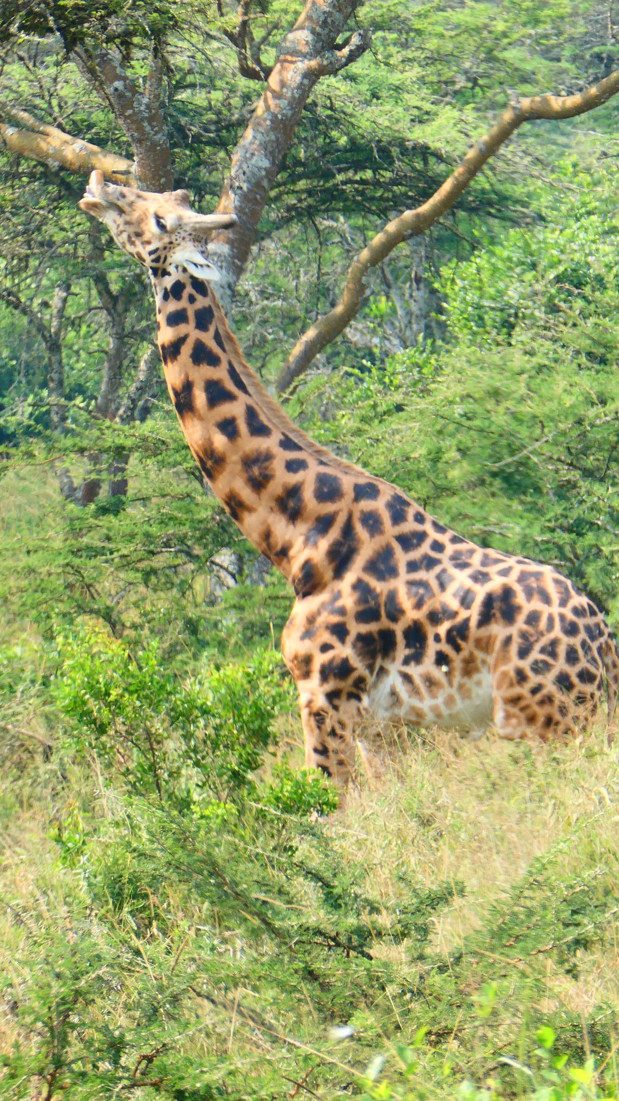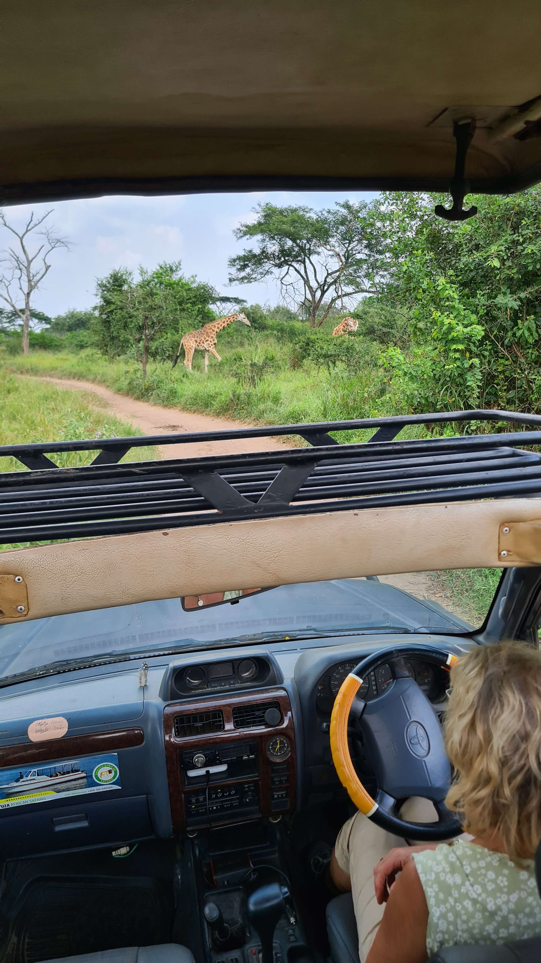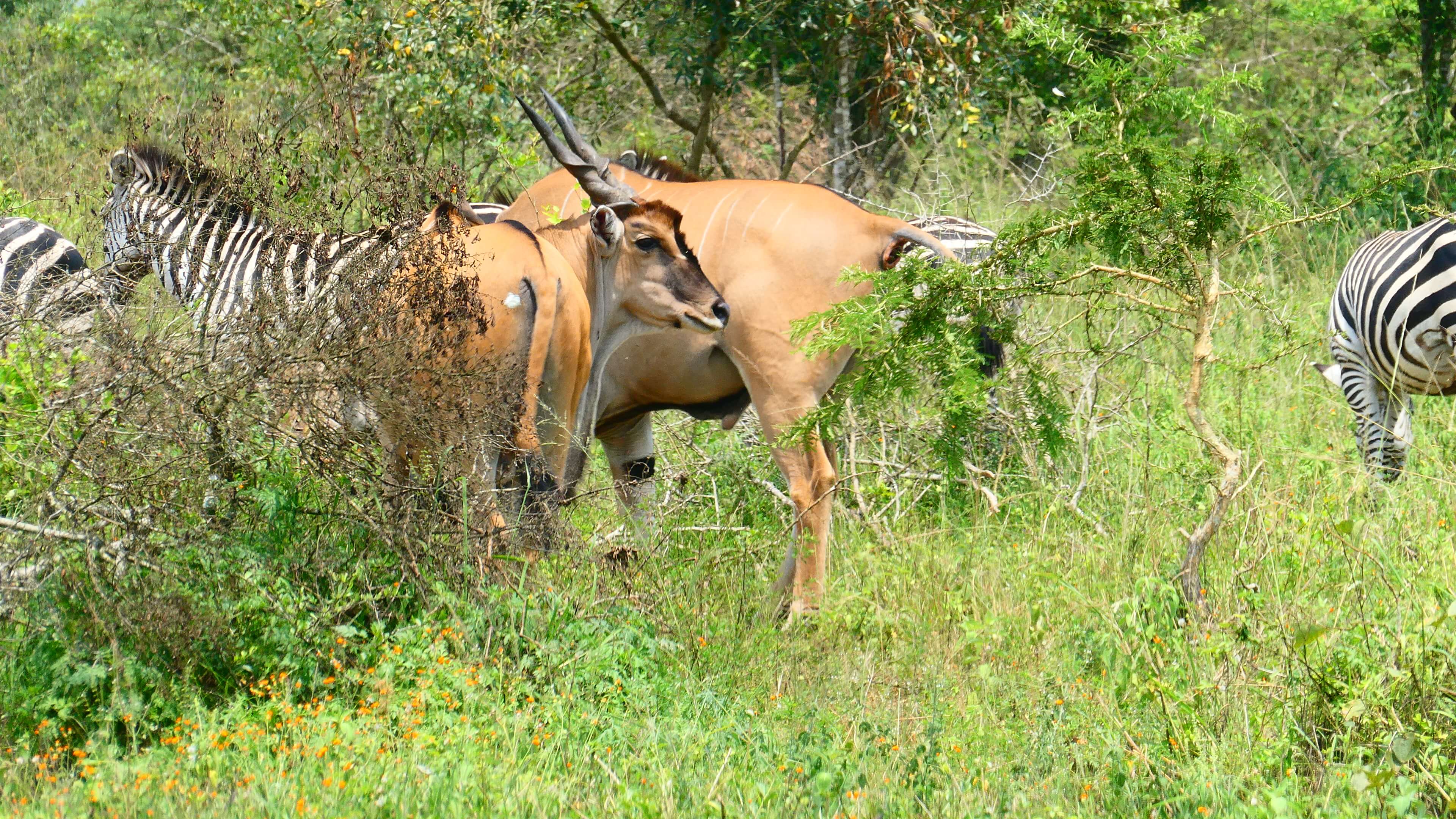Nach der Pause geht’s wieder rein in den Park und dort auf den Acacia-Track, der auf unserer Printkarte nicht vermerkt ist, aber sehr wohl auf maps.me. Abgesehen davon, dass der gewundene Track durch den lichten Akazienwald wunderschön ist, wird unsere Abenteuerlust auch besonders belohnt. Giraffen und Zebras stehen entspannt in nächster Nähe oder direkt vor uns auf dem Weg. Und Ober-Späher Matthias entdeckt doch tatsächlich im Dickicht auch mehrere der scheuen Eland-Antilopen.