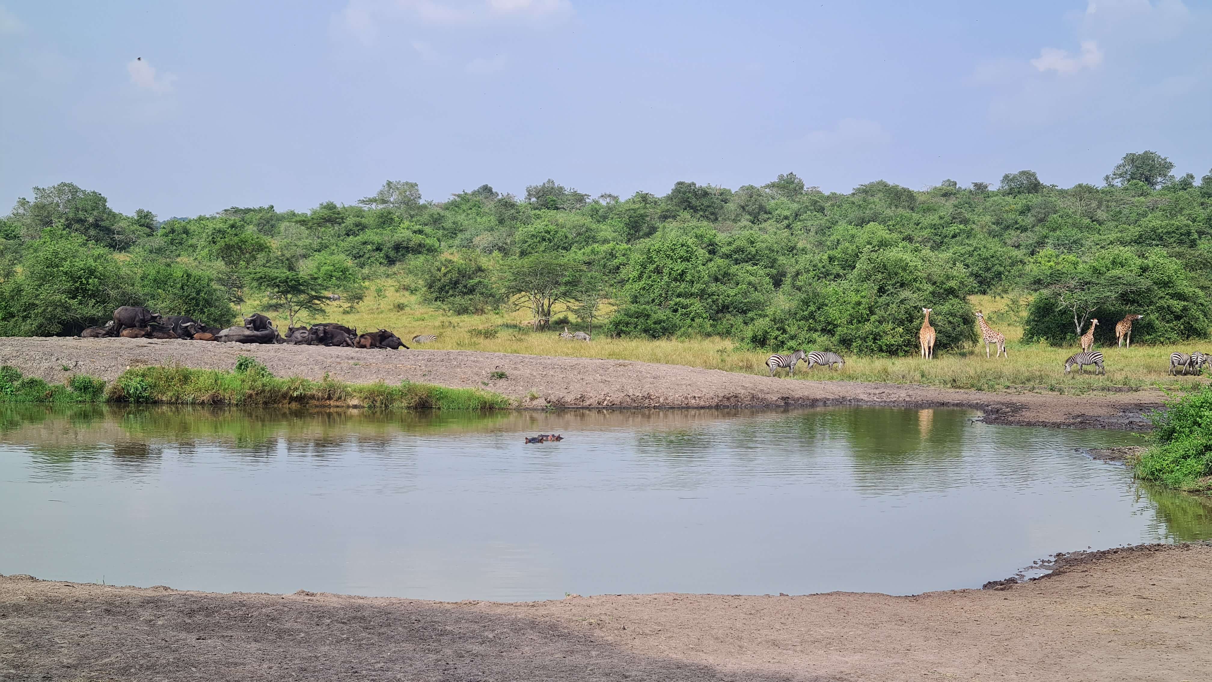 Ein weiteres animalisches Highlight erwartet uns dann aber noch an einem großen Wasserloch, wo uns ein Traumarrangement mit Zebras, Wasserbüffeln, Hippos, Impalas und Giraffen in den Bann zieht. Das ist nun echt der Hammer! Lange verweilen wir hier – mutterseelenallein mit der Natur – und genießen.