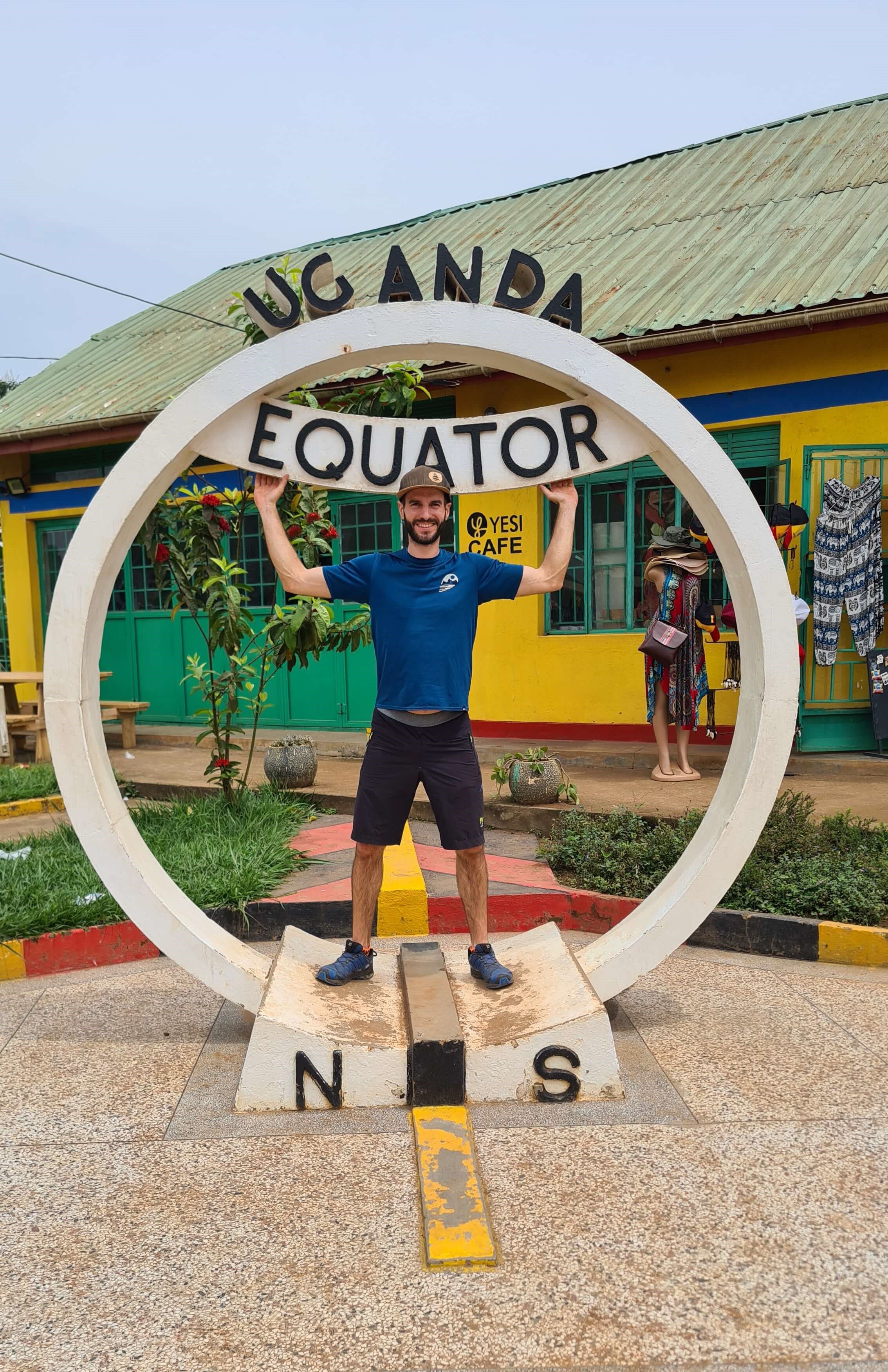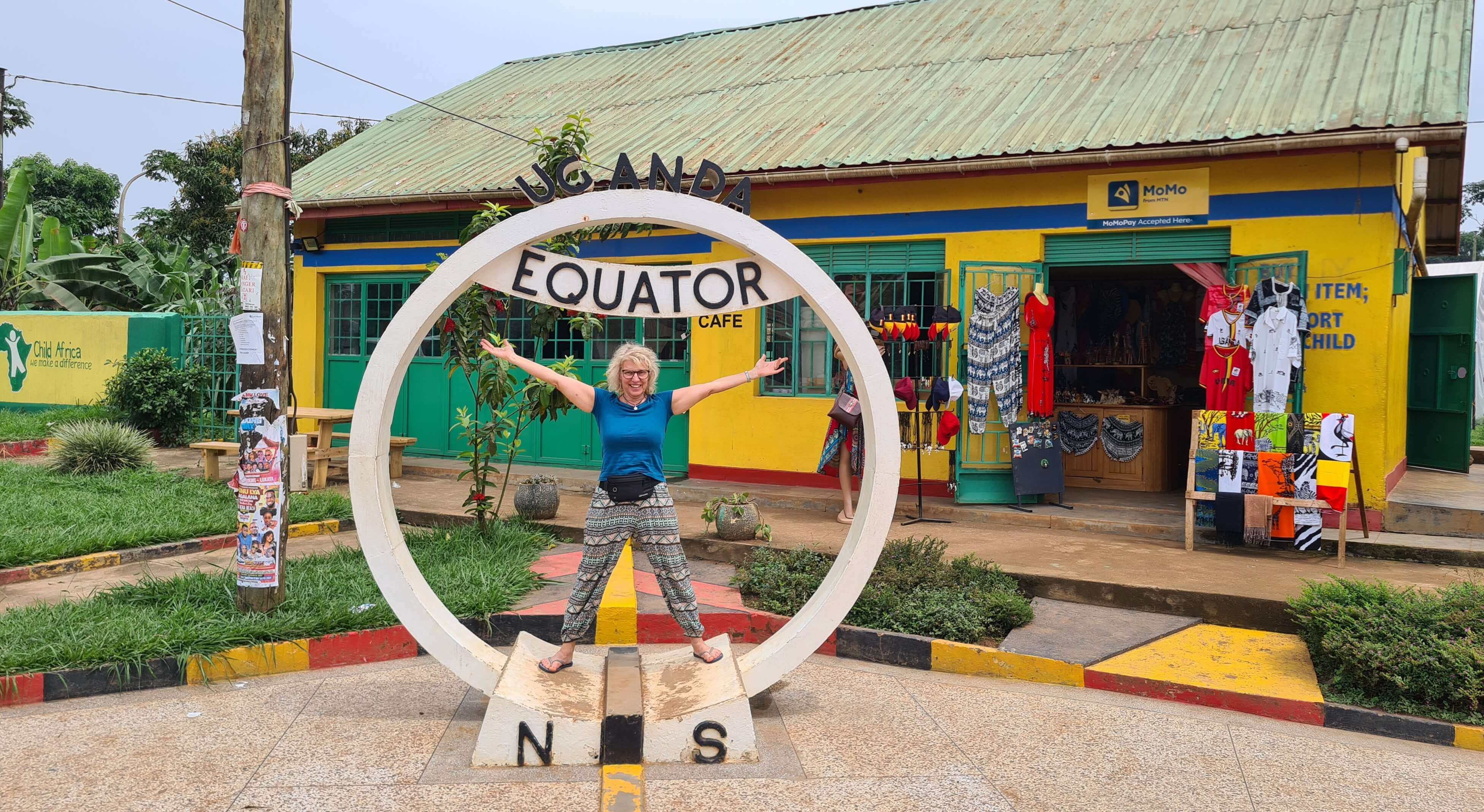 Wir kommen auf der asphaltierten Straße für ugandische Verhältnisse recht zügig voran. In Europa würden wir die Strecke von 245 km vermutlich in rund drei Stunden rocken, GoogleMaps veranschlagt in Uganda eine Fahrzeit von ca. 4,5 Stunden, aber Insider wissen, dass eher mit 6 Stunden zu rechnen ist. Gegen 13.30 Uhr erreichen wir den Equator Point. Klar, dass wir uns diesen Touristen-Fotospot nicht entgehen lassen. Und weil wir schon mal so günstig parken, stärken wir uns vor der Weiterfahrt in einem der Restaurants mit einer leckeren Pizza.