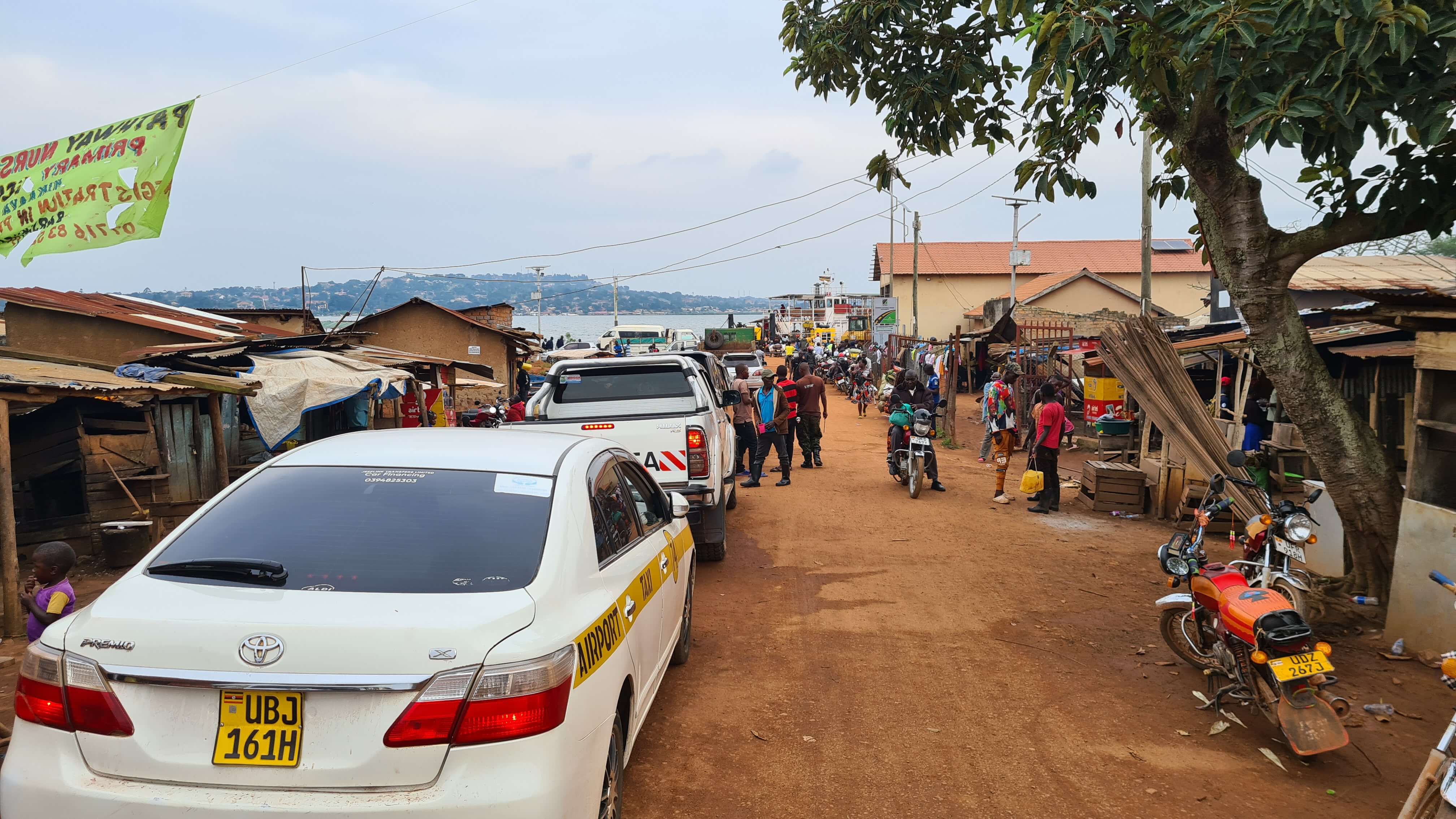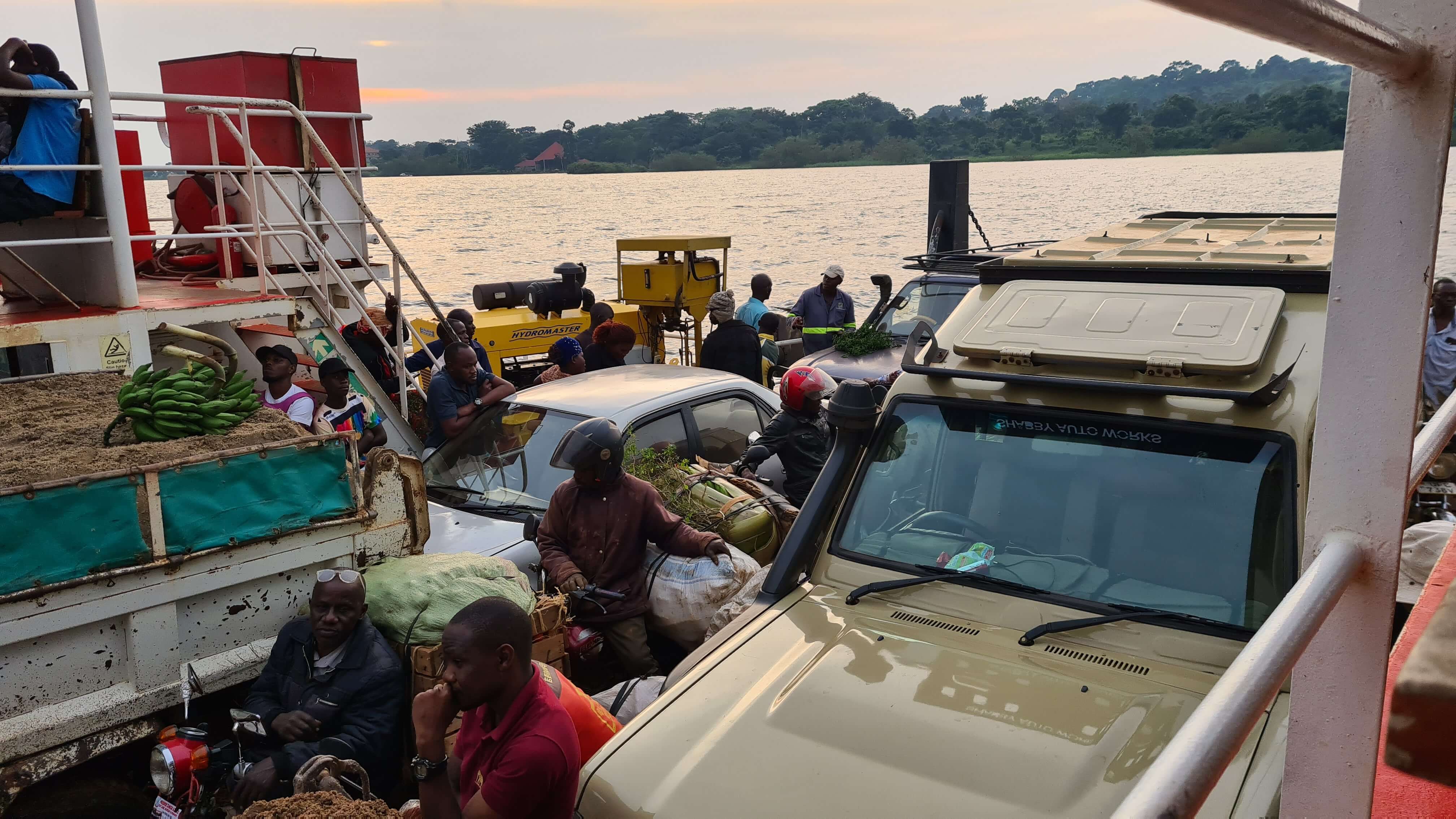 In den Randgebieten von Entebbe angekommen, halten wir Ausschau nach unserem Abzweig zur Autofähre. Diese spart – wie man hört – nämlich jede Menge Kilometer und Zeit. Wir haben nicht so wirklich einen Plan, wann die Fähre fährt und wie das Procedere ist – aber einen konkreten Plan haben die Fährbetreiber wohl auch nicht. Nach der Anfahrt über eine Lehmstraße stehen wir mit unserem Toyota Allrad gar nicht mal schlecht an Position 12 der Autoschlange für die nächste Fährabfahrt in gut einer Stunde um 18 Uhr. Interessiert beobachten wir das Gewirr rundum, das Kommen und Gehen von Menschen, die wendigen Boda-Bodas, Kinder, die uns foppen, Motorräder mit gackernder und grunzender Lebendladung …