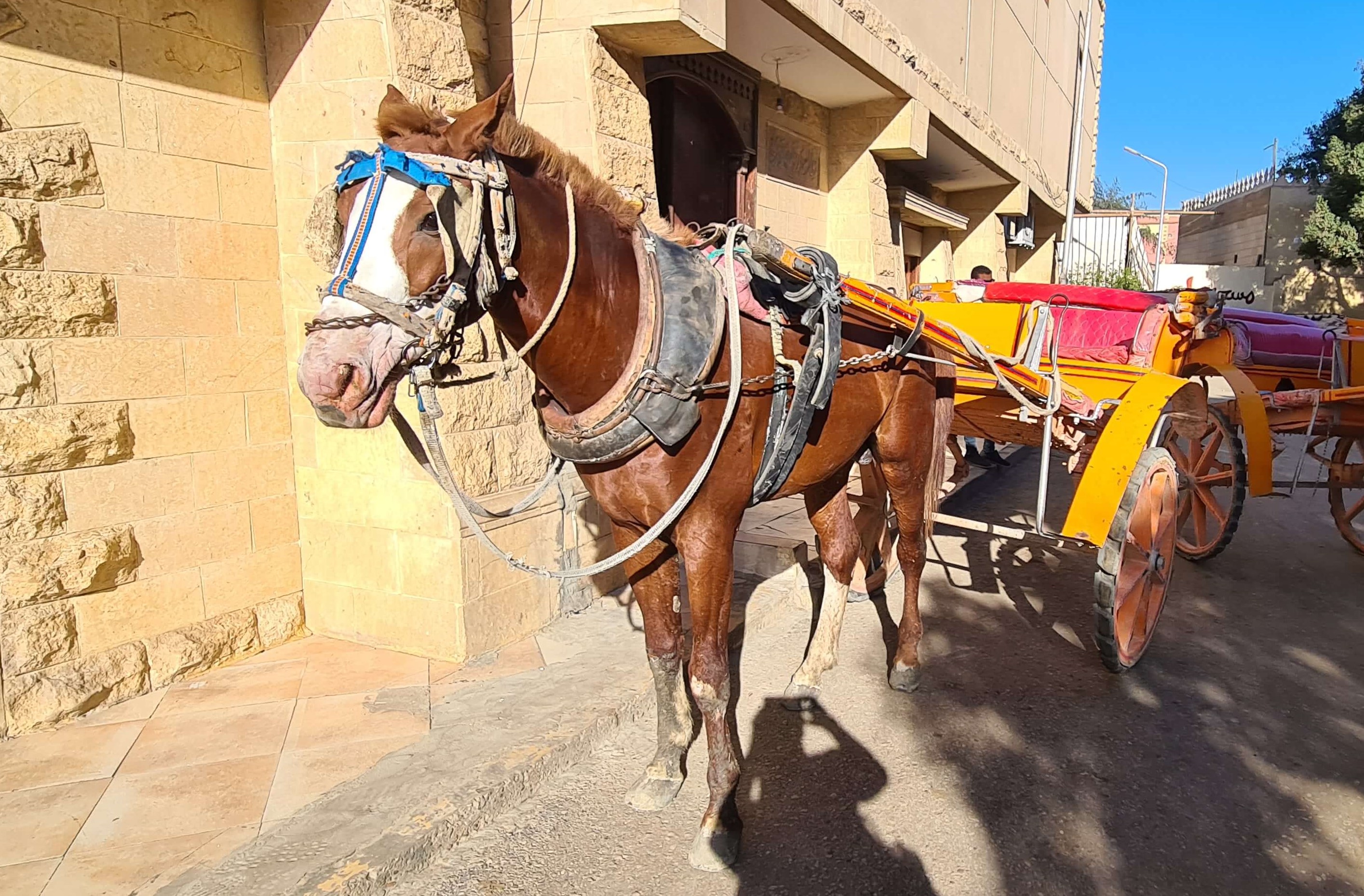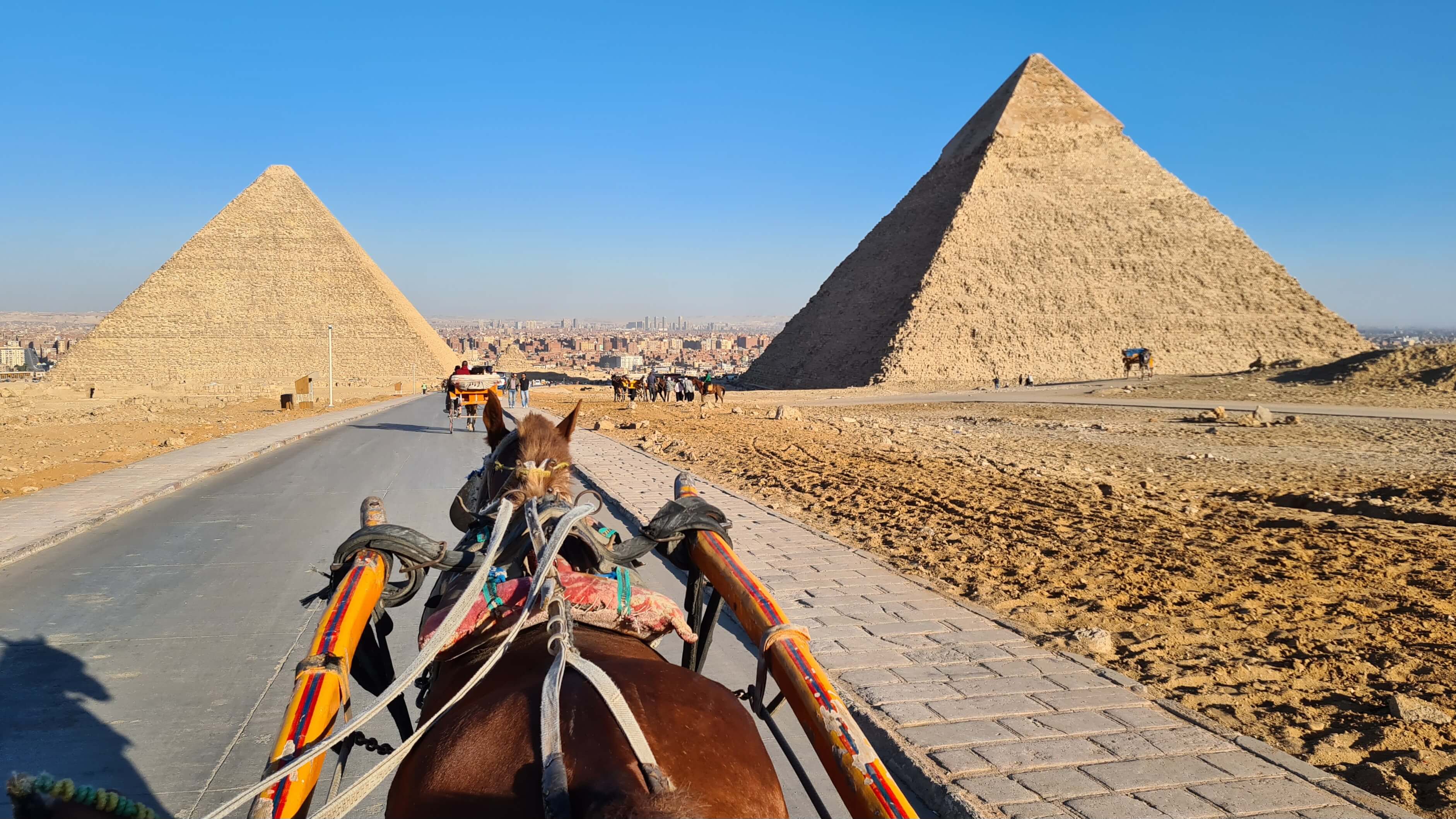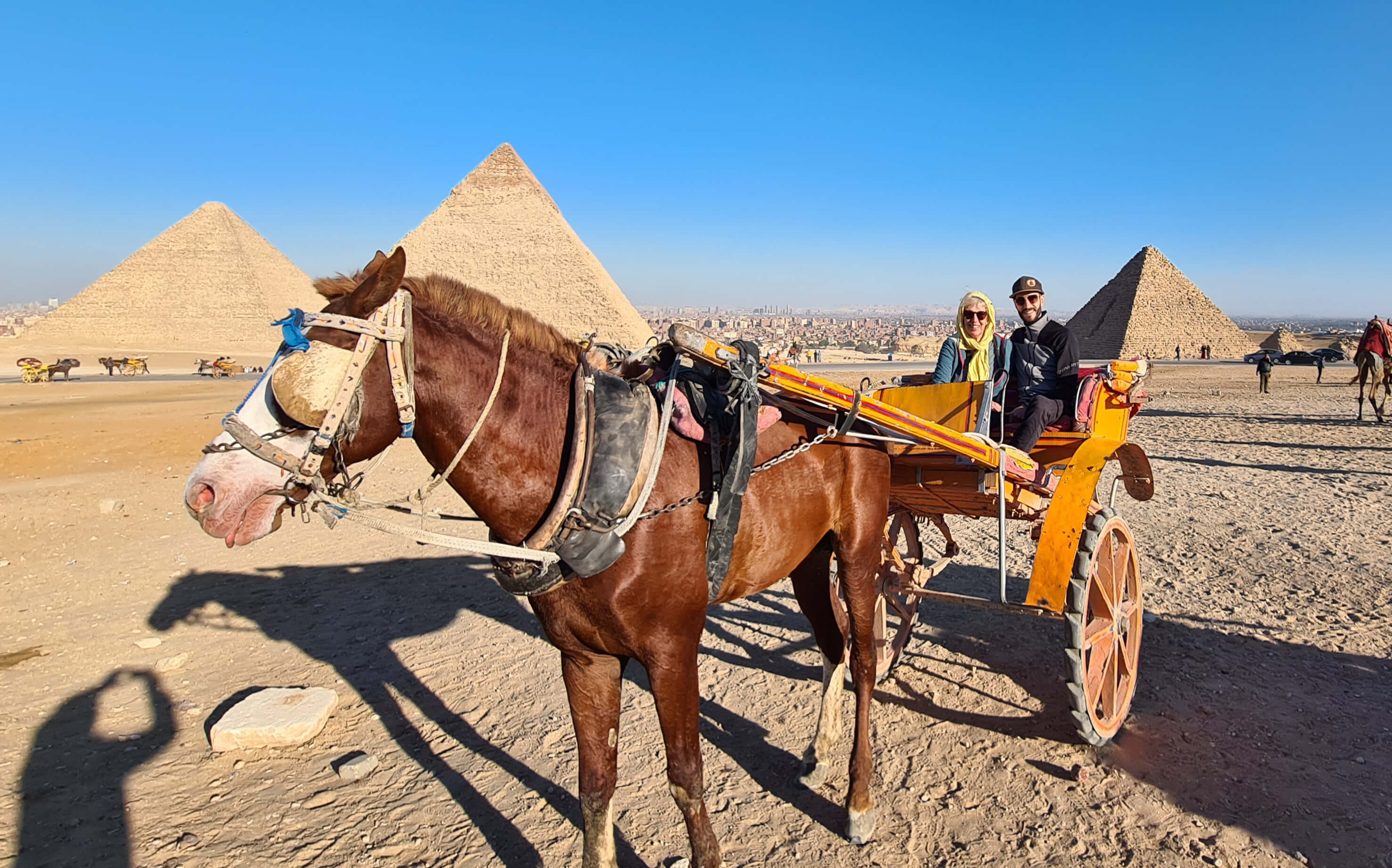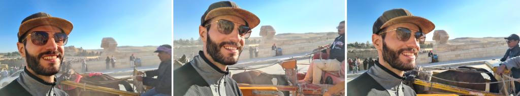 Schlussendlich einigen wir uns auf 30 $ für die Rikscha. Mit einem Affenzahn peitscht unser Sulky-Fahrer Pferd Rambo den Hügel hinauf – im Pulk mit gefühlt weiteren 50 Karren. Diese drei Shots wurden im Sekundenabstand geschossen (siehe Sphinx im Hintergrund) – derweil passieren uns sage und schreibe drei verschiedene Pferdekarren!!