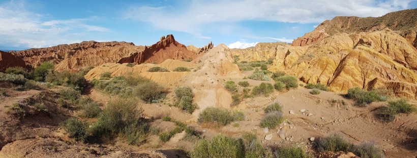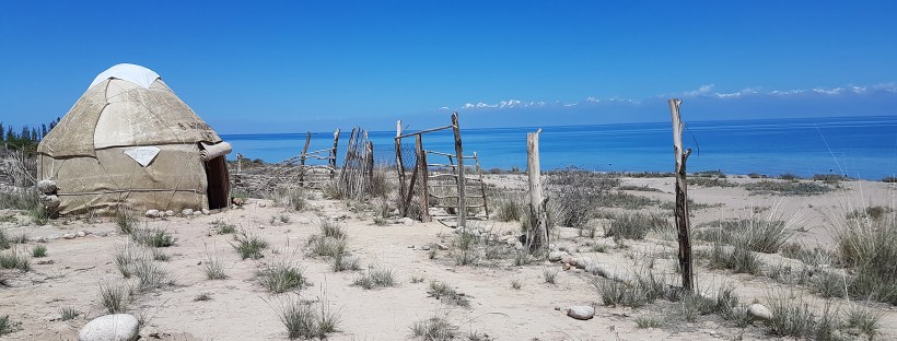 Vom schönen Yurt Camp Bel Tam bei Bokonbaevo ziehen wir mit unseren Backpacks weiter am Südufer des Issyk Kul entlang. Unser nächstes Ziel ist die ca. 40 km östlich gelegene kleine Ortschaft Tosor, wo wir uns wieder ein Homestay suchen wollen, um von dort aus ganz entspannt den märchenhaften Skazka Canyon zu besuchen. Eigentlich könnten uns die zwei mit Koffern im Mietwagen reisenden schwizer-dütschen Jungs auf ihrem Weg nach Karakol das kurze Stück mitnehmen. Aber die zwei Burschen überhören beim Frühstück geflissentlich unsere humorigen Andeutungen in dieser Richtung und stecken beim anschließenden Packen ihre Köpfe nur noch tiefer in ihren Luxus-Kofferraum.